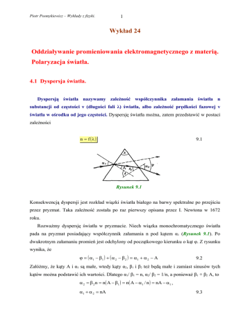 Piotr Posmykiewicz – Wykłady z fizyki. 1 Wykład 24 Oddziaływanie promieniowania elektromagnetycznego z materią. Polaryzacja światła. 4.1 Dyspersja światła. Dyspersją światła nazywamy zależność współczynnika załamania światła n substancji od częstości ν (długości fali λ) światła, albo zależność prędkości fazowej v światła w ośrodku od jego częstości. Dyspersję światła można, zatem przedstawić w postaci zależności n = f (λ) 9.1 Rysunek 9.1 Konsekwencją dyspersji jest rozkład wiązki światła białego na barwy spektralne po przejściu przez pryzmat. Taka zależność została po raz pierwszy opisana przez I. Newtona w 1672 roku. Rozważmy dyspersję światła w pryzmacie. Niech wiązka monochromatycznego światła pada na pryzmat posiadający współczynnik załamania n pod kątem α1 (Rysunek 9.1). Po dwukrotnym załamaniu promień jest odchylony od początkowego kierunku o kąt φ. Z rysunku wynika, że ϕ = ( α1 − β 1 ) + ( α 2 − β 2 ) = α 1 + α 2 − A 9.2 Załóżmy, że kąty A i α1 są małe, wtedy kąty α2, β1 i β2 też będą małe i zamiast sinusów tych kątów można podstawić ich wartości. Dlatego α1/ β1 = n, α2/ β2 = 1/n, a ponieważ β1 + β2 A, to α 2 = β 2 n = n ( A − β1 ) = n ( A − α1 / n ) = nA − α1 , α1 + α 2 = nA 9.3 Piotr Posmykiewicz – Wykłady z fizyki. 2 Z równań 9.2 i 9.3 wynika, że ϕ = A ( n − 1) , 9.4 tzn. kąt o jaki odchyla pryzmat promienie jest tym większy, im większy kąt łamiący pryzmatu A. Z równania 9.4 wynika, że kąt odchylenia promieni przez pryzmat zależy od (n – 1), ale n jest funkcją długości fali, dlatego promienie różnych długości fal, przechodząc przez pryzmat, będą odchylane o różne kąty, a to oznacza, że wiązka światła białego zostanie rozciągnięta w widmo, co właśnie, zaobserwował Newton. W ten sposób, za pomocą pryzmatu, jak i za pomocą siatki dyfrakcyjnej, rozkładając światło spektralnie można określić jego skład widmowy. Rozważmy różnice między widmami pochodzącymi od siatki dyfrakcyjnej i pryzmatu. 1. Siatka dyfrakcyjna rozkłada światło na określone długości fal, dlatego też mierząc kąty kolejnych maksimów można obliczyć te długość fali. Rozłożenie światła w widmo za pomocą pryzmatu odbywa się w zależności od wartości współczynników załamania, dlatego, aby obliczyć długość fali należy znać funkcję n = f(λ) (9.1). nm Rysunek 9.2 2. Składowe kolorów w widmie pochodzącym od siatki dyfrakcyjnej i pryzmatu rozkładają się różnie. Z rozważań z poprzedniego wykładu wynika, że dla siatki dyfrakcyjnej sinus kąta odchylenia promieni świetlnych jest proporcjonalny do długości fali. W związku z tym promienie czerwone, mające większą długość fali niż promienie fioletowe, odchylą się bardziej. Natomiast pryzmat rozkłada promienie w widmo w zależności od współczynnika załamania, który dla wszystkich ciał przezroczystych maleje wraz z długością fali (Rysunek 9.2). W związku z tym promienie czerwone, posiadające mniejszy współczynnik załamania niż promienie fioletowe, będą odchylane słabiej. Wielkość Piotr Posmykiewicz – Wykłady z fizyki. D= 3 dn , dλ zwana dyspersją materiału, wskazuje jak szybko zmienia się współczynnik załamania wraz z długością fali. Z rysunku 9.2 wynika, że współczynnik załamania światła n dla materiałów przezroczystych wzrasta monotonicznie wraz z maleniem długości fali λ; w związku z tym wartość bezwzględna dn/dλ również rośnie wraz z maleniem λ. Taką dyspersję nazywamy dyspersją normalną. Jak będzie wyjaśnione dalej, zależność krzywej n(λ) – krzywej dyspersji, w pobliżu linii lub pasm absorpcji, będzie inny, tzn. wraz ze zmniejszaniem się λ, będzie zmniejszał się współczynnik załamania światła. Ten rodzaj dyspersji nazywamy dyspersją anomalną. Na bazie zjawiska dyspersji normalnej oparta jest budowa spektrografów pryzmatycznych. Pomimo pewnych ich niedostatków podczas wyznaczania składu widmowego ciała (na przykład, konieczność kalibracji), spektrografy pryzmatyczne znajdują szerokie zastosowanie w analizie widmowej. Dzieje się tak dlatego, że przygotowanie pryzmatów dobrej jakości jest łatwiejsze od przygotowania dobrych siatek dyfrakcyjnych. Spektrografy pryzmatyczne dają też większe natężenie światła. 4.2 Elektronowa teoria dyspersji światła. Z makroskopowej teorii Maxwella wynika, że bezwzględny współczynnik załamania światła ośrodka n = εµ , gdzie ε – stała dielektryczna ośrodka, μ – przenikalność magnetyczna. Dla części optycznej widma µ ≈ 1 i dlatego n= ε . 9.5 Rysunek 9.3 Piotr Posmykiewicz – Wykłady z fizyki. 4 Z powyższego równania wyłania się pewna sprzeczność z doświadczeniem: wielkość n z jednej strony jest zmienna (Rysunek 9.3), z drugiej strony jest określona przez stałą ε. Oprócz tego, wielkości n otrzymane za pomocą tego wyrażenia nie zgadzają się z wartościami otrzymywanymi eksperymentalnie. Te trudności powstające na gruncie teorii Maxwella można wyjaśnić za pomocą teorii dyspersji Lorentza. W teorii Lorentza dyspersja światła jest traktowana jako wynik wzajemnego oddziaływania fal elektromagnetycznych z naładowanymi cząsteczkami, z których składa się ośrodek, i które wykonują drgania wymuszone w zmiennym polu fal elektromagnetycznych. Rozpatrzmy teorię elektronową dyspersji w przypadku jednorodnego dielektryka. Załóżmy, że dyspersja światła jest konsekwencją zależności ε od częstości ω fal świetlnych. Jak było pokazane na jednym z wcześniejszych wykładów przenikalność elektryczna ośrodka jest równa ε = 1 + κ = 1 + P /( ε 0E) , gdzie κ – podatność dielektryczna ośrodka, ε0 – stała dielektryczna próżni, P- chwilowa wartość wektora polaryzacji. W związku z tym n 2 = 1 + P /( ε 0E ) , 9.6 zależy od P. W tym prz