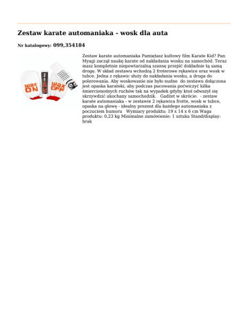 Zestaw karate automaniaka - wosk dla auta Nr katalogowy: 099,354184 Zestaw karate automaniaka Pamiętasz kultowy film Karate Kid? Pan Myagi zaczął naukę karate od nakładania wosku na samochód. Teraz masz kompletnie niepowtarzalną szansę przejść dokładnie tą samą drogę. W skład zestawu wchodzą 2 froterowe rękawice oraz wosk w tubce. Jedna z rękawic służy do nakładania wosku, a druga do polerowania. Aby woskowanie nie było nudne do zestawu dołączona jest opaska karateki, aby podczas pucowania poćwiczyć kilka śmiercionośnych ruchów tak na wypadek gdyby ktoś odważył się skrzywdzić ukochany samochodzik. Gadżet w skrócie: - zestaw karate automaniaka - w zestawie 2 rękawica frotte, wosk w tubce, opaska na głowę - idealny prezent dla każdego automaniaka z poczuciem humoru Wymiary produktu: 19 x 14 x 6 cm Waga produktu: 0,23 kg Minimalne zamówienie: 1 sztuka Stand/display: brak