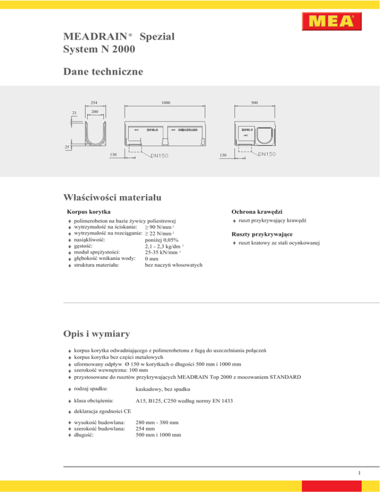 MEADRAIN® Spezial System N 2000 Dane techniczne Opis i wymiary