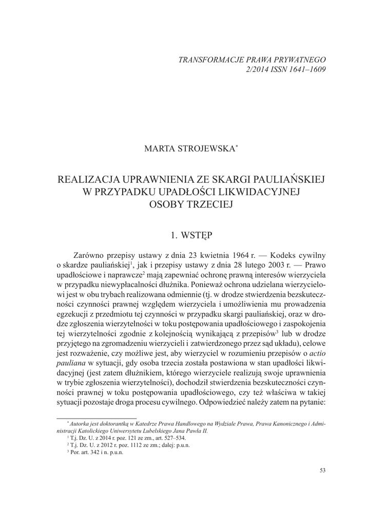 Transformacje Prawa Prywatnego 2/2014 ISSN 1641–1609 Marta Strojewska* Realizacja uprawnienia ze skargi pauliańskiej w przypadku upadłości likwidacyjnej osoby trzeciej 1. Wstęp Zarówno przepisy ustawy z dnia 23 kwietnia 1964 r. — Kodeks cywilny o skardze pauliańskiej, jak i przepisy ustawy z dnia 28 lutego 2003 r. — Prawo upadłościowe i naprawcze mają zapewniać ochronę prawną interesów wierzyciela w przypadku niewypłacalności dłużnika. Ponieważ ochrona udzielana wierzycielowi jest w obu trybach realizowana odmiennie (tj. w drodze stwierdzenia bezskuteczności czynności prawnej względem wierzyciela i umożliwienia mu prowadzenia egzekucji z przedmiotu tej czynności w przypadku skargi pauliańskiej, oraz w drodze zgłoszenia wierzytelności w toku postępowania upadłościowego i zaspokojenia tej wierzytelności zgodnie z kolejnością wynikającą z przepisów lub w drodze przyjętego na zgromadzeniu wierzycieli i zatwierdzonego przez sąd układu), celowe jest rozważenie, czy możliwe jest, aby wierzyciel w rozumieniu przepisów o actio pauliana w sytuacji, gdy osoba trzecia została postawiona w stan upadłości likwidacyjnej (jest zatem dłużnikiem, którego wierzyciele realizują swoje uprawnienia w trybie zgłoszenia wierzytelności), dochodził stwierdzenia bezskuteczności czynności prawnej w toku postępowania upadłościowego, czy też właściwa w takiej sytuacji pozostaje droga procesu cywilnego. Odpowiedzieć należy zatem na pytanie: * Autorka jest doktorantką w Katedrze Prawa Handlowego na Wydziale Prawa, Prawa Kanonicznego i Administracji Katolickiego Uniwersytetu Lubelskiego Jana Pawła II. T.j. Dz. U. z 2014 r. poz. 121 ze zm., art. 527–534. T.j. Dz. U. z 2012 r. poz. 1112 ze zm.; dalej: p.u.n. Por. art. 342 i n. p.u.n. 53 Transformacje Prawa Prywatnego 2/2014 w jakim trybie wierzyciel w rozumieniu art. 527 i n. k.c. może realizować swoje uprawnienie, jeżeli wobec osoby trzeciej, w rozumieniu wskazanych przepisów, zapadło postanowienie o ogłoszeniu upadłości obejmującej likwidację jej majątku? W tym celu konieczne jest przede wszystkim określenie pojęcia wierzytelności upadłościowej oraz charakteru prawnego uprawnienia ze skargi pauliańskiej, a następnie ustalenie, czy uprawnienie to można zakwalifikować jako wierzytelność upadłościową — omówienie tych zagadnień pozwoli na wskazanie trybu właściwego dla realizacji uprawnienia wierzyciela w przypadku upadłości osoby trzeciej. W dalszej kolejności wymagają rozważenia kwestie proceduralne związane z wytoczeniem powództwa na podstawie art. 527 i n. k.c. w sytuacji upadłości osoby trzeciej oraz ze zgłoszeniem skargi pauliańskiej jako wierzytelności w trybie art. 236 p.u.n. — odniesienie się we wskazanym zakresie do praktycznych aspektów realizacji uprawnienia ze skargi pauliańskiej wobec osoby trzeciej, znajdującej się w stanie upadłości likwidacyjnej, pozwoli na ocenę, z punktu widzenia praktyki, prawidłowości dokonanego wyboru trybu realizacji uprawnienia dokonanego w pierwszej części pracy. Ze względu na treść postawionego powyżej pytania — o tryb właściwy dla realizacji uprawnienia ze skargi pauliańskiej w przypadku upadłości likwidacyjnej osoby trzeciej — praktyczne aspekty związane z zaspokojeniem wierzyciela pauliańskiego z przedmiotu, który wszedł do masy upadłości, zostaną omówione tylko pobieżnie. Na wstępie, celem wyraźnego rozróżnienia obu reżimów ochrony interesów wierzycieli już u podstaw, zasadne jest wskazanie różnic w rozumieniu podstawowej przesłanki udzielenia ochrony w obu tych trybach, jaką jest niewypłacalność podmiotu. 2. Pojęcie niewypłacalności Należy zauważyć, że już podstawowa przesłanka warunkująca możliwość żądania ochrony, tj. niewypłacalność dłużnika, rozumiana jest odmiennie w przepisach o skardze pauliańskiej i w prawie upadłościowym. Różne są zatem i przesłanki warunkujące w obu przypadkach stwierdzenie istnienia stanu niewypłacalności. Dla uznania, że w danym stanie faktycznym występuje niewypłacalność dłużnika w rozumieniu przepisów o skardze pauliańskiej, konieczne jest ustalenie, że stan majątku dłużnika nie pozwoli na zaspokojenie w trybie przepisów ustawy z dnia 17 lis topada 1964 r. — Kodeks postępowania cywilnego o postępowaniu egzekucyjnym A. Rachwał: Niewypłacalność jako przesłanka zaskarżenia przez syndyka czynności prawnej upadłego, dokonanej z pokrzywdzeniem wierzycieli, Transformacje Prawa Prywatnego 2000, nr 3, s. 63 i n. T.j. Dz. U. z 2014 r. poz. 101 ze zm.; „Część trzecia — postępowanie egzekucyjne”. 54 Marta Strojewska: Realizacja uprawnienia ze skargi pauliańskiej w przypadku upadłości likwidacyjnej… przysługującej przeciwko niemu wierzytelności pieniężnej. W praktyce oznacza to, że dłużnik nie posiada majątku wystarczającego na zaspokojenie długu. Natomiast dla stwierdzenia istnienia stanu niewypłacalności w rozumieniu art. 10 p.u.n. wystarczające jest, aby podmiot nie regulował swoich wymagalnych zobowiązań pieniężnych (niezależnie od przyczyny tego stanu), a w przypadku osób prawnych oraz jednostek organizacyjnych nieposiadających osobowości prawnej, którym ustawa przyznaje zdolność prawną, aby wartość ich pasywów przekraczała wartość aktywów (nawet jeśli regulują one swoje zobowiązania). Zatem możliwe jest ogłoszenie upadłości podmiotu, który posiada wprawdzie nadwyżkę aktywów nad pasywami, jednak, z jakichkolwiek przyczyn (racjonalnych czy irracjonalnych), nie wypełnia swoich wymagalnych zobowiązań pieniężnych. Należy zatem podkreślić, że pojęcie „niewypłacalność” na gruncie przepisów o skardze pauliańskiej i przepisów prawa upadłościowego nie jest tożsame. Nierzadkie w praktyce mogą być sytuacje, gdy podmiot będzie niewypłacalny w rozumieniu przepisów prawa upadłościowego i naprawczego, podczas gdy n