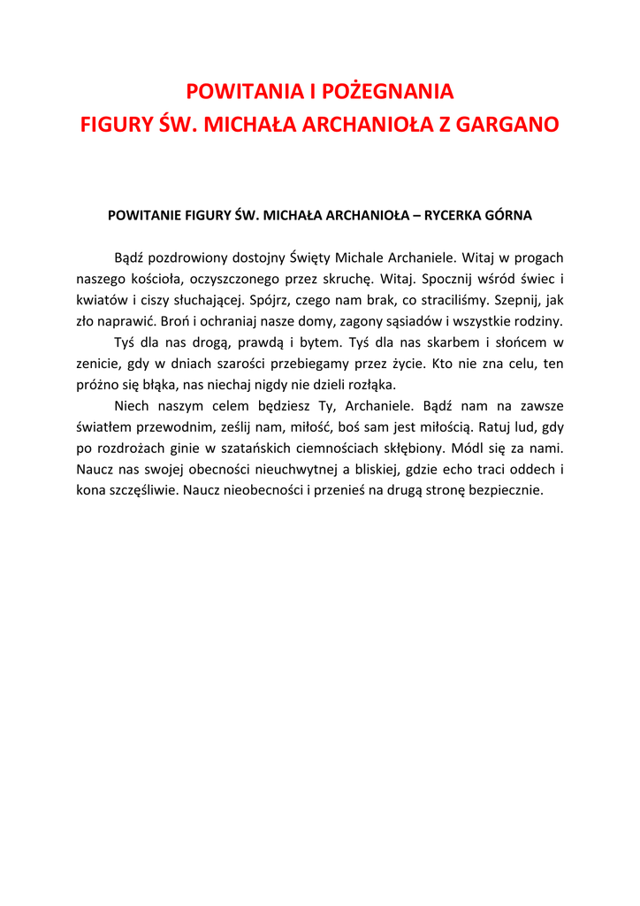 POWITANIA I POŻEGNANIA FIGURY ŚW. MICHAŁA ARCHANIOŁA Z GARGANO POWITANIE FIGURY ŚW. MICHAŁA ARCHANIOŁA – RYCERKA GÓRNA Bądź pozdrowiony dostojny Święty Michale Archaniele. Witaj w progach naszego kościoła, oczyszczonego przez skruchę. Witaj. Spocznij wśród świec i kwiatów i ciszy słuchającej. Spójrz, czego nam brak, co straciliśmy. Szepnij, jak zło naprawić. Broń i ochraniaj nasze domy, zagony sąsiadów i wszystkie rodziny. Tyś dla nas drogą, prawdą i bytem. Tyś dla nas skarbem i słońcem w zenicie, gdy w dniach szarości przebiegamy przez życie. Kto nie zna celu, ten próżno się błąka, nas niechaj nigdy nie dzieli rozłąka. Niech naszym celem będziesz Ty, Archaniele. Bądź nam na zawsze światłem przewodnim, ześlij nam, miłość, boś sam jest miłością. Ratuj lud, gdy po rozdrożach ginie w szatańskich ciemnościach skłębiony. Módl się za nami. Naucz nas swojej obecności nieuchwytnej a bliskiej, gdzie echo traci oddech i kona szczęśliwie. Naucz nieobecności i przenieś na drugą stronę bezpiecznie. POWITANIE KSIĘDZA PROBOSZCZA Z PEWLI MAŁEJ Święty Michale Archaniele! Jesteś już pośród nas. Oczekiwaliśmy i przygotowywaliśmy się na ten moment od dawna, poprzez comiesięczne katechezy, pielgrzymki, modlitwę, a w ostatnich dniach przez nowennę przed Najświętszym Sakramentem. Teraz możemy popatrzeć na Ciebie, na Twoje piękne oblicze i cieszyć się Twoją obecnością przez te trzy kolejne, święte dla nas dni. Wędrujesz po Polsce, wsłuchujesz się w to, co ludzie mają Ci do powiedzenia. Nie są Ci obce żadne ludzkie sprawy: radości i nadzieje, obawy i smutki, ale też nieszczęścia i tragedie. Tak, jak zapewne wszędzie, podobnie jest i u nas. Mamy za co Bogu dziękować, mamy czym się cieszyć, mamy za co wielbić naszego Boga i Stwórcę. Będziemy Ci o tym mówić w czasie spotkań modlitewnych. Nam też nie brakuje nam różnych kłopotów, problemów i zmartwień. Przychodzisz do nas pełen mocy i łaski. Wskazujesz na Boga jako źródło wszelkiego dobra, miłości, prawdy i piękna. Wiemy, że jeśli tylko nie zabraknie nam wiary możesz nam pomóc. Z nadzieją więc oczekują chorzy i starsi na spotkanie z Tobą, żeby Cię prosić o uzdrowienie i umocnienie w chorobie. Czekają mieszkańcy Dworzysk, byś uświęcił swoją obecnością świątynię, którą budujemy. Czeka młodzież i czekają dzieci, by podbiec pod Twoje skrzydła i otrzymać Twoje błogosławieństwo. Czekamy na uzdrowienie i uwolnienie nas od naszych słabości, zniewoleń, nałogów, depresji i zmartwień. Wiele osób pragnie przyjąć Twój szkaplerz jako ochronę przed pokusami i działaniem złego ducha. Chcemy wraz z Tobą, Święty Michale Archaniele podejść na mogiły naszych zmarłych i tam prosić, byś ich wprowadził do nieba, a nas pocieszył w tęsknocie za nimi. Jak widzisz, nasze oczekiwania są duże, ale Twoja moc jest o wiele większa. Cieszymy się że jesteś. Witamy Cię, Święty Michale Archaniele w Parafii Najświętszego Serca Pana Jezusa w Pewli Małej. Michael! Któż jak Bóg! POWITANIE DZIECI PEWEL ŚLEMIEŃSKA DZIECKO 1 Święty Michale Archaniele! Wspaniały dzieci, dorosłych Patronie! Gościmy Cię dzisiaj w naszym kościele, Składając przed Tobą swe małe dłonie. Przybywasz z mocą do naszej parafii I z tego się cieszą wszystkie dzieci, Wszak Tyś jest dla nas najlepszym obrońcą, Niechaj więc chwała i cześć Twa świeci. DZIECKO 2 Któż jak Bóg! - Imię Twoje, O tym każde dziecko wie. Pomagasz znosić trudy i znoje, Opieką swoją otocz mnie. Upraszaj łaski wszystkim dzieciom, Światłem Chrystusa znacz każdą z dróg. Niech w sercach naszych brzmią zawsze słowa: Bóg ponad wszystko! Któż jak Bóg! TARNOBRZEG DZIECI Najwspanialszy z Aniołów, Michale Archaniele, Jak dobrze, że jesteś dziś w naszym kościele, Jak dobrze Cię zobaczyć i Twych skrzydeł białych Móc dotknąć całkiem z bliska choć jednym palcem małym. Schyl się nisko nad nami, świętego nadstaw ucha, Jak najlepszy przyjaciel uważnie nas posłuchaj. Bo mnóstwo różnych pytań chcemy Ci dziś zadać, O wielu ważnych sprawach poważnie pogadać. O smutkach i kłopotach, a także o radości I o tym, jak się uczyć odwagi, cierpliwości. Jak żyć, by był z nas dumny nasz tatuś i mamusia I żeby Pan Bóg w niebie płakać przez nas nie musiał. POWITANIE - PRZEDSTAWICIELE PARAFII Św. Michale Archaniele! Książę Anielskich Zastępów! Z radością witamy Cię na Bemowie, w parafii Matki Bożej Królowej Aniołów. Dziękujemy, że przybyłeś do nas z tak daleka. Dziś stajemy przed Twym anielskim obliczem. Otocz opieką nasze rodziny, wspieraj nas w pokonywaniu trudów codziennego życia, osłaniaj chorych i samotnych. Błogosław dzieciom i chroń je od złego. Pomóż trwać w miłości i jedności. Wodzu Wojsk Niebieskich! Natchnij nas mądrością Ducha Św. , abyśmy pełni mocy i wiary z ufnością kroczyli po ścieżkach Pana głosząc jego chwałę. „Bóg ponad wszystko!” „Któż jak Bóg”. WARSZAWA – BEMOWO Święty Michale Archaniele, Książę Wojsk Niebieskich. Witamy Cię w naszej parafii Matki Bożej Królowej Aniołów na Bemowie. Nie mamy Ciebie wprawdzie w herbie dzielnicy, jak inni, ale dziękujemy że nawiedzasz nasze skromne progi. Pomóż rodzinom naszej parafii trwać w miłości i jedności. Osłaniaj chorych, starszych i samotnych. Błogosław dzieciom i broń je od złego. Zachowaj w nas ducha wrażliwości i gościnności. Chroń nas od pożarów, wypadków i wszelkich nieszczęść. Bądź strażnikiem naszych decyzji, byśmy szukali dobra wspólnego, kierowali się Dekalogiem i byli wierni Bogu, Kościołowi i Ojczyźnie w myśl Twego zawołania „Któż jak Bóg”. Święty Michale Archaniele, Książę Wojsk Niebieskich! Dziś witając Ciebie chcemy Ci powiedzieć: potrzebujemy Ciebie. Potrzebujemy Twojego wstawiennictwa, Twojej obecności. Znasz nasze 