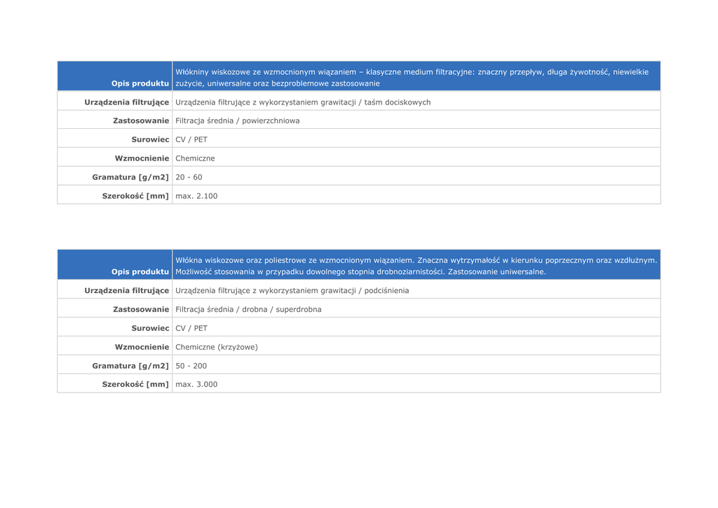 Włókniny wiskozowe ze wzmocnionym wiązaniem – klasyczne medium filtracyjne: znaczny przepływ, długa żywotność, niewielkie Opis produktu zużycie, uniwersalne oraz bezproblemowe zastosowanie Urządzenia filtrujące Urządzenia filtrujące z wykorzystaniem grawitacji / taśm dociskowych Zastosowanie Filtracja średnia / powierzchniowa Surowiec CV / PET Wzmocnienie Chemiczne Gramatura [g/m2] 20 - 60 Szerokość [mm] max. 2.100 Włókna wiskozowe oraz poliestrowe ze wzmocnionym wiązaniem. Znaczna wytrzymałość w kierunku poprzecznym oraz wzdłużnym. Opis produktu Możliwość stosowania w przypadku dowolnego stopnia drobnoziarnistości. Zastosowanie uniwersalne. Urządzenia filtrujące Urządzenia filtrujące z wykorzystaniem grawitacji / podciśnienia Zastosowanie Filtracja średnia / drobna / superdrobna Surowiec CV / PET Wzmocnienie Chemiczne (krzyżowe) Gramatura [g/m2] 50 - 200 Szerokość [mm] max. 3.000 Poliester / polipropylen. Włóknina igłowa mechanicznie utwardzona o znacznej wytrzymałości chemicznej. Głębokie media Opis produktu filtracyjne o znacznej chłonności. Dla dowolnego urządzenia filtrującego Filtracja superdrobna Urządzenia filtrujące Filtracja głęboka Zastosowanie Filtracja średnia / drobna / superdrobna Surowiec PET / PP Mechaniczne igłowane, Wzmocnienie Termiczne Gramatura[g/m2] 60-400 Szerokość [mm] Max. 3.200 Termicznie wiązany poliester, polipropylen, włóknina otrzymywana metodą „spod filiery”. Znaczna wytrzymałość w kierunku Opis produktu poprzecznym oraz wzdłużnym. Zastosowanie uniwersalne. Urządzenia filtrujące Urządzenia filtrujące podciśnieniowe oraz próżniowe Zastosowanie Filtracja powierzchowna / średnia Surowiec PET / PP Wzmocnienie Termiczne, włókienne Gramatura [g/m2] 16 - 300 max. 3.200 PP Szerokość [mm] max. 2.150 PET Poliester/Polipropylen. Termicznie wiązany materiał włókninowy, przeznaczony do kwasów, ługu, twardej wody, środków o Opis produktu wysokiej lepkości. Dzięki otwartej porowatości przeznaczony szczególnie dla olei mineralnych. Urządzenia filtrujące Urządzenia filtrujące z wykorzystaniem grawitacji Zastosowanie Filtracja powierzchniowa / średnia Surowiec PET / PP / CV Wzmocnienie Termiczne Gramatura [g/m2] 16-100 Szerokość [mm] max. 2.100mm