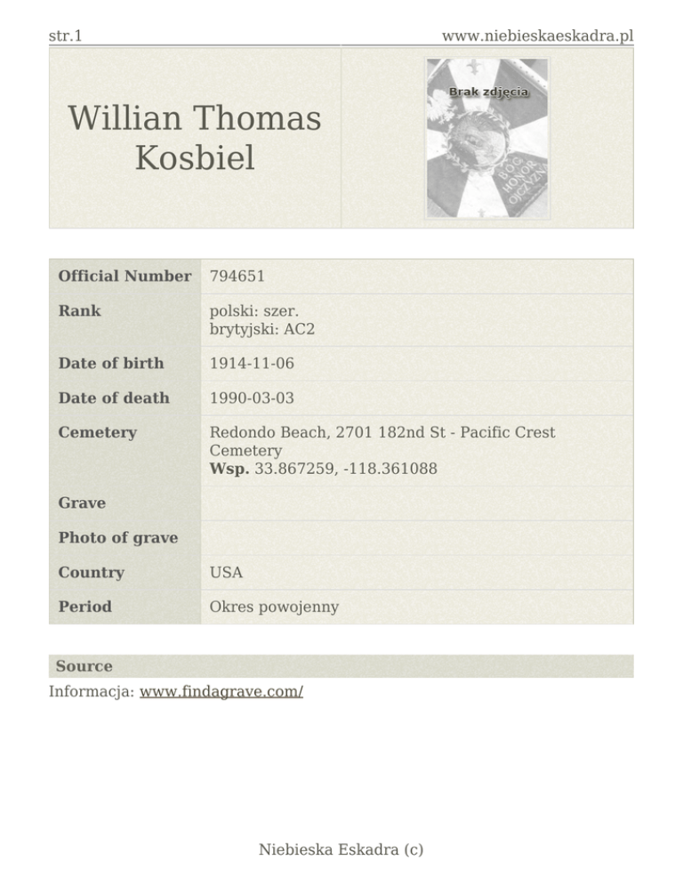 str.1 www.niebieskaeskadra.pl Willian Thomas Kosbiel Official Number 794651 Rank polski: szer. brytyjski: AC2 Date of birth 1914-11-06 Date of death 1990-03-03 Cemetery Redondo Beach, 2701 182nd St - Pacific Crest Cemetery Wsp. 33.867259, -118.361088 Grave Photo of grave Country USA Period Okres powojenny Source Informacja: www.findagrave.com/ Niebieska Eskadra (c)