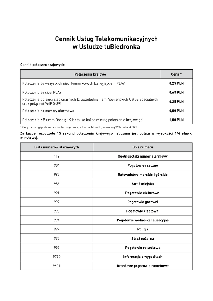 Cennik Usług Telekomunikacyjnych w Usłudze tuBiedronka Cennik połączeń krajowych: Połączenia krajowe Cena * Połączenia do wszystkich sieci komórkowych (za wyjątkiem PLAY) 0,25 PLN Połączenia do sieci PLAY 0,68 PLN Połączenia do sieci stacjonarnych (z uwzględnieniem Abonenckich Usług Specjalnych oraz połączeń VoIP 0-39) 0,25 PLN Połączenia na numery alarmowe 0,00 PLN Połączenie z Biurem Obsługi Klienta (za każdą minutę połączenia krajowego) 1,00 PLN * Ceny za usługi podane za minutę połączenia, w kwotach brutto, zawierają 22% podatek VAT. Za każde rozpoczęte 15 sekund połączenia krajowego naliczana jest opłata w wysokości 1/4 stawki minutowej. Lista numerów alarmowych Opis numeru 112 Ogólnopolski numer alarmowy 984 Pogotowie rzeczne 985 Ratownictwo morskie i górskie 986 Straż miejska 991 Pogotowie elektrowni 992 Pogotowie gazowni 993 Pogotowie ciepłowni 994 Pogotowie wodno-kanalizacyjne 997 Policja 998 Straż pożarna 999 Pogotowie ratunkowe 9790 Informacja o wypadkach 9901 Branżowe pogotowie ratunkowe Cennik połączeń międzynarodowych: Połączenia międzynarodowe Cena * Połączenia do STREFY 1 1,70 PLN Połączenia do STREFY 2 2,18 PLN Połączenia do STREFY 3 4,14 PLN Połączenia do sieci satelitarnych 10,74 PLN * Ceny za usługi podane za minutę połączenia, w kwotach brutto, zawierają 22% podatek VAT. Wybrany numer należy poprzedzić prefiksem „+” lub „00” lub „000”. Lista krajów i stref: STREFA 1 Albania, Andora, Austria, Belgia, Białoruś, Bośnia i Hercegowina, Bułgaria, Chorwacja, Cypr, Czarnogóra, Czechy, Dania, Estonia, Finlandia, Francja, Gibraltar, Grecja, Hiszpania, Holandia, Irlandia, Islandia, Lichtenstein, Litwa, Luksemburg, Łotwa, Macedonia, Malta, Mołdawia, Monako, Niemcy, Norwegia, Portugalia, Rosja, Rumunia, San Marino, Serbia, Słowacja, Słowenia, Szwajcaria, Szwecja, Ukraina, Watykan, Węgry, Wielka Brytania, Włochy, Wyspy Owcze STREFA 2 Algieria, Armenia, Australia, Azerbejdżan, Egipt, Gruzja, Izrael, Kanada, Kazachstan, Kirgizja, Maroko, Nowa Zelandia, Tadżykistan, Tunezja, Turcja, USA, Uzbekistan STREFA 3 Pozostałe kraje Lista sieci satelitarnych Emsat, Inmarsat, Iridium, Thuraya SMS-y - wybrany numer należy poprzedzić prefiksem „+”. Opłaty za połączenia międzynarodowe naliczane są za każdą rozpoczętą minutę. Połączenia międzynarodowe do niektórych krajów mogą być ograniczone. Cennik usługi SMS: Usługi SMS Cena * SMS do wszystkich sieci komórkowych (za wyjątkiem PLAY) ** 0,13 PLN SMS do sieci PLAY ** 0,13 PLN SMS na krajowe numery sieci stacjonarnych 1,00 PLN SMS międzynarodowy 0,61 PLN * Ceny za usługi podane w kwotach brutto, zawierają 22% podatek VAT. ** Dotyczy wysłania na terenie Polski wiadomości tekstowej SMS na numer krajowy sieci komórkowej. SMS na wybrany numer międzynarodowy należy poprzedzić prefiksem „+”. Możliwość wysyłania wiadomości SMS do niektórych krajów może być ograniczona. Pojedyncza wiadomość tekstowa SMS składa się z maksymalnie 160 znaków. Wykorzystywany aparat telefoniczny oraz elementy graficzne i specjalne mogą zmniejszać maksymalną liczbę znaków dostępną w jednym SMS-ie, tzn. jeden SMS może zawierać mniej niż 160 znaków. Do elementów specjalnych zalicza się litery charakterystyczne dla polskiego alfabetu (np. ą, ę, ł), znaki niewystępujące w alfabecie łacińskim, znaki narodowe. W przypadku przesyłania wiadomości zawierającej elementy specjalne, tekst pojedynczego SMS-a składa się z mniejszej liczby niż 160 znaków i może być dzielony na odpowiednią liczbę SMS-ów, z których każdy obciążany jest opłatą zgodnie z cennikiem. Cennik usługi MMS: Usługi MMS Cena * MMS do wszystkich sieci komórkowych** (za każde 100kB) 0,40 PLN MMS międzynarodowy (za każde 100kB) 2,44 PLN MMS pocztówka (za 300kB) 4,00 PLN * Ceny za usługi podane w kwotach brutto, zawierają 22% podatek VAT. ** Dotyczy wysłania na terenie Polski wiadomości tekstowej SMS na numer krajowy sieci komórkowej lub adres e-mail. MMS na wybrany numer międzynarodowy należy poprzedzić prefiksem „+”. Maksymalna wielkość pojedynczej wiadomości MMS (MMS w kraju, MMS międzynarodowy) wynosi 300 kB. W przypadku wysłania MMS-a w kraju lub MMS-a międzynarodowego o wielkości powyżej 100 kB zostanie pobrana opłata stanowiąca odpowiednią wielokrotność opłaty cennikowej. Opłaty za wysłanie wiadomości SMS lub MMS naliczane są niezależnie od tego, czy numer telefonu lub adres odbiorcy wiadomości oraz numer Centrum w przypadku SMS-ów (+48 602 951 111) zostały wpisane poprawnie. Jeśli Odbiorca nie odbierze wiadomości SMS lub MMS, będzie ona przechowywana przez czas, który nadawca określił jako termin jej ważności - maksymalnie 7 dni. Po tym terminie zostanie ona automatycznie wykasowana. Użytkownik Końcowy Usługi tuBiedronka będzie miał możliwość wysłania 20 bezpłatnych wizytówek o następującej treści: „Witaj, moj nowy numer tuBiedronka to +48xxxxxxxxx. Dodaj go do listy. Dziekuje.” Dla Użytkowników Usługi tuBiedronka będą dostępne następujące Kupony Elektroniczne: Nominał Elektronicznego Kuponu netto/brutto Wartość doładowania* Okres Czynny jaki zapewnia doładowanie Okres Bierny jaki zapewnia doładowanie 3,69 / 4,50 PLN 4,50 PLN 14 dni 30 dni 7,38 / 9,00 PLN 9,00 PLN 30 dni 30 dni 18,44 / 22,50 PLN 22,50 PLN 90 dni 30 dni Od 11.05.2009 dostępne będą nowe Kupony Elektroniczne: Nominał Elektronicznego Kuponu netto/brutto Wartość doładowania* Okres Czynny jaki zapewnia doładowanie Okres Bierny jaki zapewnia doładowanie 3,07 / 3,75 PLN 3,75 PLN 7 dni 30 dni 6,15 / 7,50 PLN 7,50 PLN 16 dni 30 dni 12,29 / 14,99 PLN 14,99 PLN 40 dni 30 dni * Ceny podane w kwotach brutto, zawierają 22% podatek VAT Użytkownik Końcowy może nabyć Elektroniczny Kupon wyłącznie w punktach sprzedaży JMD. Za doładowanie w punkcie sprzedaży JMD nie pobiera żadnych dodat