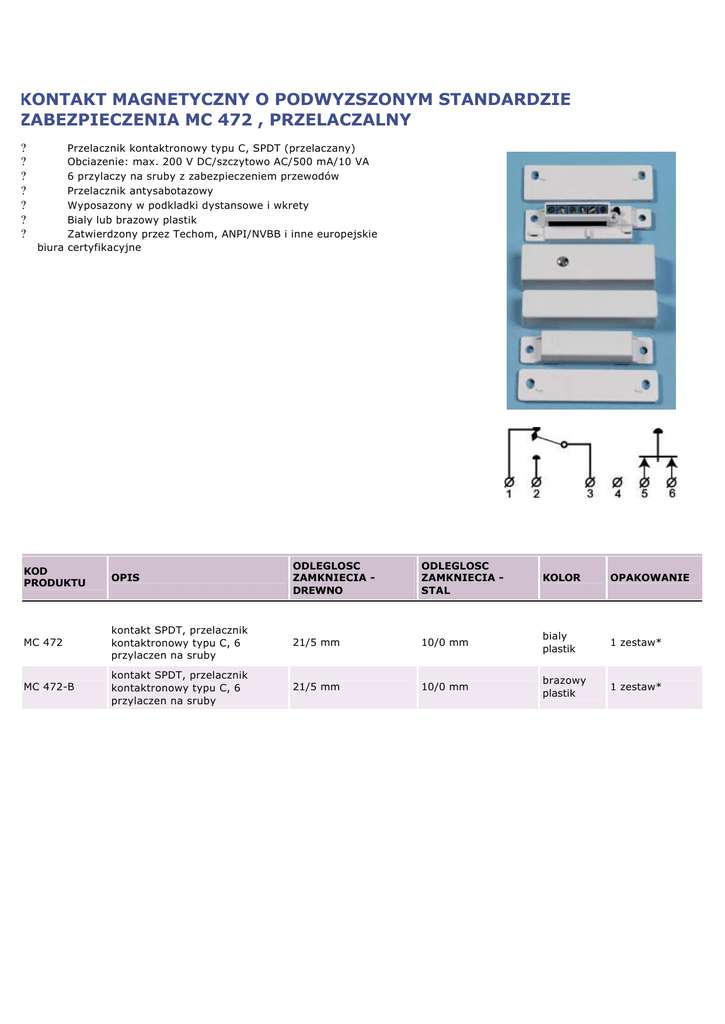 KONTAKT MAGNETYCZNY O PODWYZSZONYM STANDARDZIE ZABEZPIECZENIA MC 472 , PRZELACZALNY ? ? ? ? ? ? ? Przelacznik kontaktronowy typu C, SPDT (przelaczany) Obciazenie: max. 200 V DC/szczytowo AC/500 mA/10 VA 6 przylaczy na sruby z zabezpieczeniem przewodów Przelacznik antysabotazowy Wyposazony w podkladki dystansowe i wkrety Bialy lub brazowy plastik Zatwierdzony przez Techom, ANPI/NVBB i inne europejskie biura certyfikacyjne KOD PRODUKTU OPIS ODLEGLOSC ZAMKNIECIA DREWNO ODLEGLOSC ZAMKNIECIA STAL KOLOR OPAKOWANIE MC 472 kontakt SPDT, przelacznik kontaktronowy typu C, 6 przylaczen na sruby 21/5 mm 10/0 mm bialy plastik 1 zestaw* MC 472-B kontakt SPDT, przelacznik kontaktronowy typu C, 6 przylaczen na sruby 21/5 mm 10/0 mm brazowy plastik 1 zestaw*