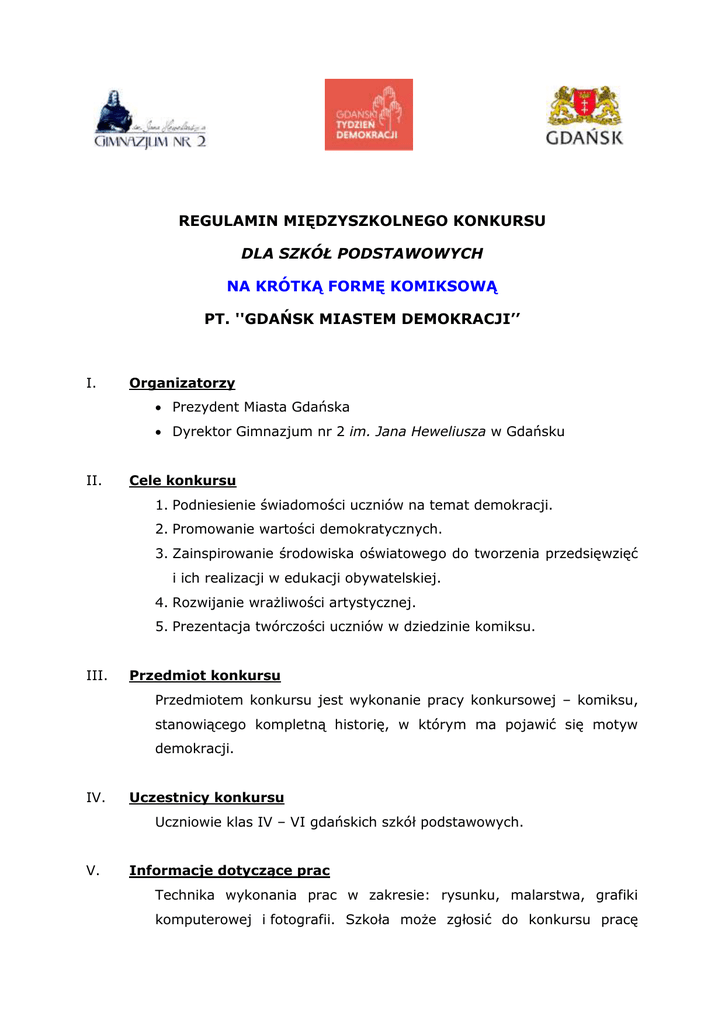 REGULAMIN MIĘDZYSZKOLNEGO KONKURSU DLA SZKÓŁ PODSTAWOWYCH NA KRÓTKĄ FORMĘ KOMIKSOWĄ PT. ''GDAŃSK MIASTEM DEMOKRACJI’’ I. Organizatorzy Prezydent Miasta Gdańska Dyrektor Gimnazjum nr 2 im. Jana Heweliusza w Gdańsku II. Cele konkursu 1. Podniesienie świadomości uczniów na temat demokracji. 2. Promowanie wartości demokratycznych. 3. Zainspirowanie środowiska oświatowego do tworzenia przedsięwzięć i ich realizacji w edukacji obywatelskiej. 4. Rozwijanie wrażliwości artystycznej. 5. Prezentacja twórczości uczniów w dziedzinie komiksu. III. Przedmiot konkursu Przedmiotem konkursu jest wykonanie pracy konkursowej – komiksu, stanowiącego kompletną historię, w którym ma pojawić się motyw demokracji. IV. Uczestnicy konkursu Uczniowie klas IV – VI gdańskich szkół podstawowych. V. Informacje dotyczące prac Technika wykonania prac w zakresie: rysunku, malarstwa, grafiki komputerowej i fotografii. Szkoła może zgłosić do konkursu pracę indywidualną lub zespołową – maksymalnie 2 osoby. Do pracy powinien być dołączony krótki konspekt tekstowy zawierający dodatkowy opis komiksu (bohatera, fabuły, świata itp.). Plansze wyłącznie w formacie A4. Na odwrocie każdej z plansz należy umieścić czytelny opis zawierający: tytuł pracy, numer strony oraz imię i nazwisko lub nazwę grupy, nazwę szkoły, imię i nazwisko nauczyciela opiekuna, adres szkoły, telefon kontaktowy. VI. VII. Kryteria oceny wartość merytoryczna, oryginalność prezentowanego materiału, wybór niekonwencjonalnych form artystycznego wyrazu, technika wykonanej pracy. Etapy konkursu/terminy ETAP I – złożenie przez szkołę akcesu przystąpienia do Konkursu, nadesłanie Karty zgłoszeniowej (wzór w załączeniu) w terminie do: 30 września 2016r. ETAP II – przesłanie prezentującego edukacyjne pracy realizowane związane konkursowej w szkole z demokracją – przedsięwzięcia w terminie 31 października 2016r. na adres: Gimnazjum nr 2 im. Jana Heweliusza ul. Kartuska 32/34 80 – 104 Gdańsk z dopiskiem: KONKURS „Gdańsk miastem demokracji” Kategoria KOMIKS komiksu do: Praca powinna być opatrzona „Kartą zgłoszeniową" oraz zawierać oświadczenie autora/współautora i zgodę rodziców/prawnych opiekunów dziecka (zgodnie ze wzorem). ETAP III – rozstrzygnięcie konkursu w terminie do: 30 listopada 2016r. VIII. Postanowienia końcowe zgłoszenie udziału w konkursie oznacza pełną i nieodwołalną akceptację niniejszego regulaminu, wyniki konkursu zostaną zamieszczone na stronie Miasta Gdańska oraz Gimnazjum nr 2 im. Jana internetowej Heweliusza w Gdańsku, organizatorzy przewidują nagrody rzeczowe dla zdobywcy I miejsca oraz dwa wyróżnienia, nagrody zostaną wręczone zwycięzcom podczas uroczystej Gali, która odbędzie się w Europejskim Centrum Solidarności w Gdańsku. O terminie Gali laureatów powiadomi organizator. III. Dane kontaktowe organizatora konkursu Gimnazjum nr 2 im. Jana Heweliusza ul. Kartuska 32/34 80 – 104 Gdańsk [email protected] tel. 58 302 22 09 Koordynator kategorii komiks: Małgorzata Wnuk Karta zgłoszeniowa Konkurs na krótką formę komiksową ''Gdańsk miastem demokracji’’ Autor/autorzy Imię, nazwisko/nazwa grupy Klasa Funkcje – rysownik, scenarzysta itp. (wypełnić w przypadku zespołu grupowego) Imię, nazwisko, nauczyciela koordynującego pracą konkursową adres e-mail i numer telefonu Tytuł komiksu Nazwa, adres szkoły miasto, kod, ulica tel. adres e – mail ............................................................. (data) ............................................................. (podpis) OŚWIADCZENIE Oświadczam, że jestem autorem/współautorem*) przesłanej pracy i wyrażam zgodę na jej nieodpłatne wykorzystanie przez organizatora. Materiał jest wolny od roszczeń prawnych i finansowych osób trzecich. Zgodnie z art.. 23 ustawy z dnia 29 sierpnia 1997 O Ochronie Danych Osobowych (Dz. U. 2016 r. poz. 922) wyrażam zgodę na przetwarzanie moich danych osobowych, zawartych w złożonych przeze mnie dokumentach dla potrzeb realizacji konkursu pt. „Gdańsk miastem demokracji” oraz do przetwarzania moich danych osobowych i mojej pracy w celach reklamowych organizatora nie związanych bezpośrednio z konkursem”. _________________________ podpis autora/współautora*) *) niepotrzebne skreślić W przypadku pracy zespołowej, każdy z współautorów wypełnia odrębne oświadczenie ZGODA RODZICÓW/ PRAWNYCH OPIEKUNÓW DZIECKA ……………………………………………………… imię i nazwisko dziecka …………. klasa …………………………………………………….. nazwa i adres szkoły OŚWIADCZENIE Oświadczam, że wyrażam zgodę na udział mojej córki/mojego syna w konkursie organizowanym przez Gimnazjum nr 2 im. Jana Heweliusza w Gdańsku. Znam i akceptuję zapisy regulaminu konkursu na krótką formę komiksową pt. ''Gdańsk miastem demokracji’’. W związku z powyższym wyrażam zgodę na publikowanie na stronie internetowej Urzędu Miasta Gdańska oraz Gimnazjum nr 2 im. Jana Heweliusza danych osobowych (imię/nazwisko) oraz wyników uzyskanych przez moją córkę/mojego syna w konkursie. ……….…………………….. (miejscowość, data) ……..….............................…………………………………………. (czytelnie imię i nazwisko rodzica/prawnego opiekuna) Podstawa prawna: Ustawa z dnia 29 sierpnia 1997 r. o ochronie danych osobowych (tekst jednolity: Dz. U. 2016r. poz. 922)