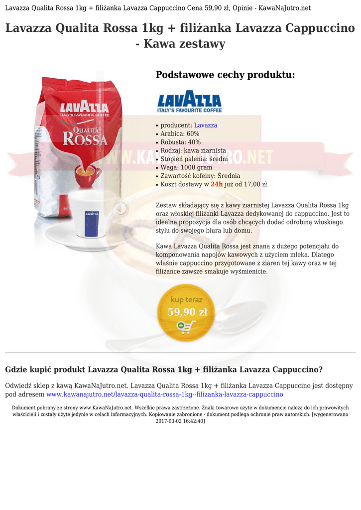 Lavazza Qualita Rossa 1kg + filiżanka Lavazza Cappuccino Cena 59,90 zł, Opinie - KawaNaJutro.net Lavazza Qualita Rossa 1kg + filiżanka Lavazza Cappuccino - Kawa zestawy Podstawowe cechy produktu: ● ● ● ● ● ● ● ● producent: Lavazza Arabica: 60% Robusta: 40% Rodzaj: kawa ziarnista Stopień palenia: średni Waga: 1000 gram Zawartość kofeiny: Średnia Koszt dostawy w 24h już od 17,00 zł Zestaw składający się z kawy ziarnistej Lavazza Qualita Rossa 1kg oraz włoskiej filiżanki Lavazza dedykowanej do cappuccino. Jest to idealna propozycja dla osób chcących dodać odrobiną włoskiego stylu do swojego biura lub domu. Kawa Lavazza Qualita Rossa jest znana z dużego potencjału do komponowania napojów kawowych z użyciem mleka. Dlatego właśnie cappuccino przygotowane z ziaren tej kawy oraz w tej filiżance zawsze smakuje wyśmienicie. 59,90 zł Gdzie kupić produkt Lavazza Qualita Rossa 1kg + filiżanka Lavazza Cappuccino? Odwiedź sklep z kawą KawaNaJutro.net. Lavazza Qualita Rossa 1kg + filiżanka Lavazza Cappuccino jest dostępny pod adresem www.kawanajutro.net/lavazza-qualita-rossa-1kg--filizanka-lavazza-cappuccino Dokument pobrany ze strony www.KawaNaJutro.net. Wszelkie prawa zastrzeżone. Znaki towarowe użyte w dokumencie należą do ich prawowitych właścicieli i zostały użyte jedynie w celach informacyjnych. Kopiowanie zabronione - dokument podlega ochronie praw autorskich. [wygenerowano 2017-03-02 16:42:40]