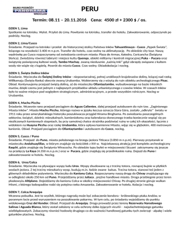 PERU Termin: 08.11 – 20.11.2016 Cena: 4500 zł + 2300 $ / os. DZIEN 1, Lima Spotkanie na lotnisku. Wylot. Przylot do Limy. Powitanie na lotnisku, transfer do hotelu. Zakwaterowanie, odpoczynek po podróży. Nocleg. DZIEN 2, Lima/Cusco Śniadanie. Przejazd na lotnisko i przelot do historycznej stolicy Państwa Inków Tahuantinsuyo - Cusco „Pępek Świata”, leżącego na wysokości 3.400 m n.p.m. Transfer do hotelu, czas wolny na aklimatyzację. Po obiedzie city tour. Naszą wędrówkę po Cusco rozpoczynamy od zwiedzania centrum miasta: Plaza de Armas, Katedra, Coricancha (Świątyna Słońca). Zwiedzimy również labirynt i miejsce kultu Quenqo, obiekt militarny i kontroli migracyjnej Puka – Pucara oraz świątynię poświęconą kultowi wody, Tambo Machay, zwaną niesłusznie „Łaźnią Inki” gdyż obrzędy związane z kultem wody nie wiąże się z kąpielą. Powrót do miasta Cusco. Czas wolny. Obiadokolacja i nocleg. DZIEN 3, Święta Dolina Inków Śniadanie. Wycieczka do Świętej Doliny Inków - niepowtarzalnej, pełnej urokliwych krajobrazów doliny, leżącej nad rzeką Willkamaju (Święta Rzeka) obecnie zwaną Urubamba. Wybierzemy się z wizytą do ruin obiektu archeologicznego Pisac. Obiad. Kontynuujemy przejazd świętą doliną, aż do miasteczka Ollantaytambo, wybudowanego na bazie inkaskich murów, dzięki czemu jest jednym z najlepszych przykładów układu urbanistycznego z czasów Inków. W czasach Inków było to ważne miejsce pod względem strategicznym, administracyjnym, a przede wszystkim rolniczym. Nocleg w Urubamba. DZIEN 4, Machu Picchu Śniadanie. Wczesnie rano przejazd pociągiem do Aguas Calientes, dalej przejazd autobusem do ruin tzw. „Zaginionego Miasta Inków”. Miasto Machu Picchu, którego nazwa w języku keczua oznacza Stara Góra, zostało „odkryte” światu w 1911 roku przez amerykańskiego historyka poszukiwacza przygód Hirama Binghama. Po zwiedzaniu poszczególnych sektorów, świątyń, dzielnic mieszkalnych, kamieniołomu oraz kalendarza słonecznego trzeba koniecznie wspiąć się po niezliczonych kamiennych stopniach, by przy samotnej chatce strażnika podziwiać ruiny w całej ich okazałości, łącznie z widokiem na Huayna Picchu oraz rzekę Urubamba, która opływa kamienne Miasto, wijąc się w głębokim, 400 metrowym kanionie. Obiad. Przejazd pociągiem do Ollantaytambo i autobusem do Cusco, nocleg. DZIEN 5, Cusco / Puno Śniadanie. Przejazd do Puno, miasta położonego na brzegu jeziora Titicaca (3.850 m n.p.m). Pierwszy przystanek w miasteczku Andahuaylillas, w którym znajduje się kościółek z XVI w. Najciekawszą atrakcją jest kompleks archeologiczny Raqchi, gdzie znajduje się Świątynia Wiracocha. Po obiedzie typu bufet w miejscowości Sicuani zatrzymamy się jeszcze na przełęczy La Raya (4.350 m.n.p.m.) oraz w Pucara, gdzie znajdują się przedinkaskie ruiny. Dojazd do Puno i zakwaterowanie w hotelu. Nocleg. DZIEN 6, Uros/Colca Śniadanie. Wycieczka na pływające wyspy ludu Uros. Wyspy zbudowane są z trzciny totora, rosnącej bujnie w płytkich wodach jeziora. Z tej trzciny mieszkańcy wysp, budują m.in. łodzie zwane balsas. Trzcina totora, stanowi też jeden z głównych składników pożywienia. Wycieczka do Kanionu Colca. Rozpoczynamy naszą drogę do Chivay znajdującego się w odległości około 250 km od Puno. Przejeżdżamy przez Juliaca , prężne handlowe miasto. Droga przebiegnie przez teren płaskowyżu Altiplano. Dojeżdżamy do kanionu Colca w okolicy miejscowości Chivay. Po drugiej stronie góruje wulkan Mismi, z którego lodospadów rodzi się potężna rzeka Amazonka. Zakwaterowanie w hotelu. Kolacja i nocleg. DZIEN 7, Colca/Arequipa Wczesna pobudka. Jest to wysiłek, którego nagrodą może być zobaczenie kondora - królewskiego ptaka Andów, w porannym locie przed wyruszeniem na poszukiwanie pokarmu. W tym celu, po śniadaniu wyjeżdżamy do punktu widokowego Cruz del Kondor. Obiad. Przejazd do Arequipy. Droga prowadzi przez tereny Rezerwatu Narodowego Salinas i Aguada Blanca, który został założony w celu ochrony dziko żyjących vicuñii - najszlachetniejszego gatunku wielbłądowatych. Zobaczymy również hodowlę drugiego co do ważności handlowej gatunku tych zwierząt - alpakę i wiele gatunków ptactwa. Nocleg. DZIEN 8, Arequipa/Lima Arequipa – leży na wysokości 2,378 m n.p.m w otoczeniu gór Cordillera Volcanica, spośród których wyróżnia się idealny stożek wulkanu Misti (5.835 m n.p.m.) oraz potężny masyw wulkanu o pięciu kraterach, Chanchani (6.075m.n.p.m.). Obecnie jest drugim co do wielkości miastem Peru. Po śniadaniu city tour: zwiedzanie centrum miasta oraz założonego w 1570 roku klasztoru Świętej Katarzyny (Santa Catalina), najważniejszego i największego pomnika religijnego Peru, który do dzisiaj zachował charakterystyczny styl dla XVI i XVII w. Obiad. Po południu przelot do Limy. Nocleg. DZIEŃ 9: Lima/Chimbote Śniadanie. Po śniadaniu wyjazd do Chimbote. Po przyjeździe odpoczynek, czas wolny. Kolacja i nocleg. DZIEN 10, Pariacoto/Chimbote Śniadanie. Przejazd do Pariacoto, miejsca gdzie pracowali i żyli Bł. O. Michał i Bł. O. Zbigniew. Odwiedzenie miejsca męczeńskiej śmierci Franciszkanów. Przejazd do Chimbote. Kolacja i nocleg. DZIEN 11, Lima Śniadanie. Powrót do Limy. Zwiedzanie Miasta Królów, założonego przez Francisco Pizarro na brzegu rzeki Rimac. Centrum miasta, czyli Lima kolonialna: Plaza de Armas, gdzie znajduje się m.in. Pałac Prezydencki, Katedra, Pałac Arcybiskupi.Dworzec kolei Transandyjskiej współprojektu inż. Ernesta Malinowskiego; Kościół i Klasztor Franciszkanów. Kolacja. Nocleg. DZIEN 12, Lima Śniadanie. Czas wolny na odpoczynek przed wylotem. Pożegnalny obiad. Wylot z Peru. DZIEN 13, Lima Przylot do kraju. CENA ZAWIERA: - Noclegi w hotelach 3* na bazie pokojów dwuosobowych - 10 śniadań, 10 obiadów/kolacji - Przejazdy autobusami prywatnymi dla grupy - Pociag klasy Expeditions Ollantaytam