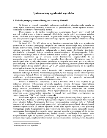 System oceny zgodności wyrobów 1. Polskie przepisy normalizacyjne – trochę historii W Polsce w czasach gospodarki nakazowo-rozdzielczej obowiązywała zasada, Ŝe kaŜdy wyrób dostarczony odbiorcy, niezaleŜnie od przeznaczenia, musiał spełniać warunki techniczne określone w odpowiedniej normie. Doprowadziło to do bardzo rozbudowanej normalizacji. KaŜdy nowy wyrób lub materiał produkowany z dotychczasowych składników musiał mieć opracowaną odrębną normę. PoniewaŜ proces opracowywania i uzgadniania Polskiej Normy był długotrwały, w celu przyspieszenia dopuszczenia do obrotu nowego wyrobu wprowadzano dodatkowo normy branŜowe i zakładowe. W latach 60. i 70. XX wieku normy branŜowe ustanawiane były przez dyrektorów zjednoczeń na wniosek podległego instytutu albo ośrodka badawczego. Gdy zjednoczenia zostały zlikwidowane, normy branŜowe ustanawiane były przez niektórych ministrów na wniosek instytutów lub ośrodków badawczych, a takŜe przez dyrektorów instytutów lub ośrodków pełniących funkcje ośrodków normalizacyjnych. W tym przypadku Polski Komitet Normalizacji, Miar i Jakości nadawał numer normie i po sprawdzeniu zgodności z przepisami rejestrował ją w wykazie norm branŜowych. Doprowadziło to do monopolistycznej pozycji producenta w stosunku do uŜytkownika. Rezultatem tego był równieŜ podział na wyroby eksportowe spełniające wymagania importera i gorsze wyroby na rynek krajowy. W okresie tym próbowano wpływać na poprawę jakości wyrobów krajowych poprzez wprowadzenie znaków jakości „Q" i „1". Jednak przedsięwzięcie to nie spełniło oczekiwań na tyle, na ile się spodziewano. Ustawa o normalizacji z dnia 3 kwietnia 1993 r. zmieniła istniejący stan prawny. Zadaniem Polskiego Komitetu Normalizacyjnego (PKN) było między innymi opracowywanie i ustanawianie Polskich Norm na wniosek normalizacyjnych komisji problemowych, a takŜe współpraca z zainteresowanymi ministrami, szczególnie w sprawach związanych z wprowadzaniem obowiązku stosowania Polskich Norm. Ustawa o badaniach i certyfikacji z dnia 3 kwietnia 1993 r. oraz wydane na jej podstawie przepisy wykonawcze zawierały regulacje prawne dotyczące wprowadzania wyrobów do obrotu. Zgodnie z tymi przepisami wyroby krajowe oraz importowane, które mogły stwarzać jakiekolwiek zagroŜenie dla Ŝycia, zdrowia, środowiska lub mienia, podlegały obowiązkowej certyfikacji. Przed wprowadzeniem do obrotu musiały uzyskać pozytywną ocenę kompetentnej jednostki, w ramach tzw. certyfikacji obowiązkowej na zastrzeŜony przez PCBC1 znak bezpieczeństwa B. Ustalaniem wykazu wyrobów podlegających obowiązkowej certyfikacji zajmował się dyrektor PCBC. Wykazy te (SWW)2 były ogólnie dostępne w postaci zarządzeń drukowanych przez Monitor Polski. Wymagania dotyczące bezpieczeństwa ustalone były w Polskich Normach lub właściwych przepisach prawnych i były podstawą certyfikacji obowiązkowej. Zarówno wprowadzanie do obrotu wyrobów, które ujęte były w wykazie, a nie posiadały wymaganego znaku bezpieczeństwa, jak i bezprawne naniesienie znaku, oznaczało sankcje ekonomiczne dochodzące do wysokości pełnej wartości wyrobów wprowadzonych do obrotu. Oprócz certyfikacji obowiązkowej istniała równieŜ certyfikacja dobrowolna, która przeprowadzana była na Ŝyczenie producenta. Obejmowała ona certyfikację zgodności z normami krajowymi, międzynarodowymi lub innymi dokumentami normatywnymi. Jej celem 1 2 Polskie Centrum Badań i Certyfikacji Systematyczny Wykaz Wyrobów było potwierdzenie przez jednostkę niezaleŜną i kompetentną zgodności wyrobu z przedstawianymi przez producenta dokumentami. Certyfikacji tej towarzyszyło czasami prawo znakowania wyrobu znakiem zgodności np. z Polską Normą PN (zastrzeŜony przez PKN), bądź zastrzeŜony przez PCBC znak jakości Q. Dzisiaj znak bezpieczeństwa B nadal funkcjonuje, jednak jest znakiem dobrowolnej certyfikacji. Nie naleŜy go mylić z oznakowaniem zgodności CE ani teŜ przypisywać mu toŜsamych znaczeń. 2. Geneza i tworzenie wspólnego rynku europejskiego 16.04.1948 r.– w odpowiedzi na propozycję Stanów Zjednoczonych dotyczącą Planu Pomocy Europie tzw. planu Marshalla, państwa zachodnioeuropejskie utworzyły Organizację Europejskiej Współpracy Gospodarczej (Organization for European Economic Cooperation OEEC), zrzeszającą 16 państw Europy Zachodniej, która miała być partnerem Stanów Zjednoczonych w realizacji planu Marshalla. 18.04.1951 r. – podpisano traktat paryski o utworzeniu Europejskiej Wspólnoty Węgla i Stali (EWWiS). 25.03.1957 r. - państwa członkowskie EWWiS podpisały w Rzymie traktat o Europejskiej Wspólnocie Gospodarczej (EWG), a takŜe traktat w sprawie utworzenia trzeciej Wspólnoty Europejskiej Wspólnoty Energii Atomowej (Euratom). Za najwaŜniejszy w procesie harmonizacji prawa europejskiego w dziedzinie bezpieczeństwa wyrobów uwaŜany jest art. 94 traktatu rzymskiego z 1957 r., który mówi „Rada, stanowiąc jednomyślnie na wniosek Komisji i po konsultacji z Parlamentem Europejskim i Komitetem Ekonomiczno-Społecznym, uchwala dyrektywy w celu zbliŜenia przepisów ustawowych, wykonawczych i administracyjnych Państw Członkowskich, które mają bezpośredni wpływ na ustanowienie lub funkcjonowanie wspólnego rynku”. Nie mniej waŜny w zakresie swobodnego przepływu towarów w obrębie Wspólnot jest art. 100, który mówi „Rada, na wniosek Komisji, uchwala jednomyślnie dyrektywy zmierzające do zbliŜenia postanowień ustaw, rozporządzeń i zarządzeń, które obowiązują w Państwach Członkowskich Wspólnoty i mają bezpośredni związek z utworzeniem lub sprawnym działaniem wspólnego rynku. W sprawie dyrektyw, których wykonanie pociągałoby za sobą zmianę przepisów prawnych w jednym lub kilku Państwach Członkowskich Wspólnoty, zasięga się opinii Parlamentu Europejskiego oraz Komitetu Gospodarczego i Społecznego”. W t