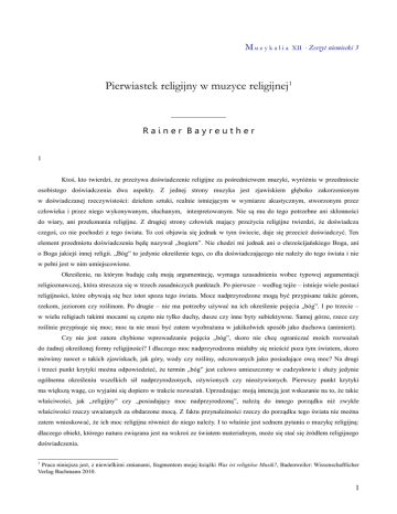 Mu z y k a l i a XII · Zeszyt niemiecki 3 Pierwiastek religijny w muzyce religijnej1 Rainer Bayreuther 1 Ktoś, kto twierdzi, że przeżywa doświadczenie religijne za pośrednictwem muzyki, wyróżnia w przedmiocie osobistego doświadczenia dwa aspekty. Z jednej strony muzyka jest zjawiskiem głęboko zakorzenionym w doświadczanej rzeczywistości: dziełem sztuki, realnie istniejącym w wymiarze akustycznym, stworzonym przez człowieka i przez niego wykonywanym, słuchanym, interpretowanym. Nie są mu do tego potrzebne ani skłonności do wiary, ani przekonania religijne. Z drugiej strony człowiek mający przeżycia religijne twierdzi, że doświadcza czegoś, co nie pochodzi z tego świata. To coś objawia się jednak w tym świecie, daje się przecież doświadczyć. Ten element przedmiotu doświadczenia będę nazywał „bogiem”. Nie chodzi mi jednak ani o chrześcijańskiego Boga, ani o Boga jakiejś innej religii. „Bóg” to jedynie określenie tego, co dla doświadczającego nie należy do tego świata i nie w pełni jest w nim umiejscowione. Określenie, na którym buduję całą moją argumentację, wymaga uzasadnienia wobec typowej argumentacji religioznawczej, która streszcza się w trzech zasadniczych punktach. Po pierwsze – według tejże – istnieje wiele postaci religijności, które obywają się bez istot spoza tego świata. Moce nadprzyrodzone mogą być przypisane także górom, rzekom, jeziorom czy roślinom. Po drugie – nie ma potrzeby używać na ich określenie pojęcia „bóg”. I po trzecie – w wielu religiach takimi mocami są często nie tylko duchy, dusze czy inne byty subiektywne. Samej górze, rzece czy roślinie przypisuje się moc; moc ta nie musi być zatem wyobrażana w jakikolwiek sposób jako duchowa (animiert). Czy nie jest zatem chybione wprowadzanie pojęcia „bóg”, skoro nie chcę ograniczać moich rozważań do żadnej określonej formy religijności? I dlaczego moc nadprzyrodzona miałaby się mieścić poza tym światem, skoro mówimy nawet o takich zjawiskach, jak góry, wody czy rośliny, odczuwanych jako posiadające ową moc? Na drugi i trzeci punkt krytyki można odpowiedzieć, że termin „bóg” jest celowo umieszczony w cudzysłowie i służy jedynie ogólnemu określeniu wszelkich sił nadprzyrodzonych, ożywionych czy nieożywionych. Pierwszy punkt krytyki ma większą wagę, co wyjaśni się dopiero w trakcie rozważań. Uprzedzając: moją intencją jest wskazanie na to, że takie właściwości, jak „religijny” czy „posiadający moc nadprzyrodzoną”, należą do innego porządku niż zwykłe właściwości rzeczy uważanych za obdarzone mocą. Z faktu przynależności rzeczy do porządku tego świata nie można zatem wnioskować, że ich moc religijna również do niego należy. I to właśnie jest sednem pytania o muzykę religijną: dlaczego obiekt, którego natura związana jest na wskroś ze światem materialnym, może się stać się źródłem religijnego doświadczenia. 1 Praca niniejsza jest, z niewielkimi zmianami, fragmentem mojej książki Was ist religiöse Musik?, Badenweiler: Wissenschaftlicher Verlag Bachmann 2010. 1 Mu z y k a l i a XII · Zeszyt niemiecki 3 Czy sztuka, a szczególnie, jak się często podkreśla, muzyka, jest bardziej predestynowana do tego, by być przedmiotem doświadczenia religijnego, niż inne wytwory człowieka, np. samochody czy telefony? Wydaje się, iż osoba doznająca przeżycia religijnego przez muzykę musi na takie pytanie odpowiedzieć twierdząco. Z faktu, że „bóg” objawia się w świecie, można by wnosić, iż nie objawia się on w marnych otaczających nas przedmiotach, lecz w rzeczach, które wyprowadzają człowieka poza celowość i zwyczajność powszedniego dnia. To „przekroczenie granicy” czy też, z łaciny, transcendencję, pojmuje się w wielu argumentacjach jako doświadczenie bliskie religijnemu, protoreligijne czy też podobne. Jednak ci, którym muzyka nie daje przeżyć religijnych, mogliby w tym miejscu zaprotestować. Dla nich sama muzyka może być równie „transcendentna” i podobnie może wynosić słuchacza ponad sprawy powszednie, zwyczajne, ponad ograniczoność jego celów, nie będąc dla niego w żadnym razie ani bliską religii, ani też – tym bardziej – religijną. Owo wynoszenie przez muzykę ponad sprawy codzienne można zatem w uprawniony sposób rozumieć i tak, że sztuka prowadzi człowieka ku temu, co prawdziwie ludzkie. Jeśli spojrzeć w ten sposób, to muzyka i inne sztuki budzą rzeczywisty potencjał i wolność ludzkiej egzystencji. Przy takim podejściu nie jest potrzebny żaden „bóg”, mógłby nawet przeszkadzać. Byłby niepotrzebnie patetycznym, zbytecznym metawyjaśnieniem czegoś, co jest najgłębiej ludzkie. Niektórzy filozofowie, mianowicie Immanuel Kant, a w XX wieku – Max Bense i Jean-François Lyotard, określając takie wejście sztuki w obszar tego, co faktycznie ludzkie, używają pojęcia „transcendentalny” 2. Należy zatem dokładniej wyjaśnić, iż „transcendentalny” nie znaczy „transcendentny”, jakkolwiek jedno słowo z drugim ma coś wspólnego. Nie przyczynia się to do jasności pojęciowej. Zarówno religijne, jak i niereligijne doświadczanie muzyki może odwoływać się do pojęcia transcendencji, wszakże jedna z tych postaw jest fałszem lub przynajmniej – nieporozumieniem. Pojęcie transcendencji nie wyjaśnia, czym jest coś, ku czemu zmierza to, co jest zdolne do transcendencji. Czy znajduje się w świecie, czy też poza nim, czy należy do conditio humana, czy też stanowi pierwiastek boski – to wszystko pozostaje niedopowiedziane. W następnym punkcie panuje jeszcze większe zamieszanie. Jeśli ktoś jest przekonany, że w muzyce czy też przez muzykę doświadcza „boga”, to co właściwie jest przedmiotem jego doświadczenia? Jeśli nie doprecyzuje swego twierdzenia, dodając, że słuchając, otrzymał zmysłowe objawienie, a w 