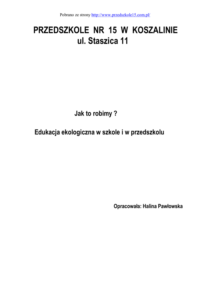 Pobrano ze strony http://www.przedszkole15.com.pl/ PRZEDSZKOLE NR 15 W KOSZALINIE ul. Staszica 11 Jak to robimy ? Edukacja ekologiczna w szkole i w przedszkolu Opracowała: Halina Pawłowska SPIS TREŚCI Str. Wstęp................................................................................................................... 1 „Świadomość ekologiczna” w szkole i w przedszkolu......................................... 2 Cele edukacji ekologicznej dzieci....................................................................... 3 Proekologiczna działalność naszego przedszkola.............................................. 5 Propozycje zajęć z dziećmi 1. Przedstawienie pt. „Chrońmy przyrodę”.................................................... 12 2. „Zwiastuny wiosny, pierwsze kwiaty wczesnowiosenne”.......................... 17 3. Spotkanie z rodzicami – „Wpływ konserwantów na zdrowie człowieka”..... 19 4. „Turniej wiedzy ekologicznej”................................................................... 21 5. Zakładamy zielone hodowle w „kąciku przyrody”...................................... 23 Załączniki: - Wykaz książek o tematyce ekologicznej. - Konserwanty, emulgatory, antyutleniacze, barwniki. - Dyplom przyjaciela przyrody. - Plansza- segregowanie odpadów. Bibliografia. Wstęp Słowo „ekologia” pochodzi od greckiego oikos, co znaczy dom rodzinny, ognisko domowe. Źródłosłów ten wyjaśnia dlaczego wśród nauk przyrodniczych właśnie ekologii przypadła w udziale rola tej, która bada całokształt dziedzictwa naturalnego Ziemi. Fakt, iż zwraca się uwagę na całościowe ujęcie tych kwestii, ma bardzo istotne znaczenie, gdyż ekologia nie ogranicza się do inwentaryzacji istot żywych. Przede wszystkim bada wzajemne związki między nimi, usiłując wyjaśnić, dlaczego do nich dochodzi, a dzięki temu przewidywać zachowania się poszczególnych istot żywych zarówno w stałych jak i zmiennych warunkach. Ogólnie przyjmuje się, że termin „ekologia” stworzył zoolog niemiecki Ernst H. Haeckel w roku 1869, lecz pojawienie się nazwy nie musi oznaczać narodzin nowej nauki. Oznacza wszakże uznanie jej za odrębną dyscyplinę. Ekologia jako nauka nowoczesna ukonstytuowała się jako taka w początkach tego stulecia za sprawą ekologów zajmujących się środowiskiem wodnym: limnologów, czyli badaczy środowiska słodkowodnego, i oceanografów. Warto jednak wiedzieć, że zarówno Arystoteles jak i inni myśliciele starożytnej Grecji pozostawili po sobie prace o treści wyraźnie ekologicznej. Od czasu, gdy zainteresowanie problematyką ochrony środowiska stało się w Polsce powszechne, nastąpiło zrównanie terminów „ekologia” i „ochrona środowiska”. Świadczą o tym rozliczne publikacje w prasie, radiu i telewizji. Jak przysłowiowe grzyby po deszczu wyrastają organizacje określane potocznie jako „zielone”. Trzeba jednak zdać sobie sprawę z tego, że faktycznie „ekologia” i „ochrona środowiska” to nie to samo. Współczesna definicja „ekologii” jest krótka: ekologia jest to nauka o gospodarce przyrody. Definicja ta jest bardzo ogólna i niewiele nam mówi o tym, czym się ekologia zajmuje. Definicja ta tłumaczy jednak związki ekologii z ochroną środowiska. Współczesna ochrona środowiska ma polegać na rozsądnym gospodarowaniu przyrodą, musi się więc opierać, a nawet wcielać w życie zdobycze ekologii. „Świadomość ekologiczna” w szkole i przedszkolu Nowoczesna ochrona środowiska stawia przed nami jedno poważne zadanie: wyrabianie „świadomości ekologicznej” . Świadomość ta jest bardzo niedostateczna, a od niej bardzo dużo zależy. Ochrona środowiska, to nie tylko wielkie przedsięwzięcia w skali krajowej, międzynarodowej czy światowej, to również codzienne działania nas wszystkich. Szerzenie świadomości ekologicznej to nie tylko wykłady na wyższych uczelniach czy zajęcia lekcyjne w szkolnictwie średnim. Pierwsze kontakty z przyrodą zapewnia dziecku dom rodzinny. Dom to miejsce, gdzie są nasze korzenie, tam przejmujemy od najbliższych normy i zasady życia społecznego, kulturę i tradycję, które pielęgnowane stanowią fundament naszej hierarchii wartości. W domu po raz pierwszy zaczynamy analizować przekazywane nam zasady i odnosić je do rzeczywistości. To również, a może nawet przede wszystkim, działalność edukacyjna w szkołach podstawowych i przedszkolach. Dziecko jest istotą ciekawą świata. Konieczność poznawania przez dzieci świata przyrody i kształtowania prawidłowych pojęć przyrodniczych oraz właściwej postawy jest ogromna. Tak ogromna, że nie możemy mówić o prawidłowym rozwoju osobowości bez zastosowania tej drogi rozwoju. Świat przyrody, w którym żyje dziecko, jest dla niego obiektem niezwykle interesującym. Stefan Szuman tłumaczył to faktem, iż wiadomości z przyrody najbardziej odpowiadają sposobowi myślenia dziecka. Z myśleniem ściśle związany jest rozwój mowy. Świat przyrody jest doskonałym materiałem do rozwoju tej funkcji. Poznając nowe zjawiska, zwierzęta, rośliny, dziecko poznaje nowe słowa. Wzbogaca się zasób jego słownictwa, zdolność i jasność wyrażania myśli, formułowania spostrzeżeń. Wychowanie przez przyrodę zawiera ważne aspekty moralne. Opiekując się zwierzętami, roślinami, dbając na miarę swoich sił o środowisko, dzieci uczą się cierpliwości, wytrwałości, poczucia odpowiedzialności i koleżeństwa. Obcując z przyrodą, dziecko przywiązuje się do niej w sposób naturalny. Poza tym tylko ludzie dbający o świat flory i fauny są zdolni zrozumieć i dbać o świat ludzki. Cele edukacji ekologicznej dzieci Mówiąc o edukacji ekologicznej można wyróżnić następujące jej kategorie celów: poznawcze, tj. umożliwić dzieciom poznanie, zrozumienie i zapamiętanie podstawowych wiadomości o zasadniczych obiektach i zjawiskach środowiska p