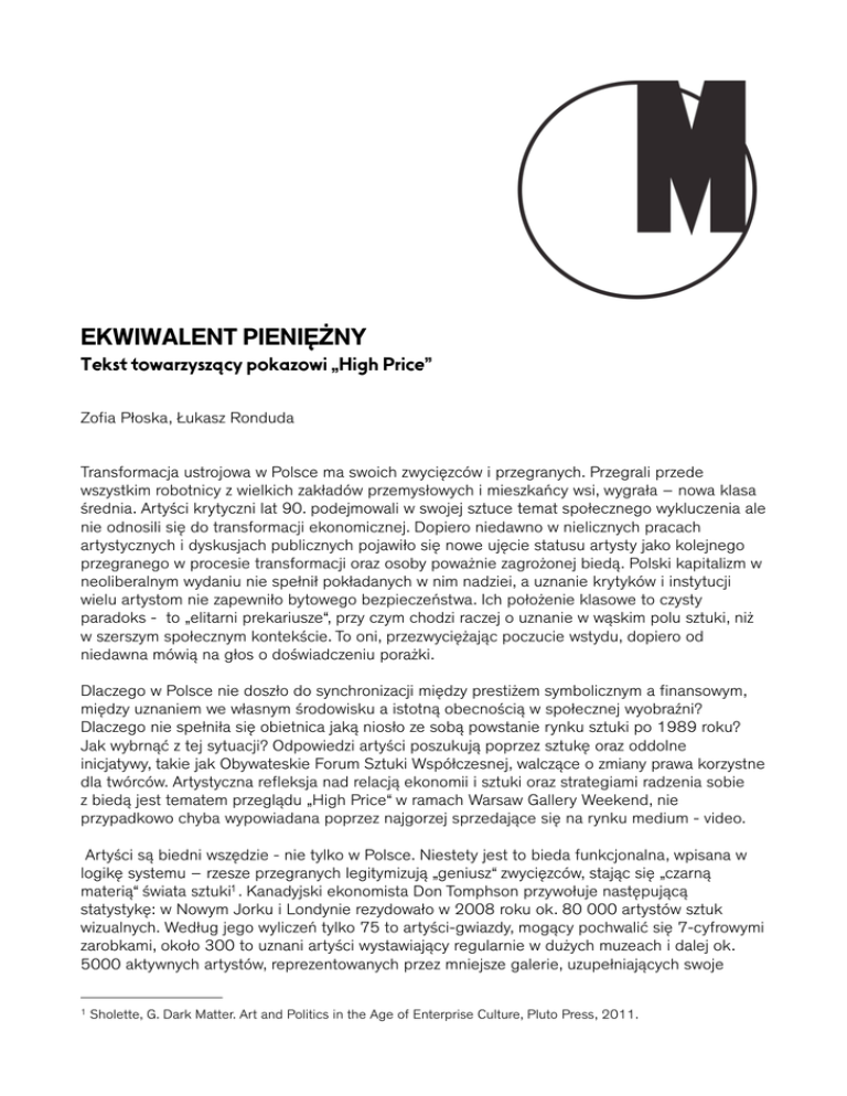EKWIWALENT PIENIĘŻNY Tekst towarzyszący pokazowi „High Price” Zofia Płoska, Łukasz Ronduda Transformacja ustrojowa w Polsce ma swoich zwycięzców i przegranych. Przegrali przede wszystkim robotnicy z wielkich zakładów przemysłowych i mieszkańcy wsi, wygrała – nowa klasa średnia. Artyści krytyczni lat 90. podejmowali w swojej sztuce temat społecznego wykluczenia ale nie odnosili się do transformacji ekonomicznej. Dopiero niedawno w nielicznych pracach artystycznych i dyskusjach publicznych pojawiło się nowe ujęcie statusu artysty jako kolejnego przegranego w procesie transformacji oraz osoby poważnie zagrożonej biedą. Polski kapitalizm w neoliberalnym wydaniu nie spełnił pokładanych w nim nadziei, a uznanie krytyków i instytucji wielu artystom nie zapewniło bytowego bezpieczeństwa. Ich położenie klasowe to czysty paradoks - to „elitarni prekariusze“, przy czym chodzi raczej o uznanie w wąskim polu sztuki, niż w szerszym społecznym kontekście. To oni, przezwyciężając poczucie wstydu, dopiero od niedawna mówią na głos o doświadczeniu porażki. Dlaczego w Polsce nie doszło do synchronizacji między prestiżem symbolicznym a finansowym, między uznaniem we własnym środowisku a istotną obecnością w społecznej wyobraźni? Dlaczego nie spełniła się obietnica jaką niosło ze sobą powstanie rynku sztuki po 1989 roku? Jak wybrnąć z tej sytuacji? Odpowiedzi artyści poszukują poprzez sztukę oraz oddolne inicjatywy, takie jak Obywateskie Forum Sztuki Współczesnej, walczące o zmiany prawa korzystne dla twórców. Artystyczna refleksja nad relacją ekonomii i sztuki oraz strategiami radzenia sobie z biedą jest tematem przeglądu „High Price“ w ramach Warsaw Gallery Weekend, nie przypadkowo chyba wypowiadana poprzez najgorzej sprzedające się na rynku medium - video. Artyści są biedni wszędzie - nie tylko w Polsce. Niestety jest to bieda funkcjonalna, wpisana w logikę systemu – rzesze przegranych legitymizują „geniusz“ zwycięzców, stając się „czarną materią“ świata sztuki1 . Kanadyjski ekonomista Don Tomphson przywołuje następującą statystykę: w Nowym Jorku i Londynie rezydowało w 2008 roku ok. 80 000 artystów sztuk wizualnych. Według jego wyliczeń tylko 75 to artyści-gwiazdy, mogący pochwalić się 7-cyfrowymi zarobkami, około 300 to uznani artyści wystawiający regularnie w dużych muzeach i dalej ok. 5000 aktywnych artystów, reprezentowanych przez mniejsze galerie, uzupełniających swoje 1 Sholette, G. Dark Matter. Art and Politics in the Age of Enterprise Culture, Pluto Press, 2011. dochody z innych źródeł. Cała reszta to prekariusze, których większość zmieni zawód przed 30 rokiem życia, by zostać zastąpionymi przez nową rzeszę absolwentów szkół artystycznych, których liczba stale rośnie2. Tak jest też w Polsce - w samym roku 2010 mury uczelni plastycznych opuściło 1214 absolwentów, a kierunki artystyczne należą do najbardziej obleganych3 . Biorąc pod uwagę znacznie mniej rozbudowaną sieć instytucji i płytki rynek, badania struktury dochodów z działalności artystycznej w Polsce mogą przynieść jeszcze bardziej pesymistyczne rezultaty4 . Hans Abbing – artysta, a zarazem ekonomista na Uniwersytecie w Rotterdamie – w brawurowy sposób zdekonstruował „osobliwą“ ekonomię sztuki. Osobliwą, bo zasady obowiązujące w tym polu składają się niemal z samych wyjątków od ekonomicznych reguł obowiązujących w innych dziedzinach. Pierwszą, uderzającą anomalią jest fakt, że artyści są najgorzej zarabiającą grupą w stosunku do swojego wykształcenia oraz kapitału kulturowego i społecznego. Zarobki wąskiej grupy gwiazd są osobliwie wysokie, większość zaś nie tylko zarabia mało czy wcale, ale wręcz finansuje swoją działalność artystyczną z innych źródeł – drugiej pracy, wsparcia partnerów, rodziny czy przyjaciół. W czasach PRL grupa Łódź Kaliska praktykowała „kulturę zrzuty“ – formę wzajemnego utrzymania, doskonale sportretowaną w pokazywanym przez nas filmie Józefa Robakowskiego „Maszyny Drżące“ (1986). Artyści są w stanie wiele poświęcić dla sztuki – nie tylko akordeon po ojcu. Mimo fatalnych perspektyw liczba osób chcących zostać artystami nie maleje, ale rośnie, co świadczy o niezwykłej atrakcyjności działalności artystycznej. Rzeczywiście – sztuka cieszy się ogromnym prestiżem, a artystom przypisuje się najbardziej cenione wartości – bezinteresowność, jednostkowy talent i innowacyjność. Konsekwencją tego faktu jest kolejna osobliwość systemu – ekonomia sztuki w niespotykany sposób opiera się na sferze daru: dotacji państwowych, sponsoringu czy prywatnego mecenatu. Nieprzypadkowo to ostatnie zaobserwować można tylko w jednym tylko polu poza sztuką – religii5 . Według Abbinga to mitologia sztuki, dzięki której zachowuje ona swój wysoki status – jest odpowiedzialna za biedę artystów. Opiera się ona na modelu artysty awangardowego autonomicznego, bezinteresownego, przekraczającego bariery, obdarzonego boskim, bezcennym „talentem“, nie dającym się przełożyć na wartość pieniężną. Ciekawą i ironiczną refleksją na ten temat jest film autorstwa KwieKulik, w którym Paweł Kwiek wypłaca „Ekwiwalent pieniężny“ (1985) osobom przybyłym by zobaczyć performans nieobecnego na sali duetu. Performans jest odwołany, a straty duchowe poniesione przez publiczność ma wynagrodzić natychmiastowa wypłata każdemu z przybyłych 50 lub 100 zł. Nad tym ile wart jest pomysł artysty zastanawia się też Oskar Dawicki. 10 000 (2008) to dokumentacja z kamery przemysłowej wystawy w galerii Witryna, gdzie artysta zaprezentował budżet wystawy – plik stu stuzłotowych banknotów. Zamiast zamienić je na sztukę, samą gotówkę uczynił obiektem artystycznym. Za równo KwieKulik jak i Dawicki zwracają uwagę na nieusuwalne napięcie, które po