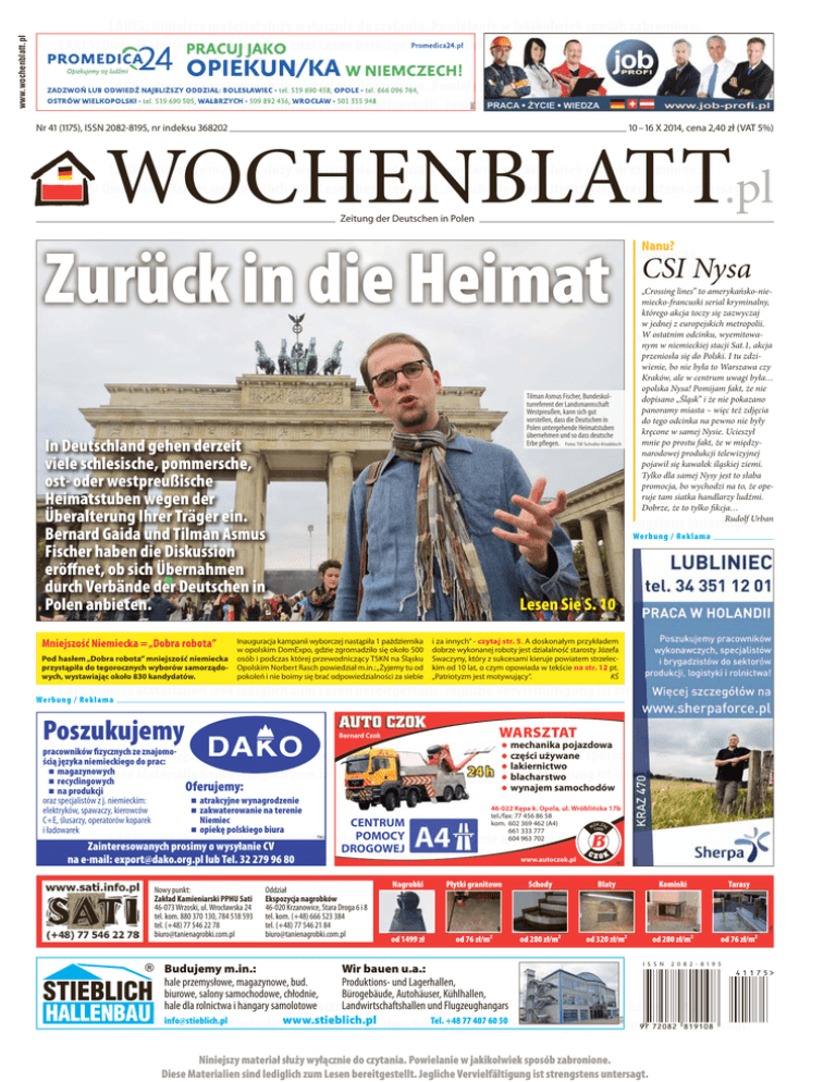 7913 LARES: Niniejszy materiał służy wyłącznie do czytania. Powielanie w jakikolwiek sposób zabronione. LARES: Diese Materialien sind lediglich zum Lesen bereitgestellt. Jegliche Vervielfältigung ist strengstens untersagt. 8042 Nr 41 (1175), ISSN 2082-8195, nr indeksu 368202 10 – 16 X 2014, cena 2,40 zł (VAT 5%) WOCHENBLATT.pl LARES: Niniejszy materiał służy wyłącznie do czytania. Powielanie w jakikolwiek sposób zabronione. LARES: Diese Materialien sind lediglich zum Lesen bereitgestellt. Jegliche Vervielfältigung ist strengstens untersagt. Zeitung der Deutschen in Polen Nanu? Zurück in die Heimat LARES: Niniejszy materiał służy wyłącznie do czytania. Powielanie w jakikolwiek sposób zabronione. LARES: Diese Materialien sind lediglich zum Lesen bereitgestellt. Jegliche Vervielfältigung ist strengstens untersagt. CSI Nysa „Crossing lines” to amerykańsko-niemiecko-francuski serial kryminalny, którego akcja toczy się zazwyczaj w jednej z europejskich metropolii. W ostatnim odcinku, wyemitowanym w niemieckiej stacji Sat.1, akcja przeniosła się do Polski. I tu zdziwienie, bo nie była to Warszawa czy Kraków, ale w centrum uwagi była… opolska Nysa! Pomijam fakt, że nie dopisano „Śląsk” i że nie pokazano panoramy miasta – więc też zdjęcia do tego odcinka na pewno nie były kręcone w samej Nysie. Ucieszył mnie po prostu fakt, że w międzynarodowej produkcji telewizyjnej pojawił się kawałek śląskiej ziemi. Tylko dla samej Nysy jest to słaba promocja, bo wychodzi na to, że operuje tam siatka handlarzy ludźmi. Dobrze, że to tylko fikcja… Rudolf Urban LARES: Niniejszy materiał służy wyłącznie do czytania. Powielanie w jakikolwiek sposób zabronione. LARES: Diese Materialien sind lediglich zum Lesen bereitgestellt. Jegliche Vervielfältigung ist strengstens untersagt. Tilman Asmus Fischer, Bundeskulturreferent der Landsmannschaft Westpreußen, kann sich gut vorstellen, dass die Deutschen in Polen untergehende Heimatstuben übernehmen und so dass deutsche Erbe pflegen. Foto: Till Scholtz-Knobloch LARES: Niniejszy materiał służy wyłącznie do czytania. Powielanie w jakikolwiek sposób zabronione. Diese Materialien sind lediglich zum Lesen bereitgestellt. Jegliche Vervielfältigung ist strengstens untersagt. In LARES: Deutschland gehen derzeit viele schlesische, pommersche, ost- oder westpreußische Heimatstuben dermateriał służy wyłącznie do czytania. Powielanie w jakikolwiek sposób zabronione. LARES:wegen Niniejszy Überalterung Ihrer Träger ein. LARES: Diese Materialien sind lediglich zum Lesen bereitgestellt. Jegliche Vervielfältigung ist strengstens untersagt. Werbung / Reklama Bernard Gaida und Tilman Asmus Fischer haben die Diskussion eröffnet, ob sich Übernahmen durch Verbände der Deutschen LARES: Niniejszy materiałinsłuży wyłącznie do czytania. Powielanie w jakikolwiek sposób zabronione. Polen anbieten. Lesen Sie S.ist 10strengstens untersagt. LARES: Diese Materialien sind lediglich zum Lesen bereitgestellt. Jegliche Vervielfältigung Mniejszość Niemiecka = „Dobra robota” Pod hasłem „Dobra robota” mniejszość niemiecka przystąpiła do tegorocznych wyborów samorządowych, wystawiając około 830 kandydatów. Inauguracja kampanii wyborczej nastąpiła 1 października w opolskim DomExpo, gdzie zgromadziło się około 500 osób i podczas której przewodniczący TSKN na Śląsku Opolskim Norbert Rasch powiedział m.in.: „Żyjemy tu od pokoleń i nie boimy się brać odpowiedzialności za siebie i za innych” - czytaj str. 5. A doskonałym przykładem dobrze wykonanej roboty jest działalność starosty Józefa Swaczyny, który z sukcesami kieruje powiatem strzeleckim od 10 lat, o czym opowiada w tekście na str. 12 pt. „Patriotyzm jest motywujący”. KŚ LARES: Niniejszy materiał służy wyłącznie do czytania. Powielanie w jakikolwiek sposób zabronione. LARES: Diese Materialien sind lediglich zum Lesen bereitgestellt. Jegliche Vervielfältigung ist strengstens untersagt. Werbung / Reklama Poszukujemy pracowników fizycznych ze znajomością języka niemieckiego do prac: n magazynowych n recyclingowych n na produkcji oraz specjalistów z j. niemieckim: elektryków, spawaczy, kierowców C+E, ślusarzy, operatorów koparek i ładowarek warsztat Bernard Czok lmechanika pojazdowa lczęści używane llakiernictwo lblacharstwo lwynajem samochodów LARES: Niniejszy materiał służy wyłącznie do czytania. Powielanie w jakikolwiek sposób zabronione. LARES: Diese Materialien sind lediglich zum Lesen bereitgestellt. Jegliche Vervielfältigung ist strengstens untersagt. Oferujemy: n atrakcyjne wynagrodzenie n zakwaterowanie na terenie Niemiec n opiekę polskiego biura 46-022 Kępa k. Opola, ul. Wróblińska 17b tel./fax: 77 456 86 58 kom. 602 369 462 (A4) 661 333 777 604 963 702 CENTRUM LARES: Niniejszy materiał służy wyłącznie POMOCY do czytania. Powielanie w jakikolwiek sposób zabronione. Zainteresowanych prosimy o wysyłanie CV DROGOWEJ www.autoczok.pl LARES: Diese Materialienlub sind ist strengstens untersagt. na e-mail: [email protected] Tel.lediglich 32 279 96 80zum Lesen bereitgestellt. Jegliche Vervielfältigung 7877 8037 7963 Oddział Ekspozycja nagrobków 46-020 Krzanowice, Stara Droga 6 i 8 tel. kom. (+48) 666 523 384 tel. (+48) 77 546 21 84 [email protected] Nagrobki Płytki granitowe Schody Blaty Kominki Tarasy LARES: Niniejszy materiał służy wyłącznie do czytania. Powielanie w jakikolwiek sposób zabronione. od 1499 zł od 76 zł/m² Vervielfältigung od 280 zł/m² od 320 od 280 zł/m² od 76 zł/m² LARES: Diese Materialien sind lediglich zum Lesen bereitgestellt. Jegliche istzł/m² strengstens untersagt. I S S N 2 0 8 2 - 8 1 9 5 Budujemy m.in.: Wir bauen u.a.: hale przemysłowe, magazynowe, bud. Produktions- und Lagerhallen, biurowe, salony samochodowe, chłodnie, Bürogebäude, Autohäuser, Kühlhallen, hale dla rolnictwa i hangary samolotowe Landwirtschaftshallen 