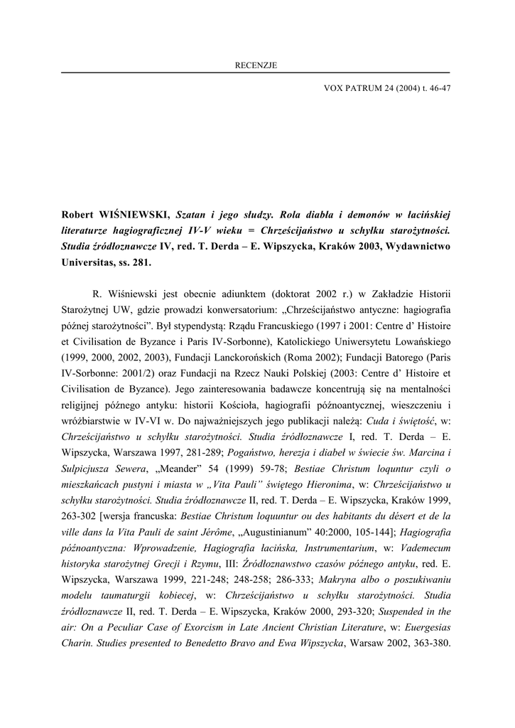 RECENZJE VOX PATRUM 24 (2004) t. 46-47 Robert WIŚNIEWSKI, Szatan i jego słudzy. Rola diabła i demonów w łacińskiej literaturze hagiograficznej IV-V wieku = Chrześcijaństwo u schyłku starożytności. Studia źródłoznawcze IV, red. T. Derda – E. Wipszycka, Kraków 2003, Wydawnictwo Universitas, ss. 281. R. Wiśniewski jest obecnie adiunktem (doktorat 2002 r.) w Zakładzie Historii Starożytnej UW, gdzie prowadzi konwersatorium: „Chrześcijaństwo antyczne: hagiografia późnej starożytności”. Był stypendystą: Rządu Francuskiego (1997 i 2001: Centre d’ Histoire et Civilisation de Byzance i Paris IV-Sorbonne), Katolickiego Uniwersytetu Lowańskiego (1999, 2000, 2002, 2003), Fundacji Lanckorońskich (Roma 2002); Fundacji Batorego (Paris IV-Sorbonne: 2001/2) oraz Fundacji na Rzecz Nauki Polskiej (2003: Centre d’ Histoire et Civilisation de Byzance). Jego zainteresowania badawcze koncentrują się na mentalności religijnej późnego antyku: historii Kościoła, hagiografii późnoantycznej, wieszczeniu i wróżbiarstwie w IV-VI w. Do najważniejszych jego publikacji należą: Cuda i świętość, w: Chrześcijaństwo u schyłku starożytności. Studia źródłoznawcze I, red. T. Derda – E. Wipszycka, Warszawa 1997, 281-289; Pogaństwo, herezja i diabeł w świecie św. Marcina i Sulpicjusza Sewera, „Meander” 54 (1999) 59-78; Bestiae Christum loquntur czyli o mieszkańcach pustyni i miasta w „Vita Pauli” świętego Hieronima, w: Chrześcijaństwo u schyłku starożytności. Studia źródłoznawcze II, red. T. Derda – E. Wipszycka, Kraków 1999, 263-302 [wersja francuska: Bestiae Christum loquuntur ou des habitants du désert et de la ville dans la Vita Pauli de saint Jérôme, „Augustinianum” 40:2000, 105-144]; Hagiografia późnoantyczna: Wprowadzenie, Hagiografia łacińska, Instrumentarium, w: Vademecum historyka starożytnej Grecji i Rzymu, III: Źródłoznawstwo czasów późnego antyku, red. E. Wipszycka, Warszawa 1999, 221-248; 248-258; 286-333; Makryna albo o poszukiwaniu modelu taumaturgii kobiecej, w: Chrześcijaństwo u schyłku starożytności. Studia źródłoznawcze II, red. T. Derda – E. Wipszycka, Kraków 2000, 293-320; Suspended in the air: On a Peculiar Case of Exorcism in Late Ancient Christian Literature, w: Euergesias Charin. Studies presented to Benedetto Bravo and Ewa Wipszycka, Warsaw 2002, 363-380. RECENZJE Obecnie zaś ma w przygotowaniu artykuł: Pythones, engastrimythoi, arrepticii – la divination des possédés dans l’ antiquité tardive. Autor omawianej przez nas książki wyszedł od stwierdzenia, iż mimo nieistnienia wszechogarniającego strachu przed demonami u ludzi późnego antyku, wiara w nie była cechą nie tylko ludu, ale i elit. Jednocześnie dodał, iż mało jest w zasadzie wzmianek na temat demonów, a rola, jaką im przypisują autorzy, jest skromna. Mimo faktu szczupłości informacji pochodzących ze źródeł, tzn. literatury hagiograficznej, a co za tym idzie braku systematycznych badań, które mogłyby potwierdzić, że świat późnego antyku był opanowany przez lęk przed demonami oraz braku syntetycznych studiów wyjaśniających rolę diabła i demonów w świadomości chrześcijan badanego okresu, Autor podjął się trudnego zadania wyjaśnienia tego problemu. W tej sytuacji pomocne dla niego były studia poświęcone, choćby tylko częściowo, miejscu zajmowanemu przez szatana i demony w poszczególnych tekstach, w tym także w niektórych żywotach świętych. W opinii R. Wiśniewskiego wizja przestrzeni wypełnionej „demonicznymi bakcylami” u schyłku starożytności jest raczej przedmiotem utartych sądów, niż rzetelnych analiz, i znajduje swe źródło w Apophtegmata (Collectio systematica Latina 18, 11/31 [1369], zob. przyp. 7 Autora, s. 11.) oraz w dziełach hagiograficznych. Autor zarzucił dotychczasowym badaczom tego problemu brak rzetelności naukowej i specyficzną mentalność, ze względu na ograniczanie się ich do nielicznych tylko i selektywnych źródeł. Chodzi oczywiście o hagiografie, a w szczególności o Żywot św. Antoniego, który w istocie, jak najpierw pisze R. Wiśniewski, spełnił ogromną rolę w kształtowaniu wizerunku demonów w literaturze nie tylko późnej starożytności, ale i następnych epok, a później dodał, że wpływ ten jest jednak łatwy do przecenienia, skąd powstał tak ogólny wniosek na temat mentalności ludzi tamtej epoki. Tym samym Autor książki postawił się w podobnie niezręcznej sytuacji, ograniczywszy swe badania do literatury hagiograficznej IV i V wieku. Zastanawiające są jego jednoczesne stwierdzenia, że Vita Antonii należy do sfery przekonań ludzi późnego antyku i że obraz złych duchów w tym utworze nie jest całkowicie reprezentatywny dla literatury tego okresu. Teksty hagiograficzne w intencji R. Wiśniewskiego miały zilustrować pogląd o zdemonizowaniu świata wyobraźni późnego antyku. Autor książki podkreślił, że celem jego badań było nie tylko ustalenie funkcji literackiej diabła i demonów, ale też ustalenie odpowiedzi na pytanie, jaką rolę szatan i jego towarzysze odegrali w mentalności ludzi epoki późnoantycznej. Ta dodatkowa, jak przyznaje sam pisarz, teza jego pracy, nie tylko jemu wydaje się o wiele bardziej fascynująca, niż główna, zawarta w tytule, dobrowolnie ograniczona jedynie do źródeł hagiograficznych. Niemniej, recenzowana praca, opatrzona bogatą bibliografią, wskazuje na RECENZJE wnikliwość i drobiazgowość badań. Autor przeanalizował kilka tekstów, obejmujących prawie całą hagiografię łacińską z pierwszych stu lat jej rozwoju, a mianowicie: Vita Pauli, Vita Hilarionis, Vita Malchi Hieronima, Vita Martini i Dialogi Sulpicjusza Sewera, Vita Ambrosii Paulina z Mediolanu, Vita Augustini Possydiusza z Kalamy, Sermo de vita sancti Honorati Hilarego z Arles, Vita Hilarii Honorata z Marsylii oraz Vita Germani Konstancjusza z Lyonu. R. Wiśniewskiego