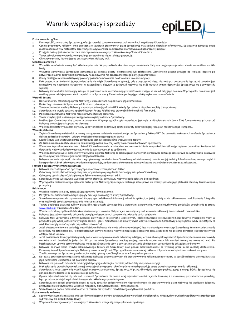Warunki współpracy i sprzedaży Postanowienia ogólne 1. Firma epiLED, zwana dalej Sprzedawcą, oferuje sprzedaż towarów na niniejszych Warunkach Współpracy i Sprzedaży. 2. Cenniki produktów, reklamy i inne ogłoszenia o towarach oferowanych przez Sprzedawcę mają jedynie charakter informacyjny. Sprzedawca zastrzega sobie możliwość zmian w/w materiałów przesyłanych Nabywcom bez konieczności informowania o każdorazowej zmianie. 3. Przyjęcie faktury jest równoznaczne z zaakceptowaniem niniejszych Warunków Współpracy i Sprzedaży. 4. Towar zakupiony na wyprzedaży nie podlega zwrotowi oraz nie jest objęty gwarancją. 5. Okres gwarancyjny liczony jest od dnia wystawienia faktury VAT. Składanie zamówień 6. Wszystkie zamówienia muszą być składane pisemnie. W przypadku braku pisemnego zamówienia Nabywca przyjmuje odpowiedzialność za możliwe wynikłe błędy. 7. Wszystkie zamówienia Sprzedawca potwierdza za pomocą poczty elektronicznej lub telefoniczne. Zamówienie zostaje przyjęte do realizacji dopiero po potwierdzeniu. Brak odpowiedzi Sprzedawcy na zamówienie nie oznacza milczącego przyjęcia zamówienia. 8. Osoby działające w imieniu Nabywcy powinny posiadać umocowanie do działania w imieniu Nabywcy. 9. Fakt przyjęcia zamówienia i jego potwierdzenie nie wiąże Sprzedawcy w sytuacji, gdy z przyczyn od niego niezależnych dostarczenie i sprzedaż towarów jest niemożliwe lub nadmiernie utrudnione. W szczególności dotyczy to zachowań Nabywcy lub osób trzecich (w tym dostawców Sprzedawcy) lub z powodu siły wyższej. 10. Nabywcy indywidualni dokonujący zakupu za pośrednictwem Internetu mogą zwrócić towar w ciągu 10 dni od daty jego dostawy. W przypadku firm zwrot jest możliwy po wcześniejszym ustaleniu tego faktu ze Sprzedawcą. Zwrotowi nie podlegają produkty wykonane na zamówienie. Warunki dostaw 11. Dostawa towaru zakupionego przez Nabywcę jest realizowana na podstawie jego zamówienia. 12. Do każdego zamówienia Sprzedawca dolicza koszty transportu. 13. Towar może zostać wysłany Nabywcy z wykorzystaniem jego konta UPS. Wtedy Sprzedawca nie pobiera opłaty transportowej. 14. Sprzedawca nie wysyła towaru za pośrednictwem Poczty Polskiej oraz przewoźników innych niż firma UPS. 15. Po złożeniu zamówienia Nabywca może otrzymać fakturę proforma. 16. Towar wysyłany jest kurierem po zaksięgowaniu wpłaty na koncie Sprzedawcy. 17. Możliwa jest również wysyłka towaru za pobraniem. W tym przypadku opłata spedytora jest wyższa niż opłata standardowa. Z tej formy nie mogą skorzystać Nabywcy dokonujący zakupu po raz pierwszy. 18. W przypadku dostawy na adres prywatny Spedytor dolicza dodatkową opłatę do kwoty odpowiadającej rodzajowi realizowanego transportu. Warunki płatności 19. Zapłata Sprzedawcy należności za towary następuje na podstawie wystawionej przez Sprzedawcę faktury VAT. Do cen netto wskazanych w ofercie Sprzedawca dolicza podatek od towarów i usług w wysokości określonej przepisami prawa. 20. Każda faktura VAT wystawiona przez Sprzedawcę stanowi jednocześnie wezwanie do zapłaty. 21. Za dzień dokonania zapłaty uznaje się dzień zaksięgowania należnej kwoty na rachunku bankowym Sprzedawcy. 22. W momencie przekroczenia terminu płatności Sprzedawca nalicza odsetki ustawowe za opóźnienie w wysokości określonej przepisami prawa i bez konieczności doręczania Nabywcy dodatkowego wezwania do zapłaty odsetek za opóźnienie. 23. W przypadku wątpliwości odnośnie wywiązywania się przez Nabywcę ze zobowiązań finansowych Sprzedawca zastrzega sobie prawo do wstrzymania dostaw na rzecz Nabywcy do czasu uregulowania zaległych należności. 24. Nabywca zobowiązuje się do niezwłocznego pisemnego zawiadomienia Sprzedawcy o każdorazowej zmianie swojej siedziby lub adresu doręczania przesyłek i korespondencji. Brak takowego zawiadomienia powoduje, że doręczenia dokonane na adresy wskazane w zamówieniu uważane są za skuteczne. Faktura z odroczonym terminem płatności 25. Nabywca może otrzymać od Sprzedającego odroczony termin płatności faktur. 26. Odroczony termin płatności mogą otrzymać jedynie Nabywcy regularnie dokonujący zakupów u Sprzedawcy. 27. Odroczony termin płatności dla pierwszej faktury terminowej wynosi 7 dni. 28. Sprzedawca może sukcesywnie wydłużać termin płatności, gdy faktury Nabywcy będą opłacane bez opóźnień. 29. W przypadku nieterminowego opłacania faktur przez Nabywcę, Sprzedający zastrzega sobie prawo do zmiany sposobu jego płatności z faktury terminowej na przedpłatę. Reklamacje 30. Wszelkie reklamacje należy zgłaszać Sprzedawcy w formie pisemnej. 31. Po zgłoszeniu pisemnej reklamacji Kupujący oczekuje na reakcję ze strony Sprzedawcy. 32. Sprzedawca ma prawo do uzyskania od Kupującego dodatkowych informacji odnośnie aplikacji, w jakiej zostały użyte reklamowane produkty (opis, fotografie oraz możliwość osobistego sprawdzenia miejsca instalacji). 33. Towary podlegają gwarancji tylko w przypadku, gdy zostały użyte zgodnie z warunkami użytkowania. Warunki użytkowania produktów do pobrania ze strony www.epiLED.pl w zakładce „Wiedza”. 34. W razie uszkodzeń, opóźnień lub braków dostarczonych towarów Nabywca jest zobowiązany do kierowania reklamacji i zastrzeżeń do przewoźnika. 35. Nabywca jest zobowiązany do dokonania przeglądu dostarczonych towarów niezwłocznie po ich odebraniu. 36. Nabywca traci uprawnienia z tytułu gwarancji przy wadach ilościowych i jakościowych, jeżeli niezwłocznie nie zawiadomi Sprzedawcy o wystąpieniu wady. W przypadku, gdy wada jakościowa wystąpiła później – jeżeli niezwłocznie od dnia wykrycia wady nie zawiadomi Sprzedawcy o wystąpieniu wady (nie dotyczy to wad, które mogły zostać wykryte przy odbiorze towarów). 37. Jeżeli dostarczone towary posiadają wady ilościowe Nabywca nie może od umowy odstąpić, lecz ma obowiązek wyznaczyć Sprze