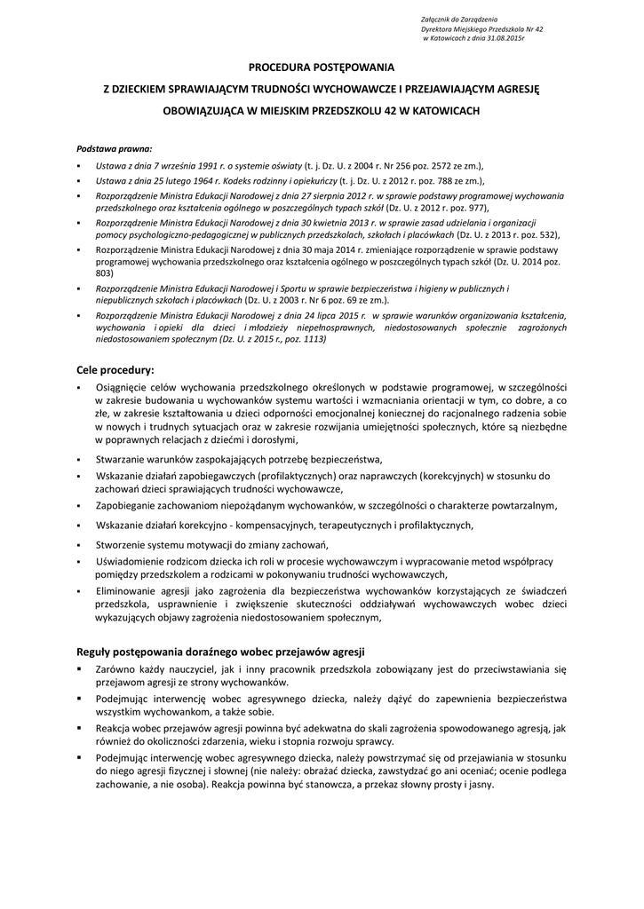 Załącznik do Zarządzenia Dyrektora Miejskiego Przedszkola Nr 42 w Katowicach z dnia 31.08.2015r PROCEDURA POSTĘPOWANIA Z DZIECKIEM SPRAWIAJĄCYM TRUDNOŚCI WYCHOWAWCZE I PRZEJAWIAJĄCYM AGRESJĘ OBOWIĄZUJĄCA W MIEJSKIM PRZEDSZKOLU 42 W KATOWICACH Podstawa prawna: Ustawa z dnia 7 września 1991 r. o systemie oświaty (t. j. Dz. U. z 2004 r. Nr 256 poz. 2572 ze zm.), Ustawa z dnia 25 lutego 1964 r. Kodeks rodzinny i opiekuoczy (t. j. Dz. U. z 2012 r. poz. 788 ze zm.), Rozporządzenie Ministra Edukacji Narodowej z dnia 27 sierpnia 2012 r. w sprawie podstawy programowej wychowania przedszkolnego oraz kształcenia ogólnego w poszczególnych typach szkół (Dz. U. z 2012 r. poz. 977), Rozporządzenie Ministra Edukacji Narodowej z dnia 30 kwietnia 2013 r. w sprawie zasad udzielania i organizacji pomocy psychologiczno-pedagogicznej w publicznych przedszkolach, szkołach i placówkach (Dz. U. z 2013 r. poz. 532), Rozporządzenie Ministra Edukacji Narodowej z dnia 30 maja 2014 r. zmieniające rozporządzenie w sprawie podstawy programowej wychowania przedszkolnego oraz kształcenia ogólnego w poszczególnych typach szkół (Dz. U. 2014 poz. 803) Rozporządzenie Ministra Edukacji Narodowej i Sportu w sprawie bezpieczeostwa i higieny w publicznych i niepublicznych szkołach i placówkach (Dz. U. z 2003 r. Nr 6 poz. 69 ze zm.). Rozporządzenie Ministra Edukacji Narodowej z dnia 24 lipca 2015 r. w sprawie warunków organizowania kształcenia, wychowania i opieki dla dzieci i młodzieży niepełnosprawnych, niedostosowanych społecznie zagrożonych niedostosowaniem społecznym (Dz. U. z 2015 r., poz. 1113) Cele procedury: Osiągnięcie celów wychowania przedszkolnego określonych w podstawie programowej, w szczególności w zakresie budowania u wychowanków systemu wartości i wzmacniania orientacji w tym, co dobre, a co złe, w zakresie kształtowania u dzieci odporności emocjonalnej koniecznej do racjonalnego radzenia sobie w nowych i trudnych sytuacjach oraz w zakresie rozwijania umiejętności społecznych, które są niezbędne w poprawnych relacjach z dziedmi i dorosłymi, Stwarzanie warunków zaspokajających potrzebę bezpieczeostwa, Wskazanie działao zapobiegawczych (profilaktycznych) oraz naprawczych (korekcyjnych) w stosunku do zachowao dzieci sprawiających trudności wychowawcze, Zapobieganie zachowaniom niepożądanym wychowanków, w szczególności o charakterze powtarzalnym, Wskazanie działao korekcyjno - kompensacyjnych, terapeutycznych i profilaktycznych, Stworzenie systemu motywacji do zmiany zachowao, Uświadomienie rodzicom dziecka ich roli w procesie wychowawczym i wypracowanie metod współpracy pomiędzy przedszkolem a rodzicami w pokonywaniu trudności wychowawczych, Eliminowanie agresji jako zagrożenia dla bezpieczeostwa wychowanków korzystających ze świadczeo przedszkola, usprawnienie i zwiększenie skuteczności oddziaływao wychowawczych wobec dzieci wykazujących objawy zagrożenia niedostosowaniem społecznym, Reguły postępowania doraźnego wobec przejawów agresji Zarówno każdy nauczyciel, jak i inny pracownik przedszkola zobowiązany jest do przeciwstawiania się przejawom agresji ze strony wychowanków. Podejmując interwencję wobec agresywnego dziecka, należy dążyd do zapewnienia bezpieczeostwa wszystkim wychowankom, a także sobie. Reakcja wobec przejawów agresji powinna byd adekwatna do skali zagrożenia spowodowanego agresją, jak również do okoliczności zdarzenia, wieku i stopnia rozwoju sprawcy. Podejmując interwencję wobec agresywnego dziecka, należy powstrzymad się od przejawiania w stosunku do niego agresji fizycznej i słownej (nie należy: obrażad dziecka, zawstydzad go ani oceniad; ocenie podlega zachowanie, a nie osoba). Reakcja powinna byd stanowcza, a przekaz słowny prosty i jasny. Użycie siły fizycznej jako środka przymusu jest ostatecznością w przypadku konieczności powstrzymania dziecka przed zadaniem ciosu innej osobie, w celu rozdzielenia bijących się dzieci czy pozbawienia dziecka niebezpiecznego przedmiotu, jeśli odmawia ono jego dobrowolnego oddania. Działaniom skierowanym na usunięcie bezpośredniego zagrożenia powinna towarzyszyd próba wyciszenia dziecka poprzez rozmowę, odwrócenie jego uwagi itp. Wychowankowie, przeciwko którym skierowana była agresja, powinni zostad otoczeni opieką, a w razie doznania przez nich krzywdy powinna im zostad udzielona pomoc. Osoba podejmująca interwencję, niebędąca wychowawcą grupy, do której uczęszcza agresywny wychowanek, informuje o zdarzeniu wychowawcę. Wychowawca przeprowadza rozmowę z dzieckiem agresywnym w celu wyjaśnienia powodów niewłaściwego zachowania. Fakt agresywnego zachowania dziecka powinien byd odnotowany w zeszycie korespondencji z rodzicami lub zgłoszony bezpośrednio rodzicowi odbierającemu w danym dniu dziecko z przedszkola. Reguły postępowania systemowego wobec dziecka sprawiającego trudności wychowawcze i przejawiającego agresję Nauczyciel ma obowiązek przeprowadzenia diagnozy sytuacji rodzinnej dzieci na początku każdego roku szkolnego. Wychowawca grupy w ramach działao profilaktycznych omawia z rodzicami wszystkich dzieci wzajemne relacje między przedszkolem a środowiskiem rodzinnym dziecka, obowiązki w zakresie współdziałania w procesie wychowawczym oraz zakres odpowiedzialności za zachowanie dziecka. Nauczyciel podejmuje systematyczne działania wychowawcze zmierzające do eliminacji trudności i rozwiązania problemów dziecka. W przypadku powtarzających się przejawów agresji i innych zachowao powodujących trudności wychowawcze nauczyciel przeprowadza z rodzicami dziecka rozmowę, w której omawia problem. Informuje ich o dotychczas podjętych działaniach ukierunkowanych na korekcję niepożądanych zachowao dziecka oraz o zaplanowanych działaniach wychowawczych. Zobowiązuje rodziców do współpracy w realizacji przedstawionych czynności i wskazuje zadania możliwe do podjęcia w środowisku r