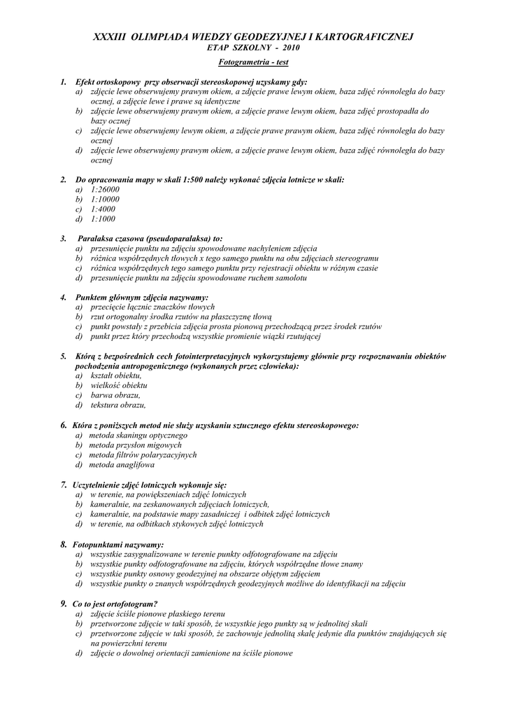 XXXIII OLIMPIADA WIEDZY GEODEZYJNEJ I KARTOGRAFICZNEJ ETAP SZKOLNY - 2010 Fotogrametria - test 1. Efekt ortoskopowy przy obserwacji stereoskopowej uzyskamy gdy: a) zdjęcie lewe obserwujemy prawym okiem, a zdjęcie prawe lewym okiem, baza zdjęć równoległa do bazy ocznej, a zdjęcie lewe i prawe są identyczne b) zdjęcie lewe obserwujemy prawym okiem, a zdjęcie prawe lewym okiem, baza zdjęć prostopadła do bazy ocznej c) zdjęcie lewe obserwujemy lewym okiem, a zdjęcie prawe prawym okiem, baza zdjęć równoległa do bazy ocznej d) zdjęcie lewe obserwujemy prawym okiem, a zdjęcie prawe lewym okiem, baza zdjęć równoległa do bazy ocznej 2. Do opracowania mapy w skali 1:500 należy wykonać zdjęcia lotnicze w skali: a) 1:26000 b) 1:10000 c) 1:4000 d) 1:1000 3. Paralaksa czasowa (pseudoparalaksa) to: a) przesunięcie punktu na zdjęciu spowodowane nachyleniem zdjęcia b) różnica współrzędnych tłowych x tego samego punktu na obu zdjęciach stereogramu c) różnica współrzędnych tego samego punktu przy rejestracji obiektu w różnym czasie d) przesunięcie punktu na zdjęciu spowodowane ruchem samolotu 4. Punktem głównym zdjęcia nazywamy: a) przecięcie łącznic znaczków tłowych b) rzut ortogonalny środka rzutów na płaszczyznę tłową c) punkt powstały z przebicia zdjęcia prosta pionową przechodzącą przez środek rzutów d) punkt przez który przechodzą wszystkie promienie wiązki rzutującej 5. Którą z bezpośrednich cech fotointerpretacyjnych wykorzystujemy głównie przy rozpoznawaniu obiektów pochodzenia antropogenicznego (wykonanych przez człowieka): a) kształt obiektu, b) wielkość obiektu c) barwa obrazu, d) tekstura obrazu, 6. Która z poniższych metod nie służy uzyskaniu sztucznego efektu stereoskopowego: a) b) c) d) metoda skaningu optycznego metoda przysłon migowych metoda filtrów polaryzacyjnych metoda anaglifowa 7. Uczytelnienie zdjęć lotniczych wykonuje się: a) b) c) d) w terenie, na powiększeniach zdjęć lotniczych kameralnie, na zeskanowanych zdjęciach lotniczych, kameralnie, na podstawie mapy zasadniczej i odbitek zdjęć lotniczych w terenie, na odbitkach stykowych zdjęć lotniczych 8. Fotopunktami nazywamy: a) b) c) d) wszystkie zasygnalizowane w terenie punkty odfotografowane na zdjęciu wszystkie punkty odfotografowane na zdjęciu, których współrzędne tłowe znamy wszystkie punkty osnowy geodezyjnej na obszarze objętym zdjęciem wszystkie punkty o znanych współrzędnych geodezyjnych możliwe do identyfikacji na zdjęciu 9. Co to jest ortofotogram? a) zdjęcie ściśle pionowe płaskiego terenu b) przetworzone zdjęcie w taki sposób, że wszystkie jego punkty są w jednolitej skali c) przetworzone zdjęcie w taki sposób, że zachowuje jednolitą skalę jedynie dla punktów znajdujących się na powierzchni terenu d) zdjęcie o dowolnej orientacji zamienione na ściśle pionowe 10. Celem aerotriangulacji jest: a) b) c) d) kameralne zagęszczenie osnowy fotogrametrycznej dla potrzeb orientacji bezwzględnej modeli określenie współrzędnych środków rzutów dostarczenie wszystkich danych dla wytworzenia ortofotomapy kameralne wyznaczenie współrzędnych terenowych punktów dla potrzeb Numerycznego Modelu Terenu 11. Układem tłowym zdjęcia fotogrametrycznego nazywamy: a) układ płaski, którego początek zaczepiony jest w punkcie nadirowym zdjęcia a osie są równoległe do łącznic znaczków tłowych b) układ płaski, którego początek zaczepiony jest w punkcie głównym zdjęcia a osie są równoległe do łącznic znaczków tłowych c) układ płaski zmaterializowany przez łącznice znaczków tłowych d) układ płaski, którego początek zaczepiony jest w punkcie izocentrycznym zdjęcia, a osie są równoległe do łącznic znaczków tłowych 12. Jeśli przestrzenny znaczek pomiarowy dotyka stereoskopowego modelu terenu to oznacza, że: a) usunięta została paralaksa poprzeczna b) wykonana została orientacja wzajemna i bezwzględna c) materializuje ten sam punkt na obydwu zdjęciach d) wykonana została orientacja wzajemna 13. Teledetekcję można zdefiniować jako: a) pomiar na autografie współrzędnych punktów stereoskopowego modelu terenu b) każdą metodę wykorzystywaną do zdalnego badania fizycznych i chemicznych cech obiektu c) wykonywanie zdjęć stereofotogrametrycznych obiektu, do którego brak bezpośredniego dostępu d) metodę badania zasobów ziemi przy wykorzystaniu światła spójnego 14. Poprawki ze względu na dystorsję wprowadza się na kierunku: a) z punktu izocentrycznego b) z punktu nadirowego c) z punktu głównego d) z punktu przyśrodkowego 15. Współczynnik kontrastowości materiału fotograficznego wynosi = 0.9. Czy tak oznaczony materiał będzie? a) bardzo twardy b) normalny c) twardy d) miękki 16. Do przeprowadzenia aerotriangulacji przestrzennej musimy mieć szeregi zdjęć o pokryciu: a) 20% b) 70% c) 60% d) 40% 17. Fotointerpretacja to: a) ocena jakości zdjęcia lotniczego b) pozyskiwanie informacji o obiekcie na podstawie zdjęć lotniczych c) obserwacje stereogramu pod stereoskopem d) przetwarzanie zdjęć oraz montaż fotomapy 18. Rozeta jest to: a) figura powstała przez połączenie liniami prostymi fotopunktów znajdujących się na zdjęciu fotogrametrycznym b) pęk kierunków wychodzących z punktu głównego zdjęcia do pozostałych punktów fototriangulacji c) podstawowa część triangulatora radialnego d) podstawowa figura fototriangulacji radialnej 19. W czasie lotu fotogrametrycznego statoskop ma za zadanie: a) wskazać wysokość lotu b) fotografować linię horyzontu c) utrzymać pionowe położenie osi optycznej kamery lotniczej d) ustalić różnicę wysokości lotu w stosunku do poziomu na jaki został ustawiony 20. Która z poniższych fotointerpretacyjnych cech rozpoznawczych nie jest cechą bezpośrednią? a) struktura obrazu b) fototon lub barwa c) tekstura obrazu d) cień własny i cień rzucany