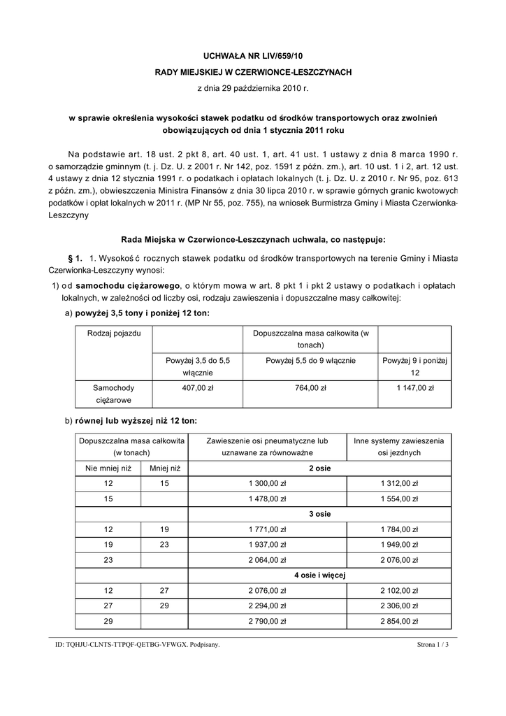 UCHWAŁA NR LIV/659/10 RADY MIEJSKIEJ W CZERWIONCE-LESZCZYNACH z dnia 29 października 2010 r. w sprawie określenia wysokości stawek podatku od środków transportowych oraz zwolnień obowiązujących od dnia 1 stycznia 2011 roku Na podstawie art. 18 ust. 2 pkt 8, art. 40 ust. 1, art. 41 ust. 1 ustawy z dnia 8 marca 1990 r. o samorządzie gminnym (t. j. Dz. U. z 2001 r. Nr 142, poz. 1591 z późn. zm.), art. 10 ust. 1 i 2, art. 12 ust. 4 ustawy z dnia 12 stycznia 1991 r. o podatkach i opłatach lokalnych (t. j. Dz. U. z 2010 r. Nr 95, poz. 613 z późn. zm.), obwieszczenia Ministra Finansów z dnia 30 lipca 2010 r. w sprawie górnych granic kwotowych podatków i opłat lokalnych w 2011 r. (MP Nr 55, poz. 755), na wniosek Burmistrza Gminy i Miasta CzerwionkaLeszczyny Rada Miejska w Czerwionce-Leszczynach uchwala, co następuje: § 1. 1. Wysokoś ć rocznych stawek podatku od środków transportowych na terenie Gminy i Miasta Czerwionka-Leszczyny wynosi: 1) o d samochodu ciężarowego, o którym mowa w art. 8 pkt 1 i pkt 2 ustawy o podatkach i opłatach lokalnych, w zależności od liczby osi, rodzaju zawieszenia i dopuszczalne masy całkowitej: a) powyżej 3,5 tony i poniżej 12 ton: Rodzaj pojazdu Dopuszczalna masa całkowita (w tonach) Powyżej 3,5 do 5,5 Powyżej 5,5 do 9 włącznie Powyżej 9 i poniżej włącznie Samochody 12 407,00 zł 1 147,00 zł 764,00 zł ciężarowe b) równej lub wyższej niż 12 ton: Dopuszczalna masa całkowita Zawieszenie osi pneumatyczne lub Inne systemy zawieszenia (w tonach) uznawane za równoważne osi jezdnych Nie mniej niż Mniej niż 12 15 2 osie 15 1 300,00 zł 1 312,00 zł 1 478,00 zł 1 554,00 zł 3 osie 12 19 1 771,00 zł 1 784,00 zł 19 23 1 937,00 zł 1 949,00 zł 2 064,00 zł 2 076,00 zł 23 4 osie i więcej 12 27 2 076,00 zł 2 102,00 zł 27 29 2 294,00 zł 2 306,00 zł 2 790,00 zł 2 854,00 zł 29 TQHJU-CLNTS-TTPQF-QETBG-VFWGX. Podpisany. Strona 1 / 3 2)ID:od ciągnika siodłowego lub balastowego, o których mowa w art. 8 pkt 3 i pkt 4 ustawy o podatkach i opłatach lokalnych, przystosowanych do używania łącznie z naczepą lub przyczepą o dopuszczalnej masie całkowitej zespołu pojazdów: a) od 3,5 tony i poniżej 12 ton: Rodzaj pojazdu Dopuszczalna masa całkowita zespołu pojazdów (w tonach) 12 27 2 076,00 zł 2 102,00 zł 27 29 2 294,00 zł 2 306,00 zł 2 790,00 zł 2 854,00 zł 29 2) od ciągnika siodłowego lub balastowego, o których mowa w art. 8 pkt 3 i pkt 4 ustawy o podatkach i opłatach lokalnych, przystosowanych do używania łącznie z naczepą lub przyczepą o dopuszczalnej masie całkowitej zespołu pojazdów: a) od 3,5 tony i poniżej 12 ton: Rodzaj pojazdu Dopuszczalna masa całkowita zespołu pojazdów (w tonach) Ciągniki siodłowe i balastowe Do 7 włącznie Powyżej 7 i poniżej 12 1 542,00 zł 1 746,00 zł b) równej lub wyższej niż 12 ton: Dopuszczalna masa całkowita zespołu pojazdów (w Zawieszenie osi pneumatyczne lub uznawane za równoważne tonach): ciągnik siodłowy + naczepa, ciągnik Inne systemy zawieszenia osi balastowy + przyczepa Nie mniej niż Mniej niż 2 osie 12 25 1 771,00 zł 1 796,00 zł 25 31 1 949,00 zł 2 000,00 zł 1 834,00 zł 2 205,00 zł 31 3 osie i więcej 12 40 40 2 153,00 zł 2 166,00 zł 2 790,00 zł 2 854,00 zł 3) o d przyczepy lub naczepy, o których mowa w art. 8 pkt 5 i pkt 6 ustawy o podatkach i opłatach lokalnych, z wyjątkiem związanych z działalnością rolniczą prowadzoną przez podatnika podatku rolnego, które łącznie z pojazdem silnikowym posiadają dopuszczalną masę całkowitą: a) od 7 ton i poniżej 12 ton: Rodzaj pojazdu Dopuszczalna masa całkowita przyczepy lub naczepy łącznie z pojazdem silnikowym od 7 ton i poniżej 12 ton przyczepy 319,00 zł i naczepy b) równą lub wyższą niż 12 ton: Dopuszczalna masa całkowita zespołu Zawieszenie osi pneumatyczne Inne systemy pojazdów :naczepa / przyczepa + pojazd silnikowy (w lub uznawane za równoważne zawieszenia osi tonach) Nie mniej niż Mniej niż 12 25 25 1 oś 293,00 zł 407,00 zł 407,00 zł 688,00 zł 2 osie 12 28 319,00 zł 395,00 zł 28 33 778,00 zł 1 070,00 zł 33 38 1 070,00 zł 1 631,00 zł 1 439,00 zł 2 128,00 zł 38 ID: TQHJU-CLNTS-TTPQF-QETBG-VFWGX. Podpisany. 12 38 38 3 osie i więcej Strona 2 / 3 854,00 zł 1 185,00 zł 1 147,00 zł 1 618,00 zł 4) od autobusu, o którym mowa w art. 8 pkt. 7 ustawy o podatkach i opłatach lokalnych, w zależności od liczby miejsc do siedzenia: 28 33 778,00 zł 1 070,00 zł 33 38 1 070,00 zł 1 631,00 zł 1 439,00 zł 2 128,00 zł 38 3 osie i więcej 12 38 38 854,00 zł 1 185,00 zł 1 147,00 zł 1 618,00 zł 4) od autobusu, o którym mowa w art. 8 pkt. 7 ustawy o podatkach i opłatach lokalnych, w zależności od liczby miejsc do siedzenia: Rodzaj pojazdu Autobusy Ilość miejsc do siedzenia (łącznie z miejscem dla kierowcy) Mniejsza niż 30 miejsc Równa lub wyższa niż 30 miejsc 981,00 zł 2 064,00 zł § 2. Zwalnia się z podatku od środków transportowych autobusy bez względu na ilość miejsc siedzących, służące wyłącznie do nieodpłatnego przewozu dzieci do placówek oświatowych położonych na terenie Gminy i Miasta Czerwionka-Leszczyny. § 3. Traci moc Uchwała Nr XLI/490/09 Rady Miejskiej w Czerwionce-Leszczynach z dnia 23 października 2009 r. w sprawie wysokości stawek podatku od środków transportowych oraz zwolnień obowiązujących od dnia 1 stycznia 2010 roku (Dz. Urz. Woj. Śl. z 2009 r. Nr 202, poz. 3710). § 4. Wykonanie uchwały powierza się Burmistrzowi Gminy i Miasta Czerwionka-Leszczyny. § 5. Uchwała wchodzi w życie po upływie 14 dni od ogłoszenia w Dzienniku Urzędowym Województwa Śląskiego, z mocą obowiązującą od dnia 1 stycznia 2011 r. Podlega ona podaniu do wiadomości mieszkańców w sposób zwyczajowo przyjęty na terenie gminy i miasta, tj. w gazecie lokalnej „Kurier” oraz tablicach ogłoszeń w siedzibie Urzędu i w poszczególnych sołectwach oraz dzielnicach. Przewodniczący Rady Miejski