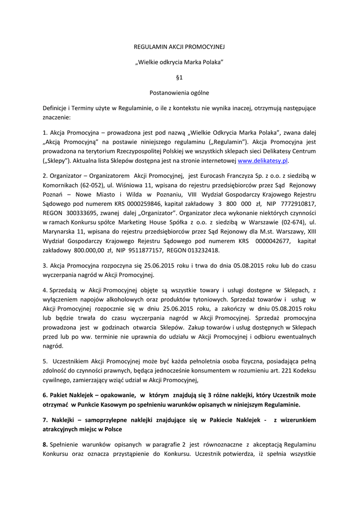 REGULAMIN AKCJI PROMOCYJNEJ „Wielkie odkrycia Marka Polaka” §1 Postanowienia ogólne Definicje i Terminy użyte w Regulaminie, o ile z kontekstu nie wynika inaczej, otrzymują następujące znaczenie: 1. Akcja Promocyjna – prowadzona jest pod nazwą „Wielkie Odkrycia Marka Polaka”, zwana dalej „Akcją Promocyjną” na postawie niniejszego regulaminu („Regulamin”). Akcja Promocyjna jest prowadzona na terytorium Rzeczypospolitej Polskiej we wszystkich sklepach sieci Delikatesy Centrum („Sklepy”). Aktualna lista Sklepów dostępna jest na stronie internetowej www.delikatesy.pl. 2. Organizator – Organizatorem Akcji Promocyjnej, jest Eurocash Franczyza Sp. z o.o. z siedzibą w Komornikach (62-052), ul. Wiśniowa 11, wpisana do rejestru przedsiębiorców przez Sąd Rejonowy Poznań – Nowe Miasto i Wilda w Poznaniu, VIII Wydział Gospodarczy Krajowego Rejestru Sądowego pod numerem KRS 0000259846, kapitał zakładowy 3 800 000 zł, NIP 7772910817, REGON 300333695, zwanej dalej „Organizator”. Organizator zleca wykonanie niektórych czynności w ramach Konkursu spółce Marketing House Spółka z o.o. z siedzibą w Warszawie (02-674), ul. Marynarska 11, wpisana do rejestru przedsiębiorców przez Sąd Rejonowy dla M.st. Warszawy, XIII Wydział Gospodarczy Krajowego Rejestru Sądowego pod numerem KRS 0000042677, kapitał zakładowy 800.000,00 zł, NIP 9511877157, REGON 013232418. 3. Akcja Promocyjna rozpoczyna się 25.06.2015 roku i trwa do dnia 05.08.2015 roku lub do czasu wyczerpania nagród w Akcji Promocyjnej. 4. Sprzedażą w Akcji Promocyjnej objęte są wszystkie towary i usługi dostępne w Sklepach, z wyłączeniem napojów alkoholowych oraz produktów tytoniowych. Sprzedaż towarów i usług w Akcji Promocyjnej rozpocznie się w dniu 25.06.2015 roku, a zakończy w dniu 05.08.2015 roku lub będzie trwała do czasu wyczerpania nagród w Akcji Promocyjnej. Sprzedaż promocyjna prowadzona jest w godzinach otwarcia Sklepów. Zakup towarów i usług dostępnych w Sklepach przed lub po ww. terminie nie uprawnia do udziału w Akcji Promocyjnej i odbioru ewentualnych nagród. 5. Uczestnikiem Akcji Promocyjnej może być każda pełnoletnia osoba fizyczna, posiadająca pełną zdolność do czynności prawnych, będąca jednocześnie konsumentem w rozumieniu art. 221 Kodeksu cywilnego, zamierzający wziąć udział w Akcji Promocyjnej, 6. Pakiet Naklejek – opakowanie, w którym znajdują się 3 różne naklejki, który Uczestnik może otrzymać w Punkcie Kasowym po spełnieniu warunków opisanych w niniejszym Regulaminie. 7. Naklejki – samoprzylepne naklejki znajdujące się w Pakiecie Naklejek atrakcyjnych miejsc w Polsce z wizerunkiem 8. Spełnienie warunków opisanych w paragrafie 2 jest równoznaczne z akceptacją Regulaminu Konkursu oraz oznacza przystąpienie do Konkursu. Uczestnik potwierdza, iż spełnia wszystkie warunki, które uprawniają go do udziału w Konkursie oraz zobowiązuje się do przestrzegania określonych w Regulaminie zasad. §2 Zasady uczestnictwa w Akcji Promocyjnej 1. W celu wzięcia udziału w Akcji Promocyjnej Uczestnik powinien zrobić zakupy w jednym ze Sklepów biorących udział w Akcji Promocyjnej, za min 25 zł brutto (słownie: dwadzieścia pięć), w ramach, których w pierwszej kolejności dokona zakupu Książki, określanej również jako Album, pod tytułem: „Wielkie Odkrycia Marka Polaka” w cenie 6 zł brutto, do której Uczestnik będzie mógł kolekcjonować i przyklejać Naklejki. 2. Uczestnik jest uprawniony do otrzymania jednej sztuki Pakietu Naklejek po uprzednim nabyciu Produktów za kwotę wynoszącą minimum 25 zł brutto (słownie: dwadzieścia pięć złotych brutto), podczas jednej transakcji potwierdzonej wydaniem paragonu fiskalnego w okresie trwania Akcji Promocyjnej. 3. W przypadku, w którym Uczestnik dokona jednorazowo zakupu w Sklepie, Produktów za wielokrotność kwoty 25 złotych brutto, Uczestnik uprawniony będzie do otrzymania jednej sztuki Pakietu Naklejek za każde wydane 25 zł brutto. 4. Maksymalna ilość Pakietów Naklejek, którą Uczestnik może otrzymać w Punkcie Kasowym w Sklepie za jednorazowy zakup Produktów wynosi 10 zgodnie z poniższą tabelą. 25,00 50,00 75,00 100,00 125,00 150,00 175,00 200,00 225,00 250,00 49,99 74,99 99,99 124,99 149,99 174,99 199,99 224,99 249,99 I WIĘCEJ 1 2 3 4 5 6 7 8 9 10 PAKIET PAKIETY PAKIETY PAKIETY PAKIETÓW PAKIETÓW PAKIETÓW PAKIETÓW PAKIETÓW PAKIETÓW 5. Uczestnik za zakup każdego jednego Produktu Specjalnego uprawniony będzie do otrzymania Pakietu Naklejek w ilości 1 sztuka. 6. Nie jest możliwe sumowanie wartości zakupu Produktów z więcej niż jednego paragonu fiskalnego w celu otrzymania Pakietu Naklejek. 7. Pakiety Naklejek będą wydawane przez kasjera wraz z paragonem fiskalnym. Po wydaniu Uczestnikowi Pakietów Naklejek kasjer dokona odpowiedniej adnotacji na paragonie fiskalnym. Późniejsze wydanie Pakietów Naklejek na podstawie paragonów lub innych dowodów dokonania transakcji nie jest możliwe. §3 Reklamacje 1. Każdemu Uczestnikowi Akcji Promocyjnej przysługuje prawo wniesienia pisemnej reklamacji w zakresie niezgodności przeprowadzenia Akcji Promocyjnej z niniejszym Regulaminem, w czasie jej trwania lub nie później niż w terminie 30 dni od daty jej zakończenia. Reklamacje wniesione po upływie powyższego terminu nie będą rozpatrywane. Za datę wniesienia reklamacji uważa się datę stempla pocztowego na przesyłce zawierającej reklamację. 2. Reklamacje należy składać w formie pisemnej, drogą pocztową na adres: Eurocash Franczyza Sp. z o.o., Szczepańcowa, ul. Przemysłowa 34, 38-457 Chorkówka z dopiskiem „Akcja promocyjna Wielkie Odkrycia Marka Polaka”. 3. Reklamacja musi zawierać dane personalne zgłaszającego reklamację (imię, nazwisko, dokładny adres wraz z kodem pocztowym reklamującego), przyczynę reklamacji, treść żądania reklamującego oraz opis okoliczności uzasadniających re