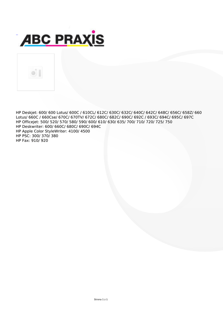 HP Deskjet: 600/ 600 Lotus/ 600C / 610CL/ 612C/ 630C/ 632C/ 640C/ 642C/ 648C/ 656C/ 658Z/ 660 Lotus/ 660C / 660Cse/ 670C/ 670TV/ 672C/ 680C/ 682C/ 690C/ 692C / 693C/ 694C/ 695C/ 697C HP Officejet: 500/ 520/ 570/ 580/ 590/ 600/ 610/ 630/ 635/ 700/ 710/ 720/ 725/ 750 HP Deskwriter: 600/ 660C/ 680C/ 690C/ 694C HP Apple Color StyleWriter: 4100/ 4500 HP PSC: 300/ 370/ 380 HP Fax: 910/ 920 Strona 1 z 1