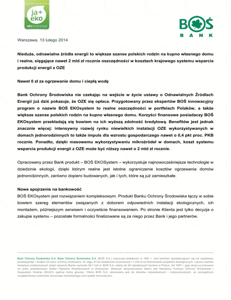 Warszawa, 13 lutego 2014 Nieduże, odnawialne źródła energii to większe szanse polskich rodzin na kupno własnego domu i realne, sięgające nawet 2 mld zł rocznie oszczędności w kosztach krajowego systemu wsparcia produkcji energii z OZE Nawet 0 zł za ogrzewanie domu i ciepłą wodę Bank Ochrony Środowiska nie czekając na wejście w życie ustawy o Odnawialnych Źródłach Energii już dziś pokazuje, że OZE się opłaca. Przygotowany przez ekspertów BOŚ innowacyjny program o nazwie BOŚ EKOsystem to realne oszczędności w portfelach Polaków, a także większe szanse polskich rodzin na kupno własnego domu. Korzyści finansowe posiadaczy BOŚ EKOsystem przekładają się bowiem na ich wyższą zdolność kredytową. Benefitów jest jednak znacznie więcej: intensywny rozwój rynku niewielkich instalacji OZE wykorzystywanych w domach jednorodzinnych to także impuls dla wzrostu gospodarczego nawet o 0,4 pkt proc. PKB rocznie. Ponadto, dzięki masowemu wykorzystywaniu mikroźródeł w domach, koszt systemu wsparcia produkcji energii z OZE może być niższy nawet o 2 mld zł rocznie. Opracowany przez Bank produkt – BOŚ EKOSystem – wykorzystuje najnowocześniejsze technologie w dziedzinie ekologii, dzięki którym realne jest istotne ograniczenie kosztów ogrzewania domów jednorodzinnych, zarówno dopiero budowanych, jak i tych, które są już zamieszkałe. Nowe spojrzenie na bankowość BOŚ EKOsystem jest rozwiązaniem kompleksowym. Produkt Banku Ochrony Środowiska łączy w sobie bowiem szereg elementów związanych z doborem odpowiednich instalacji ekologicznych, ich montażem, późniejszym serwisem i oczywiście finansowaniem. Po stronie Klienta jest tylko decyzja o zakupie systemu – pozostałe formalności finalizowane są za niego przez Bank i jego partnerów. Bank Ochrony Środowiska S.A. Bank Ochrony Środowiska S.A. (BOŚ S.A.) rozpoczął działalność w 1991 r. Jest bankiem specjalizującym się we wspieraniu przedsięwzięć i działań na rzecz ochrony środowiska. W ciągu 23 lat działalności przeznaczył 11 mld zł na finansowanie projektów ekologicznych. Łączna wartość inwestycji zrealizowanych dzięki wsparciu Banku wyniosła 38,7 mld zł. BOŚ S.A. należy do 20 największych banków w Polsce. Od 1997 r. jego akcje są notowane na rynku podstawowym Giełdy Papierów Wartościowych w Warszawie. Głównym akcjonariuszem banku jest Narodowy Fundusz Ochrony Środowiska i Gospodarki Wodnej (56,62% ogólnej liczby głosów). Oferta BOŚ S.A. skierowana jest do klientów indywidualnych i instytucjonalnych, ze szczególnym uwzględnieniem jednostek samorządu terytorialnego oraz spółek komunalnych. - Wychodzimy daleko poza obszar tradycyjnej bankowości. Stawiamy na zaspokojenie potrzeb klienta oferując mu kompletny produkt. Finansowanie jest tu tylko jednym z elementów – mówi Mariusz Klimczak, Prezes Banku Ochrony Środowiska. Sercem BOŚ EKOsystemu jest hybrydowy system grzewczy, który składa się z: niewielkiego gabarytowo modułu kotłowego (o wielkości średniej szafy) instalowanego w domu, czy garażu, paneli słonecznych oraz pompy ciepła. Równie istotnym elementem jest mikroelektrownia słoneczna, czyli ogniwa fotowoltaiczne montowane na zewnątrz (np. na dachu domu). Współpraca wszystkich tych urządzeń w ramach BOŚ EKOsystem pozwala na radykalne obniżenie kosztów ogrzewania. Potrzeby cieplne gospodarstwa domowego zaspokaja pompa ciepła, a niezbędną dla jej pracy energię elektryczną bilansuje instalacja fotowoltaiczna.. Dodatkowym wsparciem systemu są panele słoneczne służące do podgrzewania wody. Optymalizacji produkcji i rozdziału ciepła służy system sterowania. Rachunki spadają, zdolność kredytowa rośnie Rozwiązanie BOŚ EKOsystem pozwala obniżyć rachunki za ogrzewanie, i zmniejszyć koszty ponoszone przez mieszkającą w średniej wielkości domu czteroosobową rodzinę, nawet do 0 zł miesięcznie. W porównaniu z kosztami generowanymi przez instalację opartą na węglu, gazie ziemnym, propanie-butanie, czy oleju opałowym i wykorzystywanymi w takim samym domu, pozwala to na uzyskanie oszczędności przekraczających, w odniesieniu do oleju opałowego, nawet 8 tys. złotych w skali roku. Obniżenie miesięcznych wydatków za ogrzewanie ma także bezpośredni wpływ na zdolność kredytową. Dzięki temu minimalny wymagany dochód rodziny ubiegającej się o kredyt na dom, może być nawet o kilkaset złotych niższy. W przypadku kredytowania budowy domu o powierzchni ok. 100 m2 wraz z zainstalowanym w nim systemem grzewczym, zgodnie z szacunkami BOŚ, ta sama czteroosobowa rodzina, która wybierze np. ogrzewanie olejowe, może liczyć na niewiele ponad 170 tys. zł 30-letniego kredytu hipotecznego. Gdy w grę wchodziłby gaz ziemny jej maksymalna zdolność rośnie do ok. 200 tys. zł. Wybór BOŚ Ekosystem próg ten podnosi do ponad 270 tys. zł. Bank Ochrony Środowiska S.A. Bank Ochrony Środowiska S.A. (BOŚ S.A.) rozpoczął działalność w 1991 r. Jest bankiem specjalizującym się we wspieraniu przedsięwzięć i działań na rzecz ochrony środowiska. W ciągu 23 lat działalności przeznaczył 11 mld zł na finansowanie projektów ekologicznych. Łączna wartość inwestycji zrealizowanych dzięki wsparciu Banku wyniosła 38,7 mld zł. BOŚ S.A. należy do 20 największych banków w Polsce. Od 1997 r. jego akcje są notowane na rynku podstawowym Giełdy Papierów Wartościowych w Warszawie. Głównym akcjonariuszem banku jest Narodowy Fundusz Ochrony Środowiska i Gospodarki Wodnej (56,62% ogólnej liczby głosów). Oferta BOŚ S.A. skierowana jest do klientów indywidualnych i instytucjonalnych, ze szczególnym uwzględnieniem jednostek samorządu terytorialnego oraz spółek komunalnych. Pakiet benefitów jest dużo większy Zastosowanie nowoczesnych eko rozwiązań zwiększa także komfort życia rodziny, bezpieczeństwo (znikają problemy związane z zatruciem czadem, wybuchem 