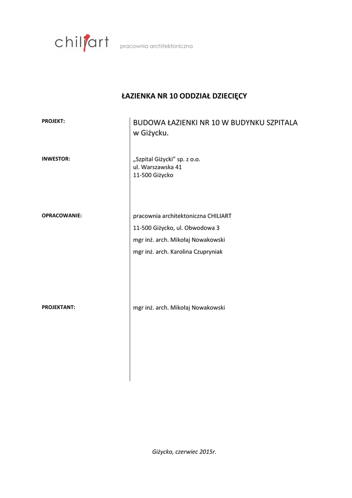 pracownia architektoniczna ŁAZIENKA NR 10 ODDZIAŁ DZIECIĘCY PROJEKT: BUDOWA ŁAZIENKI NR 10 W BUDYNKU SZPITALA w Giżycku. INWESTOR: „Szpital Giżycki” sp. z o.o. ul. Warszawska 41 11-500 Giżycko OPRACOWANIE: pracownia architektoniczna CHILIART 11-500 Giżycko, ul. Obwodowa 3 mgr inż. arch. Mikołaj Nowakowski mgr inż. arch. Karolina Czupryniak PROJEKTANT: mgr inż. arch. Mikołaj Nowakowski Giżycko, czerwiec 2015r. pracownia architektoniczna www.chiliart.pl OPIS PROJEKTU 1. Informacje ogólne. Przedmiotem niniejszego opracowania jest przygotowanie dokumentacji projektowej budowy łazienki nr 10 znajdującej się w budynku głównym Szpitala w Giżycku. 2. Podstawy opracowania. • zlecenie inwestora na opracowanie dokumentacji, • wizja lokalna, • obowiązujące normy i przepisy. 3. Inwentaryzacja Obszar opracowania obejmuje dwie istniejące sale chorych. W każdej z nich znajduje się wanienka do kąpania niemowląt. W jednej z sal znajduje się umywalka. W każdej sali znajduje się lampa sufitowa oraz lampa ścienna. Pod oknami umieszczone są grzejniki. W jednej z sal podłoga wyłożona jest terakota, w drugiej wykładzina winylową. Ściany częściowo pokryte glazurą. 4. Charakterystyka istniejących obiektów. Poniższa dokumentacja projektowa przedstawia plan budowy łazienki nr 10 celem dostosowania jednej z sal do pełnienia funkcji izolatki. Pomieszczenie to znajduje się w budynku głównym, który wchodzi w skład kompleksu zabudowań szpitalnych. Budynek główny jest obiektem trzykondygnacyjnym, podpiwniczonym. 5. Charakterystyka projektowa. Projektowana izolatka (sala z łazienką) zostaną wyposażone w sprzęt zgodnie z obowiązującym rozporządzeniem. 5.1. Pomieszczenie pobytu pacjenta Pomieszczenie należy wyposażyć w łóżko szpitalne dostępne z trzech stron, w tym z dwóch dłuższych. 5.2. Pomieszczenie higieniczno - sanitarne Pomieszczenie należy wyposażyć w umywalkę z bateria uruchamianą bez kontaktu z dłonią oraz dozownik ze środkiem dezynfekcyjnym uruchamiany bez kontaktu z dłonią. Zakłada się wykorzystanie kaczek i basenów wielorazowego użycia w zawiązku z czym łazienkę należy wyposażyć w płuczkę – dezynfektor np. KEN A/A model 731 lub Steelco model BP 100 HSER. Ponadto łazienka powinna posiadać natrysk, miskę ustępową, pojemnik z ręcznikami jednorazowego użycia oraz pojemnik na zużyte ręczniki. 5.3. Śluza umywalkowo – fartuchowa Pomieszczenie musi zostać wyposażone w umywalkę z baterią uruchamianą bez kontaktu z dłonią, dozownik do mydła w płynie, dozownik ze środkiem dezynfekcyjnym uruchamiany bez kontaktu z dłonią, pojemnik z ręcznikami jednorazowego użytku oraz pojemnik na zużyte ręczniki. Śluza musi zostać wyposażona w mebel posiadający trzy oddzielne, zamykane strefy: na brudna bieliznę, na ubrania czyste, na ubrania brudne. Giżycko, ul. Obwodowa 3, tel. (+48) 601 690 584 pracownia architektoniczna www.chiliart.pl 5.4. Instalacje Należy przystosować istniejącą sieć wodno – kanalizacyjną, tak aby możliwy był montaż płuczki – dezynfektora, umywalki, miski ustępowej oraz kabiny prysznicowej z baterią zgodnie z rysunkiem projektu. Należy przystosować istniejącą sieć elektryczną, tak aby możliwy był montaż lamp i włączników oraz płuczki - dezynfektora zgodnie z rysunkiem projektu. Należy przebudować istniejącą instalację tlenową aby możliwe było przełożenie wyjścia tlenu w okolicy łóżka zgodnie z rysunkiem projektu. Konieczne jest zapewnienie odpowiedniej wentylacji pomieszczeń. Zaleca się analizę możliwości zmiany przyłączy, sprawdzając realny przebieg instalacji, wykonując prace odkrywkowe. Wszystkie stosowane elementy muszą posiadać niezbędne atesty pozwalające na wykorzystanie ich w pomieszczeniach sanitarnych szpitali 6. Wymagania dotyczące wykończenia wnętrz. • Ściany i sufity. Powierzchnie ścian i sufitów w łazience powinny być gładkie, bez uszkodzeń i szczelin, zabezpieczone przed kondensacją pary oraz wzrostem pleśni. Ściany pokryć płytkami ściennymi, łatwo zmywalnymi, nienasiąkliwymi, nietoksycznymi, odpornymi na działanie wilgoci, do wysokości 2 m. Zastosować fugi na bazie żywic reaktywnych (RG). Narożniki ścian przy ciągach komunikacyjnych powinny być zabezpieczone przed uszkodzeniami mechanicznymi. Sufity i zamocowane przy suficie elementy muszą być wykonane w taki sposób, aby zapobiegać gromadzeniu się brudu i ograniczać kondensację pary oraz wzrost pleśni. Preferowane są jasne kolory ścian i sufitów. Powierzchnie ścian i sufitów w pozostałych pomieszczeniach powinny być gładkie, bez uszkodzeń i szczelin, zabezpieczone przed kondensacją pary oraz wzrostem pleśni w jasnych kolorach. Sufity i zamocowane przy suficie elementy muszą być wykonane w taki sposób, aby zapobiegać gromadzeniu się brudu. • Podłogi. Podłoga w łazience musi być utrzymana w dobrym stanie, łatwa do czyszczenia oraz do dezynfekcji. Podłogę pokryć płytkami podłogowymi antypoślizgowymi R10, nieprzepuszczającymi, nienasiąkliwymi, zmywalnymi i nietoksycznymi, fugi na bazie żywic reaktywnych (RG). Preferowany jest jasny kolor podłogi. Podłoga w pozostałych pomieszczeniach musi być utrzymana w dobrym stanie, łatwa do czyszczenia oraz do dezynfekcji. Pokryta materiałem nienasiąkliwym, zmywalnym, nietoksycznym w kolorze jasnym. • Drzwi. Powinny posiadać otwór lub szczelinę wentylacyjną, mieć powierzchnię gładką, dostosowaną do zmywania wodą. Próg (łączenie różnych nawierzchni) powinien być metalowy lub obity blachą. W opracowaniu wskazano otwór drzwiowy. • Wytyczne przeciwpożarowe. Szerokość drzwi wejściowych i kierunek ich otwierania powinien spełniać wymogi odpowiednich przepisów ochrony przeciwpożarowej i ewakuacji. Należy przewidzieć oświetlenie awaryjne w korytarzu i przy drzwiach. Wszystkie stosowane elementy muszą posiadać niezbędne ate