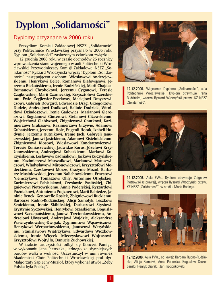 Dyplom „Solidarności” Dyplomy przyznane w 2006 roku Prezydium Komisji Zakładowej NSZZ „Solidarność” przy Politechnice Wrocławskiej przyznało w 2006 roku Dyplom „Solidarności” zasłużonym członkom związku. 12 grudnia 2006 roku w czasie obchodów 25 rocznicy wprowadzenia stanu wojennego w auli Politechniki Wrocławskiej Przewodniczący Komisji Zakładowej NSZZ „Solidarność” Ryszard Wroczyński wręczył Dyplom „Solidarności” następującym osobom: Wiesławowi Andrzejewskiemu, Henrykowi Belce, Romanowi Białowąsowi, Jerzemu Bieżuńskiemu, Irenie Budzińskiej, Marii Chajdas, Romanowi Chrobokowi, Jerzemu Cyganowi, Teresie Czajkowskiej, Marii Czarneckiej, Krzysztofowi Czerskiemu, Ewie Czyjlewicz-Przekwas, Maciejowi Dmyszewiczowi, Gabrieli Dowgird, Edwardzie Drąg, Grzegorzowi Dudzie, Andrzejowi Dudkowi, Halinie Dudziak, Witoldowi Dziadoszowi, Irenie Gadowicz, Marianowi Gieroszowi, Bogdanowi Ginterowi, Stefanowi Giżewskiemu, Wojciechowi Glabiszowi, Zbigniewowi Gnutkowi, Kazimierzowi Grabasowi, Kazimierzowi Grzywie, Adamowi Gubańskiemu, Jerzemu Hole, Eugenii Horak, Izabeli Hudymie, Jerzemu Hutnikowi, Irenie Jach, Gabryeli Januszewskiej, Janowi Jasickiemu, Adamowi Kisielnickiemu, Zbigniewowi Kłosowi, Wiesławowi Kondratowiczowi, Teresie Koniaszewskiej, Jadwidze Korus, Józefowi Krzyżanowskiemu, Andrzejowi Kubackiemu, Markowi Kurzyńskiemu, Lesławowi Ładniakowi, Jackowi Łuczyńskiemu, Kazimierzowi Marszałkowi, Marianowi Matusewiczowi, Władysławowi Mironowiczowi, Krzysztofowi Modeckiemu, Czesławowi Morze, Grażynie Mozol, Barbarze Musiołowskiej, Jerzemu Nalichowskiemu, Ernestowi Niemczykowi, Tomaszowi Ohly, Antoninie Otrębskiej, Kazimierzowi Pabisiakowi, Czesławie Pasińskiej, Zbigniewowi Piotrowskiemu, Annie Poderskiej, Ryszardowi Poźniakowi, Antoniemu Prajznerowi, Marii Rabiedze, Janinie Renek, Genowefie Rosiek, Zbigniewowi Ruckiemu, Barbarze Rudno-Rudzińskiej, Alicji Samołyk, Leszkowi Senickiemu, Irenie Skibińskiej, Dariuszowi Stysiowi, Krystynie Syczewskiej, Henrykowi Szarskiemu, Bogusławowi Szczepańskiemu, Janowi Trzcionkowskiemu, Andrzejowi Ubyszowi, Andrzejowi Wajdzie, Aleksandrze Wawrzynkowskiej-Dwojak, Zygmuntowi Wąsowiczowi, Henrykowi Werpachowskiemu, Januszowi Weryńskiemu, Stanisławowi Wiatrzykowi, Edwardowi Wiczkowskiemu, Irenie Więcek, Mieczysławowi Wojtasowi, Krzysztofowi Wojtyłło, Danucie Żuchowskiej. W trakcie uroczystości odbył się Koncert Pamięci w wykonaniu Jana Pietrzaka, jednego ze słynniejszych bardów walki o wolność. Uczestniczył w nim również Akademicki Chór Politechniki Wrocławskiej pod dyr. Małgorzaty Sapiechy-Muzioł, który wykonał utwór „Żeby Polska była Polską”. 1 12.12.2006. Wrêczenie Dyplomu „Solidarnoœci”, aula Politechniki Wroc³awskiej. Dyplom otrzymuje Irena Budziñska, wrêcza Ryszard Wroczyñski przew. KZ NSZZ „Solidarnoœæ”. 12.12.2006. Aula PWr., Dyplom otrzymuje Zbigniew Piotrowski (z prawej), wrêcza Ryszard Wroczyñski przew. KZ NSZZ „Solidarnoœæ”; w œrodku Maria Rabiega. 12.12.2006. Aula PWr., od lewej: Barbara Rudno-Rudziñska, Alicja Samo³yk, Anna Poderska, Bogus³aw Szczepañski, Henryk Szarski, Jan Trzcionkowski. DYPLOM „SOLIDARNOŒCI” 12.12.2006. Aula PWr., od lewej: Teresa Koniaszewska, Jan Jasicki, Józef Krzy¿anowski, Andrzej Kubacki. 12.12.2006. Aula PWr., od lewej: W³adys³aw Mironowicz, Antonina Otrêbska, Czes³aw Mora, Jerzy Nalichowski, Ernest Niemczyk. 12.12.2006. Aula PWr., od lewej: Gabryela Januszewska, Wies³aw Kondratowicz, Adam Kisielnicki, Teresa Koniaszewska. 12.12.2006. Aula PWr., od lewej: Henryk Belka, Maciej Dmyszewicz, syn Romana Bia³ow¹sa, Krzysztof Czerski, Jerzy Cygan. 12.12.2006. Aula PWr., od lewej: Zbigniew Rucki, Ryszard PoŸniak, Czes³awa Pasiñska, Maria Rabiega, Zbigniew Piotrowski. 12.12.2006. Aula PWr., od lewej: Andrzej Dudek, Bogdan Ginter, Witold Dziadosz, Marian Gierosz, Eugenia Horak. Wroc³aw, grudzieñ 2006 Opracowa³a: Jadwiga Szymonik 2
