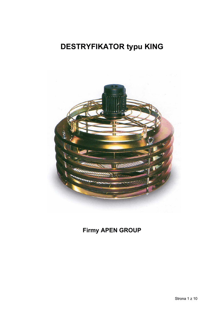 DESTRYFIKATOR typu KING Firmy APEN GROUP Strona 1 z 10 Odśrodkowy docisk powietrza Typu KING Urządzenie typu King, nazywane nieraz również destryfikatorem powietrza wyglądem przypominające swoistego rodzaju wentylator przeznaczone jest do ujednolicania temperatury powietrza i wilgotności, w układzie poziomym i pionowym ogrzewanego obiektu. Zaprojektowane i rozmieszczone w odpowiedni sposób, może spowodować oszczędności energii potrzebnej do ogrzania konkretnego obiektu, nawet do 30%. Uwaga! K 75 i K 100 są oznaczeniami modeli W obiektach o dużej kubaturze i wysokości powyżej 4 metrów, zwłaszcza tam gdzie mamy do czynienia ze słabo ocieplonymi stropami, stosując dociski powietrza doprowadza się do jednolitego wymieszania warstw powietrza wewnątrz obiektu. Pracujące dociski w sposób kontrolowany zasysają ogrzane powietrze unoszące się w kierunku stropu, po czym w sposób promienisty rozprowadzają go całym obiekcie, zachowując równowagę termiczną na całej powierzchni obiektu. W ten sposób, ograniczając dyspersję termiczną przy jednoczesnym wykorzystaniu ciepła wytworzonego przez inne źródła, KING Strona 2 z 10 redukuje zapotrzebowanie energetyczne obiektu, jakie występuje zwykle z tytułu strat przez słabo ocieplony strop. Schemat przedstawiający wysokości instalowania docisków typu KING. Kolor czerwony: właściwy dla modelu K 75 Kolor zielony: właściwy dla modelu K 100 Docisk powietrza zainstalowany w słabo izolowanym pomieszczeniu, w okresie letnim rozwiązuje w bardzo dobry sposób problemy wynikłe z warunków panujących w takim pomieszczeniu. Wysokie temperatury, wysoki stopień wilgotności, generalnie słaba wentylacja a tym samych koncentracja rozmaitych zapachów, stwarzają trudny do zniesienia mikroklimat. Stąd też, sprawnie funkcjonujący system docisków powietrza przyspieszy usunięcie powietrza z wewnątrz wspomagając wentylację grawitacyjną oraz zapewni szybszy napływ powietrza z zewnątrz poprzez otwory wentylacyjne. Dokładne i szybkie wymieszanie powietrza wewnętrznego z powietrzem zewnętrznym stworzy natychmiast zauważalną poprawę mikroklimatu wewnątrz obiektu, Strona 3 z 10 a sposób jego dystrybucji wewnątrz wentylowanego pomieszczenia, nie dopuści do powstawania dokuczliwych przeciągów. Schemat przedstawia wysokość instalowania odśrodkowego docisku powietrza typu KING, od której zależy obszar jaki pokrywa swoim działaniem urządzenie. Kolor czerwony: właściwy dla modelu K 75 Kolor zielony: właściwy dla modelu K 100 Kolory: żółty i niebieski: krańcowy zasięg działania pokrycie powierzchni czerwony i zielony: idealne EFEKTY PŁYNĄCE Z ZASTOSOWANIA DOCISKÓW POWIETRZA typu KING - OKRES ZIMOWY redukcja zapotrzebowania mocy cieplnej do 30%, redukcja wilgotności o ponad 20% wewnątrz danego obiektu, poprawa mikroklimatu mającego wpływ na samopoczucie ludzi pracujących wewnątrz obiektu oraz ograniczenie procesu korozji urządzeń i konstrukcji budowlanych. OKRES LETNI wspomaganie, w sposób natychmiastowo odczuwalny, systemu wentylacji grawitacyjnej obiektu, redukcja wilgotności względnej obiektu o ponad 20%, ograniczenie koncentracji zapachów, dymów, itp. o ponad 50%. Strona 4 z 10 Zespół odśrodkowych docisków typu KING zainstalowanych w hali obiektu przemysłowego. Urządzenia sterowane nadrzędnym systemem zarządzania gospodarką energetyczną w czasie rzeczywistym, współpracują z systemem ogrzewania nadmuchem ciepłego powietrza. INSTRUKCJA INSTALACJI Wentylator dociskowy KING dostarczany jest jako urządzenie ze zmiennym kierunkiem obrotów, ustawionym fabrycznie. Strzałka czerwona lub zielona znajdująca się na urządzeniu lub jego opakowaniu, oznacza kierunek obrotów urządzenia. Dodatkowo tabliczka znamionowa zawiera litery R lub V. Stąd też, zielona strzałka oraz litera V oznaczają kierunek obrotów zgodny z ruchem wskazówek zegara, podczas gdy strzałka czerwona i litera R informują o kierunku obrotów odwrotnym do ruchu wskazówek zegara. Ma to ważne znaczenie, ponieważ prawidłowa organizacja ruchu powietrza w ogrzewanym obiekcie, gdzie planuje się zamontowanie więcej niż 2 parzystych ilości wentylatorów dociskowych, zależy od prawidłowości zainstalowania urządzeń a te z kolei należy instalować zgodnie z zasadami pozycji na szachownicy, gdzie kierunek obrotu ma decydujące znaczenie ( patrz rysunek na stronie nr 6 ). Strona 5 z 10 Zielony Czerwony V zgodnie z ruchem wskazówek zegara R odwrotnie do ruchu wskazówek zegara Czerwony Zielony R odwrotnie do ruchu wskazówek zegara V zgodnie z ruchem wskazówek zegara Aranżacja urządzeń według kierunku obrotu, w przypadku gdy parzysta ilość urządzeń jest większa niż dwa ( 2 ). Czerwony Zielony Czerwony R odwrotnie do ruchu wskazówek zegara V zgodnie z ruchem wskazówek zegara R odwrotnie do ruchu wskazówek zegara Aranżacja urządzeń według kierunku obrotu, w przypadku instalowania nieparzystej ilości Zastosowanie: Hale obiektów przemysłowych, laboratoria, magazyny materiałów, obiekty sportowe, pomieszczenia hodowlane. i zadaszone składy Strona 6 z 10 Destryfikatory KING w szklarni Destryfikatory KING w obiektach hodowlanych Strona 7 z 10 DANE TECHNICZNE MODEL K 75 K 100 200 300 Moc W Częstotliwość Hz 50 50 Napięcie V 230/400 230/400 trójfazowe trójfazowe 1,7/1,0 1,7/1,0 IP44 IP44 osiowy osiowy Zasilanie Pobór prądu A Stopień ochrony Typ wentylatora Ilość łopatek wirnika Wydajność powietrza 2 4 m³/h 7500 10000 obr/min 700 700 Promień działania m. 7 9 Pole działania m² 200 300 Prędkość obrotowa Strona 8 z 10 Maks. wys. zawieszenia m. 6 12 Maks. wys. hali m. 8 18 Poziom hałasu dbA 30 30 Średnica mm 680 680 Wysokość mm 500 500 kg 16 18 Masa Uwaga! Sposób montażu jego podłączenie elektryczne i sterowanie, powinno zostać bezwzględnie przeprowadzone przez wykwalifikowany personel. Strona 9 z 10