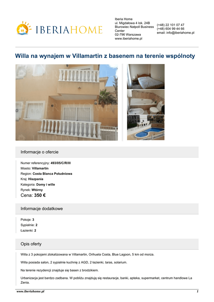 Iberia Home ul. Migdałowa 4 lok. 24B (+48) 22 101 07 47 Biurowiec Natpoll Business (+48) 604 99 44 66 Center email: [email protected] 02-796 Warszawa www.iberiahome.pl Willa na wynajem w Villamartin z basenem na terenie wspólnoty Informacje o ofercie Numer referencyjny: 493/05/C/R/III Miasto: Villamartin Region: Costa Blanca Południowa Kraj: Hiszpania Kategoria: Domy i wille Rynek: Wtórny Cena: 350 € Informacje dodatkowe Pokoje: 3 Sypialnie: 2 Łazienki: 2 Opis oferty Willa z 3 pokojami zlokalizowana w Villamartin, Orihuela Costa, Blue Lagoon, 5 km od morza. Willa posiada salon, 2 sypialnie kuchnię z AGD, 2 łazienki, taras, solarium. Na terenie rezydencji znajduje się basen z brodzikiem. Urbanizacja jest bardzo zadbana. W pobliżu znajdują się restauracje, banki, apteka, supermarket, centrum handlowe La Zenia. www.iberiahome.pl 1 Powierzchnia mieszkalna: 90m2 Ceny za wynajem na 1 tydzień: Maj: 350 EUR Czerwiec: 400 EUR Lipiec: 450 EUR Sierpień: 450 EUR Wrzesień: 400 EUR Udogodnienia ● Basen wspólnoty ● Taras ● Umeblowany ● Klimatyzacja www.iberiahome.pl 2