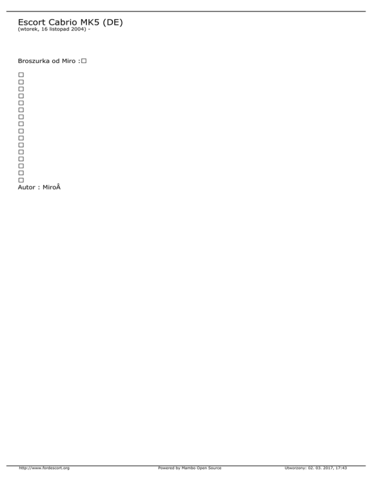 Escort Cabrio MK5 (DE) (wtorek, 16 listopad 2004) - Broszurka od Miro : Autor : Miro http://www.fordescort.org Powered by Mambo Open Source Utworzony: 02. 03. 2017, 17:43