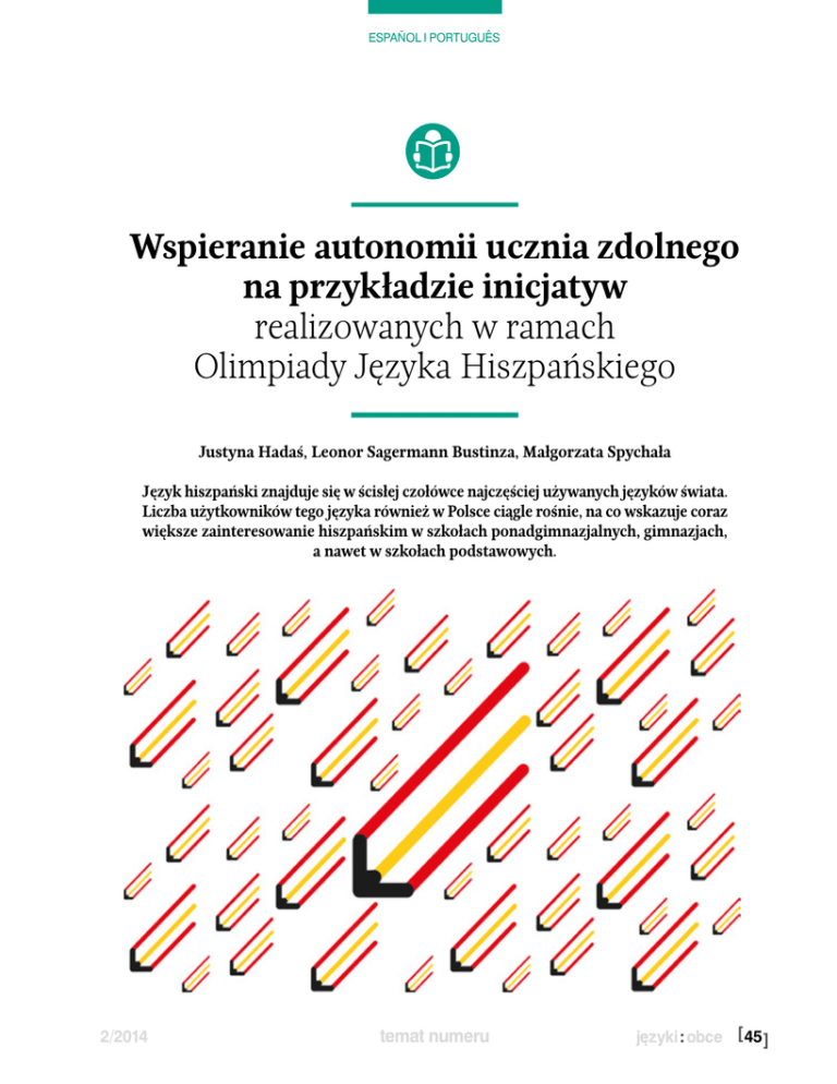 español i português Wspieranie autonomii ucznia zdolnego na przykładzie inicjatyw realizowanych w ramach Olimpiady Języka Hiszpańskiego Justyna Hadaś, Leonor Sagermann Bustinza, Małgorzata Spychała Język hiszpański znajduje się w ścisłej czołówce najczęściej używanych języków świata. Liczba użytkowników tego języka również w Polsce ciągle rośnie, na co wskazuje coraz większe zainteresowanie hiszpańskim w szkołach ponadgimnazjalnych, gimnazjach, a nawet w szkołach podstawowych. 2/2014 temat numeru [ 45 ] español i português D ane statystyczne i inne informacje dotyczące potrzeb edukacyjnych związanych z językiem hiszpańskim w Polsce wpłynęły na decyzję o organizacji ogólnopolskiej Olimpiady Języka Hiszpańskiego. Niniejszy artykuł ma na celu prezentację tego przedsięwzięcia ze szczególnym naciskiem na to, że olimpiada nie musi i nie powinna kończyć się wyłącznie na organizacji zawodów. Olimpiada może też skutecznie wspierać uczniów w przygotowaniu do kolejnych etapów konkursu. Jednym z najważniejszych aspektów tych przygotowań jest zaś samodzielna praca uczniów, dlatego organizatorzy olimpiady przywiązują szczególną wagę do rozwoju autonomii uczniowskiej. Charakterystyka olimpiady i jej uczestników Olimpiada Języka Hiszpańskiego (dalej: OJH) w latach 2010-2013 odbywała się w ramach projektu pt. Opracowanie i wdrożenie kompleksowego systemu pracy z uczniem zdolnym. Zadaniem projektu było wypracowanie nowatorskich rozwiązań dotyczących organizacji olimpiad oraz przeprowadzenia pilotażowych konkursów w latach szkolnych 2010/2011, 2011/2012, 2012/2013. Projekt koordynował Ośrodek Rozwoju Edukacji, a współfinansowany był on przez Unię Europejską w ramach Europejskiego Funduszu Społecznego. Obecnie OJH jest realizowana ze środków otrzymanych od Ministerstwa Edukacji Narodowej na lata 2013-2016. Główne cele olimpiady to: yy budzenie i rozwijanie wśród uczniów szkół ponadgimnazjalnych zainteresowania językiem hiszpańskim; yy rozszerzenie zakresu i podniesienie poziomu wiedzy uczniów o krajach hiszpańskiego obszaru językowego; yy lepsze przygotowanie uczniów do podejmowania dalszego kształcenia w szkołach wyższych; yy rozwijanie pasji i kształtowania umiejętności samodzielnego zdobywania wiedzy oraz stymulowania aktywności poznawczej młodzieży uzdolnionej; yy rozszerzenie współdziałania nauczycieli akademickich z nauczycielami szkół ponadgimnazjalnych w procesie kształcenia i wychowania młodzieży uzdolnionej; yy stwarzanie młodzieży możliwości szlachetnego współzawodnictwa w rozwijaniu swoich uzdolnień, a nauczycielom – warunków twórczej pracy z młodzieżą; yy doskonalenie form i metod pracy nauczycieli z młodzieżą uzdolnioną; [ 46 ] Olimpiada adresowana jest do uczniów szkół ponadgimnazjalnych, ale mogą w niej również uczestniczyć – w uzasadnionych przypadkach – uczniowie gimnazjów, w których nauczany jest język hiszpański, oraz uczniowie realizujący indywidualny program lub tok nauki. yy współpraca młodzieży uzdolnionej ze studentami filologii hiszpańskiej oraz z uczniami liceów w krajach hiszpańskojęzycznych. Olimpiadę Języka Hiszpańskiego organizuje Polskie Towarzystwo Neofilologiczne z siedzibą przy Uniwersytecie Adama Mickiewicza w Poznaniu. Za prawidłowy jej przebieg odpowiada komitet organizacyjny przy wsparciu komitetu głównego i ośmiu komitetów okręgowych, które znajdują się w Krakowie, Warszawie, Poznaniu, Lublinie, Wrocławiu, Bydgoszczy, Łodzi i Katowicach. Olimpiada adresowana jest do uczniów szkół ponadgimnazjalnych, ale mogą w niej również uczestniczyć – w uzasadnionych przypadkach – uczniowie gimnazjów, w których nauczany jest język hiszpański, oraz uczniowie realizujący indywidualny program lub tok nauki, rekomendowani przez szkołę. Co godne uwagi, nierzadko zdarza się, że uczniowie gimnazjum docierają aż do finału zawodów, gdzie mają możliwość sprawdzenia swych umiejętności u boku starszych kolegów i koleżanek. Trzystopniowe zawody Zawody I stopnia polegają na napisaniu przez uczniów testu sprawdzającego znajomość materiału językowego (poziom temat numeru 2/2014 español i português A2/B1). Zakres testu nie wykracza poza ten wskazany w programach nauczania języka hiszpańskiego w szkołach ponadgimnazjalnych. Ten etap przeprowadza komisja szkolna, powołana przez dyrektora szkoły, przy czym nad procesem rejestracji, przebiegiem testu i weryfikacji stale czuwa komitet organizacyjny, z pomocą komitetów okręgowych. Liczba uczestników jest nieograniczona i swój udział w zawodach może zgłosić każdy uczeń. Nauczyciel koordynujący z danej szkoły najpierw rejestruje szkołę przez formularz internetowy, a potem odpowiedzialny jest za rejestrację uczniów. Następnie uzyskuje dostęp do panelu, z którego pobiera wszystkie niezbędne materiały służące do przeprowadzenia zawodów. Coraz więcej szkół co roku realizuje elektroniczną formę testu (znacznie bardziej ekologiczną i mniej pracochłonną dla sprawdzających). Prace uczniów są poprawiane automatycznie drogą e-learningową bądź, w przypadku wersji papierowej, przez komisję szkolną. Z każdej szkoły zgłaszającej się do eliminacji I stopnia, do zawodów II stopnia kwalifikowany jest uczeń, który w danej szkole najlepiej rozwiąże test. Dodatkowo do udziału w zawodach II stopnia zostaje zakwalifikowanych – na podstawie analizy wyników zawodów I stopnia – stu uczestników (około), którzy uzyskali w eliminacjach I stopnia najlepsze wyniki w skali całego kraju. Co warte odnotowania, powyższy sposób ustalania progu kwalifikowalności do II etapu jest przykładem zwiększania równości szans i umożliwiania udziału w zawodach okręgowych uczniom każdej szkoły, przy jednoczesnym uhonorowaniu grona uczniów z najlepszymi wynikami w skali kraju. Zawody II stopnia polegają n