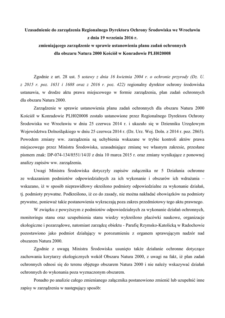 Uzasadnienie do zarządzenia Regionalnego Dyrektora Ochrony Środowiska we Wrocławiu z dnia 19 września 2016 r. zmieniającego zarządzenie w sprawie ustanowienia planu zadań ochronnych dla obszaru Natura 2000 Kościół w Konradowie PLH020008 Zgodnie z art. 28 ust. 5 ustawy z dnia 16 kwietnia 2004 r. o ochronie przyrody (Dz. U. z 2015 r. poz. 1651 i 1688 oraz z 2016 r. poz. 422) regionalny dyrektor ochrony środowiska ustanawia, w drodze aktu prawa miejscowego w formie zarządzenia, plan zadań ochronnych dla obszaru Natura 2000. Zarządzenie w sprawie ustanowienia planu zadań ochronnych dla obszaru Natura 2000 Kościół w Konradowie PLH020008 zostało ustanowione przez Regionalnego Dyrektora Ochrony Środowiska we Wrocławiu w dniu 25 czerwca 2014 r. i ukazało się w Dzienniku Urzędowym Województwa Dolnośląskiego w dniu 25 czerwca 2014 r. (Dz. Urz. Woj. Doln. z 2014 r. poz. 2865). Powodem zmiany ww. zarządzenia są uchybienia wskazane w trybie kontroli aktów prawa miejscowego przez Ministra Środowiska, uzasadniające zmianę we własnym zakresie, przesłane pismem znak: DP-074-134/8551/14/JJ z dnia 10 marca 2015 r. oraz zmiany wynikające z ponownej analizy zapisów ww. zarządzenia. Uwagi Ministra Środowiska dotyczyły zapisów załącznika nr 5 Działania ochronne ze wskazaniem podmiotów odpowiedzialnych za ich wykonanie i obszarów ich wdrażania – wskazano, iż w sposób nieprawidłowy określono podmioty odpowiedzialne za wykonanie działań, tj. podmioty prywatne. Podkreślono, iż co do zasady, nie można nakładać obowiązków na podmioty prywatne, ponieważ takie postanowienia wykraczają poza zakres przedmiotowy tego aktu prawnego. W związku z powyższym z podmiotów odpowiedzialnych za wykonanie działań ochronnych, monitoringu stanu oraz uzupełnienia stanu wiedzy wykreślono placówki naukowe, organizacje ekologiczne i pozarządowe, natomiast zarządcę obiektu - Parafię Rzymsko-Katolicką w Radochowie pozostawiono jako podmiot działający w porozumieniu z organem sprawującym nadzór nad obszarem Natura 2000. Zgodnie z uwagą Ministra Środowiska usunięto także działanie ochronne dotyczące zachowania korytarzy ekologicznych wokół Obszaru Natura 2000, z uwagi na fakt, iż plan zadań ochronnych odnosi się do terenu objętego obszarem Natura 2000 i nie należy wskazywać działań ochronnych do wykonania poza wyznaczonym obszarem. Ponadto po analizie całego zmienianego załącznika postanowiono zmienić lub uzupełnić inne zapisy w zarządzeniu w następujący sposób: Z uwagi na fakt, iż tut. Dyrekcja nie jest zarządcą nieruchomości oraz dysponuje bardzo ograniczonymi środkami finansowymi, które w żadnej mierze nie pozwalają na jakiekolwiek działania inwestycyjne, zmieniono brzmienie działania ochronnego pn. „Wymiana pokrycia dachu na materiał o możliwie najdłuższej trwałości np. blachę miedzianą lub cynkowo-tytanową nie wymagającą regularnych prac konserwacyjnych. Pełne odeskowanie dachu pod blachą. Zastosowanie bezpiecznych dla ssaków środków do konserwacji drewna (….)” na „Rozpoznanie możliwości pozyskania środków na remont dachu oraz wieży kościoła (w trakcie obowiązywania planu zadań ochronnych, zwanego dalej „PZO”). Zrezygnowano także ze szczegółowych wskazań dotyczących zakresu remontu dachu oraz materiałów, gdyż przy obecnym zapisie takie szczegóły są przedwczesne. Regionalna Dyrekcja Ochrony Środowiska we Wrocławiu podczas rozpoznawania możliwości pozyskania środków na remont dachu weźmie pod uwagę wymogi ochrony nietoperzy, w tym konieczność zastosowania podczas remontu dachu bezpiecznych dla nietoperzy środków konserwacji drewna. W odniesieniu do działania ochronnego pn. „Zachowanie ciągłości nasadzeń drzew wokół kościoła. Działania prowadzić w ramach potrzeb. W przypadku konieczności wycięcia drzew wokół kościoła nasadzić nowe” – przeredagowano jego brzmienie na: „Zachowanie drzew wokół kościoła. W przypadku konieczności wycięcia drzew wokół kościoła zaleca się wprowadzić nowe nasadzenia w zakresie uwzględniającym konieczność zachowania korytarzy migracyjnych nietoperzy”, a jako podmiot odpowiedzialny za wykonanie pozostawiono gminę Lądek Zdrój – jako organ właściwy do wydawania decyzji na wycinkę drzew, jak również mający możliwość uzależnienia zezwolenia na wycinkę od wykonania nasadzeń zastępczych. Przeredagowano część zapisu działania ochronnego pn. „Utrzymanie obecnego sposobu gospodarowania w obiekcie i ograniczenia wejść na strych i wieżę kościoła w okresie rozrodu nietoperzy tzn. w okresie 15 kwietnia - 15 września. Rezygnacja z zewnętrznego oświetlenia kościoła lub pozostawienie w ocienieniu minimum strychu, wieży oraz ścian, w których zlokalizowane są otwory wlotowe”. Drugie zdanie otrzymuje brzmienie: „W przypadku wykonywania oświetlenia kościoła zaplanować je w taki sposób, aby pozostawić w ocienieniu dach, wieżę (powyżej dolnej krawędzi dachu) oraz ściany, w których zlokalizowane są otwory wlotowe”. Zapis zmieniono, aby nie wykluczać możliwości oświetlenia kościoła (w sposób ograniczony) w przyszłości. Doprecyzowano zapis dotyczący oceny stanu zachowania gatunku 1324 nadając mu brzmienie „Ocena stanu zachowania populacji i siedliska gatunku”, ponieważ ocena stanu gatunku prowadzona zgodnie z metodyką Państwowego Monitoringu Środowiska wymaga zarówno oceny stanu populacji, jak i siedliska gatunku. Ustanowienie zarządzenia zmieniającego zarządzenie w sprawie ustanowienia planu zadań ochronnych dla obszaru Natura 2000 Kościół w Konradowie PLH020008 poprzedzone zostało przeprowadzeniem postępowania z udziałem społeczeństwa. W dniu 22 września 2015 r. w Biuletynie Informacji Publicznej i w siedzibie Regionalnej Dyrekcji Ochrony Środowiska we Wrocławiu (na tablicy ogłoszeń) oraz w Gazecie Wyborczej o zasięgu wojewódz