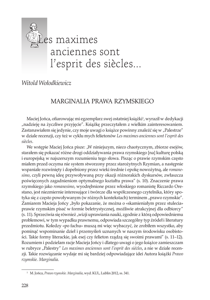 Les maximes anciennes sont l’esprit des siècles... Witold Wołodkiewicz Marginalia prawa rzymskiego Maciej Jońca, ofiarowując mi egzemplarz swej ostatniej książki, wyraził w dedykacji „nadzieję na życzliwe przyjęcie”. Książkę przeczytałem z wielkim zainteresowaniem. Zastanawiałem się jedynie, czy moje uwagi o książce powinny znaleźć się w „Palestrze” w dziale recenzji, czy też w cyklu mych felietonów Les maximes anciennes sont l’esprit des siècles. We wstępie Maciej Jońca pisze: „W niniejszym, nieco chaotycznym, zbiorze esejów, starałem się pokazać różne drogi oddziaływania prawa rzymskiego [na] kulturę polską i europejską w najszerszym rozumieniu tego słowa. Pisząc o prawie rzymskim często miałem przed oczyma nie system stworzony przez starożytnych Rzymian, a następnie wspaniale rozwinięty i dopełniony przez wieki średnie i epokę nowożytną, ale romane simo, czyli pewną ideę przywoływaną przy okazji różnorakich dyskursów, zwłaszcza poświęconych zagadnieniom optymalnego kształtu prawa” (s. 10). Znaczenie prawa rzymskiego jako romanesimo, wyodrębnione przez włoskiego romanistę Riccardo Orestano, jest niezmiernie interesujące i twórcze dla współczesnego czytelnika, który spotyka się z często powoływanym (w różnych kontekstach) terminem „prawo rzymskie”. Zamiarem Macieja Jońcy „było pokazanie, że można o «skamieniałym przez stulecia» prawie rzymskim pisać w formie beletrystycznej, możliwie atrakcyjnej dla odbiorcy” (s. 11). Sprzeciwia się również „wizji uprawiania nauki, zgodnie z którą odpowiedniemu problemowi, w tym wypadku prawnemu, odpowiada szczególny typ źródeł i literatury przedmiotu. Koledzy «po fachu» muszą mi więc wybaczyć, że zrobiłem wszystko, aby pominąć wspominanie dzieł i przemyśleń uznanych w naszym środowisku osobistości. Takie formy literackie, jak esej czy felieton rządzą się swoimi prawami” (s. 11–12). Rozumiem i podzielam racje Macieja Jońcy i dlatego uwagi o jego książce zamieszczam w rubryce „Palestry” Les maximes anciennes sont l’esprit des siécles, a nie w dziale recenzji. Takie rozwiązanie wydaje mi się bardziej odpowiadające idei Autora książki Prawo rzymskie. Marginalia. M. Jońca, Prawo rzymskie. Marginalia, wyd. KUL, Lublin 2012, ss. 341. 228 9–10/2013 Marginalia prawa rzymskiego Opracowanie Macieja Jońcy (jak symfonia) składa się z czterech części (rozdziałów). Rozdział pierwszy – Sztuka prawa rzymskiego (s. 13–85) jest zbiorem esejów/felietonów, których nicią przewodnią jest pokazanie doskonałości i ponadczasowości rozwiązań prawnych stworzonych lub rozwiniętych w prawie rzymskim i ich odniesień do współczesności. Stanowią one prawdziwą sztukę w rozwiązywaniu kwestii prawnych. W pierwszym felietonie przewija się głównie wątek łacińskich sformułowań i reguł prawnych, które odegrały i odgrywają wciąż wielką rolę w doktrynie i praktyce prawnej. W ulpianowskiej triadzie zachowań znamionujących człowieka żyjącego zgodnie z prawem istotnym elementem jest „oddanie każdemu, co mu się należy” suum cuique/ suum cuique tribuere (s. 18). To cytowane przez Cycerona i Ulpiana pojęcie określa tzw. „sprawiedliwość rozdzielczą” (iustitia distributiva). Autor nie ogranicza się jednak tylko do przedstawienia prawniczych niuansów tej zasady i jej dalszych dziejów w historii myśli prawniczej i filozoficznej (u glosatorów, Grocjusza, Leibnitza, Ajdukiewicza, Perelmana – s. 21–22). Przedstawia również nadinterpretacje tej zasady, na przykładzie motta (suum cuique), które dla swej dynastii przyjął król Prus Fryderyk I: Polacy po II rozbiorze do frazy tej (na pruskich słupkach granicznych) dopisywali słowo rapuit („co swoje każdemu zrabowały”) oraz motta, które w Niemczech hitlerowskich umieszczono na bramie obozu koncentracyjnego w Buchenwaldzie (Jedem das seine – s. 24). Cytuje również studium Stanisława Kutrzeby (z roku 1937) o państwach totalnych, gdzie profesor Uniwersytetu Jagiellońskiego, w nawiązaniu do odejścia w nich od pewności prawa, pisał: „Sędzia ma rozstrzygać nie według rzymskiej jeszcze zasady suum cuique tribuere, ale pod kątem widzenia dobra państwa i jego celów. Prawo staje się płynne” (s. 25). Inna łacińska paremia, którą zajął się Maciej Jońca, to in dubio pro reo, podstawowa zasada domniemania niewinności. Po przedstawieniu korzeni sformułowania reguły in dubio pro reo (Arystoteles, Seneka, Trajan) stwierdza, że „nie brakuje opinii, iż zarówno wspomniana zasada, jak i koncept domniemania niewinności mają swoje korzenie w antycznym ius Romanum. Musimy jednak zmartwić wszystkich wielbicieli kunsztu starożytnej jurysprudencji. Prawo rzymskie nie znało zasad domniemania niewinności oraz in dubio pro reo…” (s. 47–48). Tu nie bardzo można zgodzić się z Maciejem Jońcą: Cały szereg przekazanych przez jurystów rzymskich zasad dotyczących ciężaru dowodu (choćby znajdujące się na kolumnach Sądu Najwyższego inskrypcje nr: 79, 86, 29, 72 oraz powoływana też w omawianej książce inskrypcja nr 18) dają możność stwierdzenia, że choć nie znajdziemy w źródłach rzymskich wyrażenia in dubio pro reo (sformułowanego przez żyjącego w XVI wieku Aegidiusa Bossiusa), to zasada ta była głęboko zakorzeniona w źródłach rzymskich, przy omawianiu ciężaru dowodu w procesie. Warto wspomnieć o punkcie rozdziału pierwszego zatytułowanym Dobre obyczaje z masochizmem w tle. Polski Kodeks cywilny odwołuje się wielokrotnie do zasad współżycia społecznego, stanowiących m.in. warunek ważności czynności prawnych (art. 58 § 2 k.c.), ograniczenia zasady swobody umów (art. 351 k.c.), skutków czynności prawnej (art. 56 k.c.) czy ochrony przed nadużyciem prawa (art. 5 k.c.). Dla Macieja Jońcy sfor Por. kolumny SN: nr 79 – ei incumbit probatio qui dicit non q