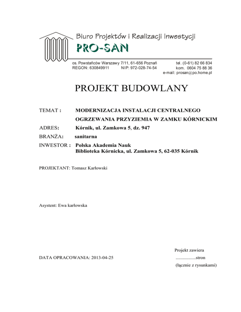 PRO-SAN os. Powstañców Warszawy 7/11, 61-656 Poznañ REGON: 630849911 NIP: 972-028-74-54 tel. (0-61) 82 66 834 kom. 0604 75 88 36 e-mail: prosan@ po.home.pl PROJEKT BUDOWLANY TEMAT : MODERNIZACJA INSTALACJI CENTRALNEGO OGRZEWANIA PRZYZIEMIA W ZAMKU KÓRNICKIM ADRES: Kórnik, ul. Zamkowa 5, dz. 947 BRANŻA: sanitarna INWESTOR : Polska Akademia Nauk Biblioteka Kórnicka, ul. Zamkowa 5, 62-035 Kórnik PROJEKTANT: Tomasz Karłowski Asystent: Ewa karłowska Projekt zawiera DATA OPRACOWANIA: 2013-04-25 .................stron (łącznie z rysunkami) SPIS TREŚCI CZĘŚĆ OPISOWA 1. Oświadczenie projektanta 2. Kopia uprawnień projektanta 3. Kopia wpisu do WOIIB 4. Postanowienie nr 654/2013 Starosty Poznańskiego 5. Opis techniczny 6. Dobór urządzeń- obliczenia CZĘŚĆ RYSUNKOWA 1. Mapka poglądowa 2. Rzut przyziemia 3. Schemat obliczeniowy instalacji - rozwinięcie 4. Przekrój przez kanał pod posadzką WYTYCZNE DO OPRACOWANIA PLANU BIOZ OPIS TECHNICZNY 1. Podstawa opracowania • umowa z Inwestorem. • Dokumentacja techniczna instalacji co pomieszczenia piwniczne z 1972 r. • Projekt techniczny instalacji co w pomieszczeniach Zamku z 1978 r. • Projekt budowlany wymiany kotłów co w Zamku Kórnickim z 2011 r. • uzgodnienia z Inwestorem • obowiązujące normy i przepisy projektowania 2. Zakres opracowania Niniejsze opracowanie dotyczy modernizacji instalacji centralnego ogrzewania w pomieszczeniach przyziemia w Bibliotece Kórnickiej w Kórniku. 3. Dane ogólne Instalacja centralnego ogrzewania w Zamku Kórnickim zasilana jest z kotłowni gazowej zlokalizowanej w przyziemiu Zamku. Instalacja wykonana jest z rur stalowych spawanych i z rur miedzianych łączonych przez lutowanie. Przewody prowadzone są pod stropem przyziemia, częściowo zaizolowane. Jako elementy grzejne zamontowane są grzejniki stalowe płytowe, regulowane zaworami z głowicami termostatycznymi. 4. Zapotrzebowanie ciepła Zapotrzebowanie ciepła dla pomieszczeń przyziemia ustalono w oparciu o PN 94 B03406 dla temperatury wewnętrznej pomieszczeń 20°C. OGÓŁEM zapotrzebowanie ciepła dla przyziemia wynosi: 28,9 kW. 5. Instalacja grzew cza grzejni kowa Rurociągi Instalacje centralnego ogrzewania wykonać z rur stalowych nierdzewnych INOX do instalacji co łączonych kształtkami zaciskowymi profipress. W przypadku konieczności połączenia przewodów stalowych z miedzianymi (pionami istniejącymi) należy stosować zabezpieczenie przekładką dielektryczną np. teflonową. Przewody rozprowadzające wodę w instalacji c.o. prowadzić pod posadzką w wykopie wzdłuż ścian. Układ przewodów pozwala na samokompensację wydłużeń termicznych.. Istniejące piony co w przyziemiu należy podłączyć do rur pod posadzką. Na wyjściu rur z posadzki zamontować rozetę maskującą. Na przewody pod posadzką należy nałożyć izolację termiczną z pianki poliuretanowej gr min. 6 mm. Piony pozostawić nieizolowane. Do mocowania pionów do ścian stosować uchwyty systemowe podwójne. Grzejniki Zaprojektowano grzejniki płytowe stalowe Plan Multi. Wielkości grzejników podano na rysunkach. Podłączenia grzejników z instalacją (rury poziome pod posadzką) wykonać w oparciu o trójniki i łuki przyłączeniowe do grzejników. Podłączenie grzejnika od dołu przez CosmoBLOK. Na wyjściu rur z posadzki zamontować rozetę maskującą podwójną. Sugerowany kolor grzejników szaroaluminiowy RAL 9007. Przed zamówieniem grzejników należy uzgodnić z Inwestorem kolor lakieru i uzyskać jego akceptację. Grzejniki montować na konsolach stojących lub wiszących w zależności od możliwości. Armatura odcinająca Na odgałęzieniach przewodów głównych zaprojektowano zawory dwudrogowe równoważące STAD z możliwością odcięcia i odwodnienia. Wszystkie grzejniki wyposażone są w zawory z głowicami termostatycznymi CosmoHAED. Odpowietrzenia Instalacja odpowietrzana będzie przez istniejące piony. Na wszystkich grzejnikach zamontować odpowietrzniki. 6. Regulacja instalacji Regulacja systemu cieplnego realizowana jest przez regulator w kotłowni. Do regulacji przepływów przyjęto zawory równoważące STAD zamontowane w komorze pod posadzką na rozdziale instalacji na trzy obiegi. Wstępne nastawy zaworów STAD podano na rysunku. 7. Izolacja cieplna Rurociągi instalacji c.o. (z wyjątkiem pionów) należy zaizolować termicznie elastycznymi i odpornymi na zrywanie otulinami wykonanymi z materiału izolacyjnego Grubości izolacji dla materiału o wsp. przewodzenia λ = 0,035 W/mK o należy przyjąć nie mniejsze niż: Minimalna grubość izolacji Lp. Średnica rurociągu DN[mm] 1 do 20 20 mm 2 od 20 do 35 30 mm 3 od 35 do 100 równa DN 4 powyżej 100 100 mm 5 Przewody i armatura wg poz. 1-4 przechodzące przez ściany lub stropy, skrzyżowania przewodów cieplnej (0,035 W/(m*K) ½ wymagań z poz. 1-4 Przewody ogrzewań centralnych wg poz. 1-4 ułożone w 6 komponentach budowlanych między ogrzewanymi ½ wymagań z poz. 1-4 pomieszczeniami różnych użytkowników 7 Przewody wg poz. 6 ułożone w podłodze 6 mm 8. Zabezpieczenia Instalacja zabezpieczona jest ciśnieniowym naczynie wzbiorczym w kotłowni co. 9. Montaż instalacji a. Przed przystąpieniem do montażu należy wszystkie rury i kolana oczyścić z rdzy i innych zanieczyszczeń oraz przygotować do łączenia. b. Należy przestrzegać prawidłowości spadków w celu zachowania niezawodności odpowietrzenia i odwodnienia. Przewody należy prowadzić ze spadkiem 0,5% w kierunku odwodnień. c. Przed montażem zaworów regulacyjnych należy wykonać płukanie rurociągów d. W miejscach przejść przez przegrody budowlane rurociągi prowadzić w tulejach osłonowych z rur z tworzyw sztucznych. W miejscach przejść nie mogą występować połączenia rur. Przestrzeń między tuleja a rurą wypełnić materiałem plastycznym nie oddziałującym na materiał rury. 10.Próby hydrauliczne instalacji Instalację należy poddać próbie szczelności i