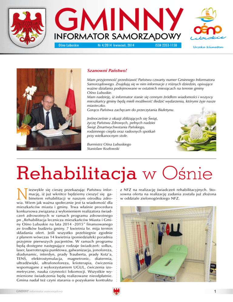 GMINNY INFORMATOR SAMORZĄDOWY Ośno Lubuskie Nr 4/2014 kwiecień, 2014 ISSN 2353-1150 Szanowni Państwo! Mam przyjemność przedstawić Państwu czwarty numer Gminnego Informatora Samorządowego. Znajdują się w nim informacje z różnych dziedzin, opisujące ważne działania podejmowane w ostatnich miesiącach na terenie gminy Ośno Lubuskie. Mam nadzieję, iż informator stanie się cennym źródłem wiadomości i wszyscy mieszkańcy gminy będą mieli możliwość śledzić wydarzenia, którymi żyje nasze miasteczko. Gorąco Państwa zachęcam do przeczytania Biuletynu. Jednocześnie z okazji zbliżających się Świąt, życzę Państwu Zdrowych, pełnych nadziei Świąt Zmartwychwstania Pańskiego, rodzinnego ciepła oraz radosnych spotkań przy wielkanocnym stole. Burmistrz Ośna Lubuskiego Stanisław Kozłowski Rehabilitacja w Ośnie iezwykle się cieszę przekazując Państwu informację, iż już wkrótce będziemy cieszyć się gabinetem rehabilitacji w naszym ośrodku zdrowia. Wiem jak ważna społecznie jest ta wiadomość dla mieszkańców miasta i gminy. Trwa właśnie procedura konkursowa związana z wyłonieniem realizatora świadczeń zdrowotnych w ramach programu zdrowotnego pn „Rehabilitacja lecznicza mieszkańców Miasta i Gminy Ośno Lubuskie na lata 2014 -2015” finansowanego ze środków budżetu gminy. 7 kwietnia br. mija termin składania ofert. Jeśli wszystko przebiegnie zgodnie z planem wówczas 14 kwietnia (poniedziałek) poradnia przyjmie pierwszych pacjentów. W ramach programu będą dostępne następujące rodzaje świadczeń: sollux, laser, laseroterapia punktowa, galwanizacja, jonoforeza, diadynamic, interdyn, prady Trauberta, prady Kotz’a, TENS, elektrostymulacja, magnetronic, diatermia, ultradźwięki, ultrafonoforeza, krioterapia, ćwiczenia wspomagane z wykorzystaniem UGUL, ćwiczenia izometryczne, nauka czynności lokomocji. Wszystkie wymienione świadczenia będą realizowane nieodpłatnie. Gmina nadal też czyni starania o pozyskanie kontraktu N GMINNY informator samorządowy z NFZ na realizację świadczeń rehabilitacyjnych. Stosowna oferta na realizację zadania została już złożona w oddziale zielonogórskiego NFZ. 1 Świetlica wiejska w Trześniowie rwa ocena ofert złożonych w postępowaniu przetargowym na wyłonienie wykonawcy robót związanych z budową budynku świetlicy wiejskiej wraz z towarzyszącymi elementami zagospodarowania terenu w miejscowości Trześniów. W ramach przedsięwzięcia zostanie wybudowany budynek świetlicy wiejskiej wraz z towarzyszącymi elementami zagospodarowania terenu, w tym wykonanie instalacji sanitarnych, wodno-kanalizacyjnych i instalacji elek- T II etap ścieżki pieszo-rowerowej wokół jeziora Reczynek marca br. upłynął termin na składanie ofert w trybie przetargu nieograniczonego na wybór wykonawcy robót związanych z budową ścieżki pieszo - rowerowej wokół jeziora Reczynek wraz z niezbędną infrastrukturą techniczną. Zakres robót budowlanych obejmuje wykonanie ścieżki pieszo - rowerowej o nawierzchni mineralnej typu HANSE GRAND bądź równoważnej długości ok. 1221 mb wokół jeziora Reczynek wraz z budową oświetlenia ścieżki. 17 trycznych wraz z zagospodarowaniem terenu, tj. wykonanie ciągów pieszych, parkingów wraz z dojazdami i placem zabaw. Termin realizacji zadania przypada na 15 kwietnia 2015r. Przedsięwzięcie realizowane będzie w ramach działania „Odnowa i rozwój wsi” objętego PROW na lata 2007-2013. Jest to budowa niezwykle ważna dla mieszkańców Trześniowa, bowiem po ponad 20 latach przerwy będą mogli ponownie skorzystać z dobrodziejstw wiejskiej świetlicy. Ośno ma swoje logo mina Ośno Lubuskie ma swoje logo, które kojarzy się ze specyfiką gminy. „Ośno Lubuskie urzeka klimatem” - to hasło promocyjne, widniejące na znaku. Logo będzie używane przede wszystkim do celów promocyjnych - pojawi się na materiałach reklamowych, folderach i pamiątkach gminnych, rozdawanych podczas różnych imprez turystycznych, imprez gminnych, spotkań z delegacjami z innych gmin i z zagranicy. W najbliższym czasie na głównych trasach komunikacyjnych pojawią się tzw. „witacze” zachęcające do odwiedzenia Ośna Lubuskiego. G Planowany termin zakończenia prac to sierpień 2014 r. Przedsięwzięcie finansowane ze środków Europejskiego Funduszu Rozwoju Rybackiego zapewniające inwestycje w zrównoważone rybołówstwo oraz budżetu gminy. 2 GMINNY informator samorządowy Kolejne eurodotacje na projekty w Ośnie godnie z uchwałą Rady Stowarzyszenia Kraina Szlaków Turystycznych – Lokalna Grupa Działania w sprawie operacji wybranych do finansowania trzy projekty gminne uzyskały uznanie komisji oceniającej. Z W ramach PROW 2007-2013 oś LEADER, działanie 4.1/413 tj. Wdrażanie lokalnych strategii rozwoju, tj. na działania „Odnowa i rozwój wsi” i „Małe projekty” będziemy w 2014 roku realizować przedsięwzięcia związane z modernizacją placów zabaw zarówno w Ośnie jak i w miejscowościach gminnych, zostanie stworzona siłownia zewnętrzna w rejonie jeziora Reczynek oraz zorganizowana VI edycja Festiwalu Muzyki Kameralnej i Organowej, w ramach której pierwszy koncert już 11 maja o godz. 19.00 w Sali Rajców Ratusza Miejskiego. Dotacja z MKIDN na kolejny etap prac kościoła w Ośnie od koniec stycznia ogłoszone zostały wyniki naboru wniosków w ramach programu „Dziedzictwo Kulturowe”, priorytet „Ochrona zabytków”. Wniosek parafii pw. św. Jakuba Apostoła w Ośnie na realizację II etapu ratunkowych prac zabezpieczających przed katastrofą budowlaną otrzymał dotację w kwocie 500 000,00 zł. Zakres planowanych do wykonania w 2014 roku prac dotyczyć będzie zabezpieczenia ścian korpusu nawowego oraz sklepień w korpusie nawowym i prezbiterium. Tą drogą składamy podziękowania Państwu Posłom: Bożenie Sławiak, Krystynie Sibińskiej, Witoldowi Pahlowi oraz Senator Helenie Hatka za wsparcie n