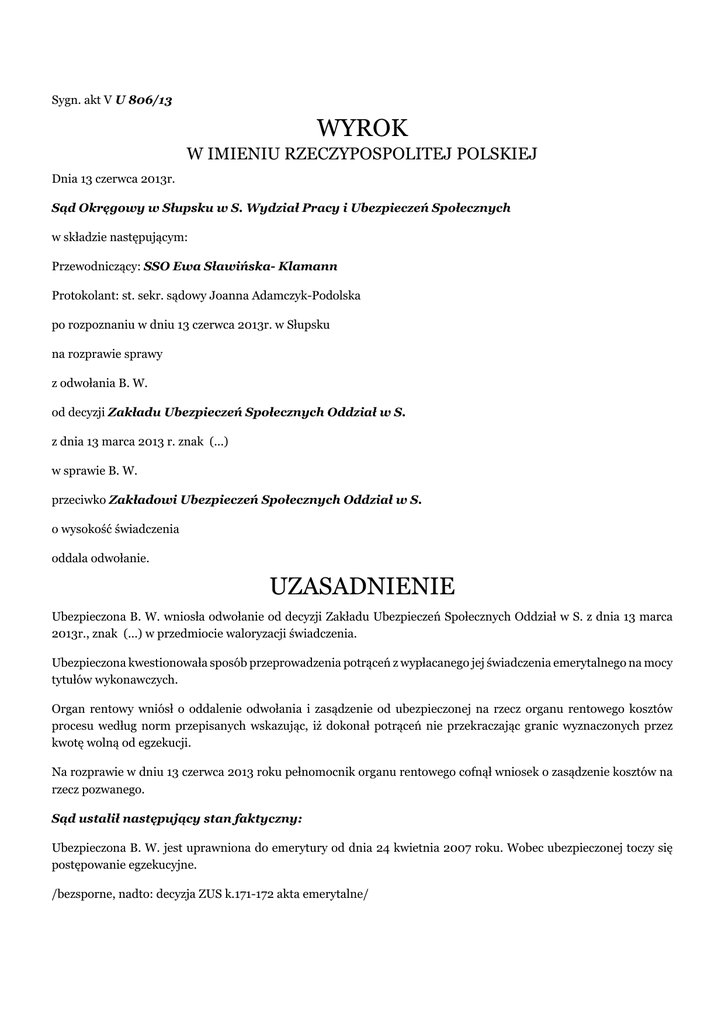 Sygn. akt V U 806/13 WYROK W IMIENIU RZECZYPOSPOLITEJ POLSKIEJ Dnia 13 czerwca 2013r. Sąd Okręgowy w Słupsku w S. Wydział Pracy i Ubezpieczeń Społecznych w składzie następującym: Przewodniczący: SSO Ewa Sławińska- Klamann Protokolant: st. sekr. sądowy Joanna Adamczyk-Podolska po rozpoznaniu w dniu 13 czerwca 2013r. w Słupsku na rozprawie sprawy z odwołania B. W. od decyzji Zakładu Ubezpieczeń Społecznych Oddział w S. z dnia 13 marca 2013 r. znak (...) w sprawie B. W. przeciwko Zakładowi Ubezpieczeń Społecznych Oddział w S. o wysokość świadczenia oddala odwołanie. UZASADNIENIE Ubezpieczona B. W. wniosła odwołanie od decyzji Zakładu Ubezpieczeń Społecznych Oddział w S. z dnia 13 marca 2013r., znak (...) w przedmiocie waloryzacji świadczenia. Ubezpieczona kwestionowała sposób przeprowadzenia potrąceń z wypłacanego jej świadczenia emerytalnego na mocy tytułów wykonawczych. Organ rentowy wniósł o oddalenie odwołania i zasądzenie od ubezpieczonej na rzecz organu rentowego kosztów procesu według norm przepisanych wskazując, iż dokonał potrąceń nie przekraczając granic wyznaczonych przez kwotę wolną od egzekucji. Na rozprawie w dniu 13 czerwca 2013 roku pełnomocnik organu rentowego cofnął wniosek o zasądzenie kosztów na rzecz pozwanego. Sąd ustalił następujący stan faktyczny: Ubezpieczona B. W. jest uprawniona do emerytury od dnia 24 kwietnia 2007 roku. Wobec ubezpieczonej toczy się postępowanie egzekucyjne. /bezsporne, nadto: decyzja ZUS k.171-172 akta emerytalne/ Zaskarżoną decyzją z dnia 13 marca 2013r, znak (...) Zakład Ubezpieczeń Społecznych Oddział w S. dokonał waloryzacji świadczenia ustalając wysokość zwaloryzowanej emerytury, i dokonał jej zmniejszenia z powodu egzekucji administracyjnej tj. o 384,01 zł. Po waloryzacji wysokość emerytury wynosi 1536,07 (brutto) zł. 25 % tej kwoty stanowi 384,01 zł. Po dokonaniu potrącenia stanowiącego 25% emerytury ubezpieczonej, pozostaje kwota 902, 81 zł brutto, kwota ta jest wyższa od kwoty 415,57 zł, która stanowi 50% najniższej emerytury. Dowód: decyzja z dnia 13.03.2013 r w aktach ZUS Sąd zważył co następuje: Odwołanie ubezpieczonej nie zasługuje na uwzględnienie. Przedmiot sporu w niniejszej sprawie stanowiła prawidłowość potrąceń dokonywanych z emerytury ubezpieczonej. W ocenie Sądu rozpoznającego niniejszy spór, powyższe kwoty dokonanych potrąceń są prawidłowe i znajdują oparcie w przepisach prawa. Zgodnie z art. 139 ust 1 pkt 5 ustawy z dnia 17 grudnia 1998 r. o emeryturach i rentach z Funduszu Ubezpieczeń Społecznych (t.j. Dz. U. 2009 r., nr 153, poz. 1227 ze zm.) ze świadczeń pieniężnych określonych w ustawie po odliczeniu składki na ubezpieczenie zdrowotne oraz zaliczki i innych należności z tytułu podatku dochodowego od osób fizycznych potrąceniu, z uwzględnieniem art. 141, podlegają między innymi sumy egzekwowane na mocy tytułów wykonawczych na pokrycie należności innych niż świadczenia alimentacyjne Zgodnie z art. 140 ust. 1 pkt 3 w/w ustawy potrącenia, o których mowa w art. 139, mogą być dokonywane, z zastrzeżeniem art. 141, w przypadku innych egzekwowanych należności - do wysokości 25 % świadczenia. W myśl art. 141 ust. 1 pkt 1 tej ustawy emerytury i renty są wolne od egzekucji i potrąceń, z zastrzeżeniem ust. 2, w części odpowiadającej: 50 % kwoty najniższej emerytury lub renty - zależnie od rodzaju pobieranego przez emeryta (rencistę) świadczenia - przy potrącaniu: a) należności, o których mowa w art. 139 ust. 1 pkt 3, wraz z kosztami i opłatami egzekucyjnymi (sumy egzekwowane na mocy tytułów wykonawczych na zaspokojenie należności alimentacyjnych), b) należności, o których mowa w art. 139 ust. 1 pkt 4, (należności alimentacyjne potrącane na wniosek wierzyciela na podstawie przedłożonego przez niego tytułu wykonawczego), c) należności, o których mowa w art. 139 ust. 1 pkt 5, wraz z kosztami i opłatami egzekucyjnymi (sumy egzekwowane na mocy tytułów wykonawczych na pokrycie należności innych niż świadczenia alimentacyjne). Zgodnie z ust. 3 tego artykułu kwoty wolne od potrąceń i egzekucji ustala się dla emerytur i rent wraz ze wszystkimi wzrostami, zwiększeniami, dodatkami oraz innymi świadczeniami wypłacanymi wraz z emeryturą lub rentą na podstawie odrębnych przepisów, z wyłączeniem świadczeń rodzinnych oraz dodatku dla sierot zupełnych, dodatku pielęgnacyjnego i dodatku weterana poszkodowanego. Dokonane przez organ rentowy potrącenia są zgodne z treścią powyższych przepisów. Nie przekraczają one ustawowych granic. Kwota przypadająca ubezpieczonej do wypłaty jest wyższa od kwoty- 50% najniższej emerytury, albowiem od 1 marca 2013 roku najniższa emerytura wynosiła 831,15zł, kwota wolna od potrąceń wynosi zatem 415,57zł, zatem po dokonaniu potrącenia na podstawie zajęcia komorniczego musi pozostać kwota świadczenia nie niższa niż 415,57 zł. Po dokonaniu potrącenia stanowiącego 25% emerytury ubezpieczonej, pozostaje kwota 902, 81 zł brutto, kwota ta jest zatem wyższa od 415,57 zł. Na marginesie podkreślić przy tym wypada, że w sprawie wszczętej wskutek odwołania ubezpieczonego od decyzji obniżającej mu wysokość świadczenia w związku z potrąceniami dokonywanymi przez organ rentowy ocenie sądu nie podlega zasadność należności egzekwowanych z tego świadczenia (por. wyrok SA w Katowicach z dnia 20 października 2005 r., III AUa 1322/04, Biul. SAKa 2006, nr 1). Zabezpieczeniem osób pobierających świadczenia podlegające potrąceniom jest wprowadzenie tzw. kwoty wolnej. Kwota ta wyraża część świadczenia nieobjętą egzekucją (potrąceniami) i odpowiada określonemu procentowo ułamkowi najniższej emerytury bądź renty, zależnie od rodzaju pobieranego świadczenia. Analiza akt sprawy świadczy o tym, że kwota wolna od potrąceń została określona w sposób prawidłowy. Ochrona w wi