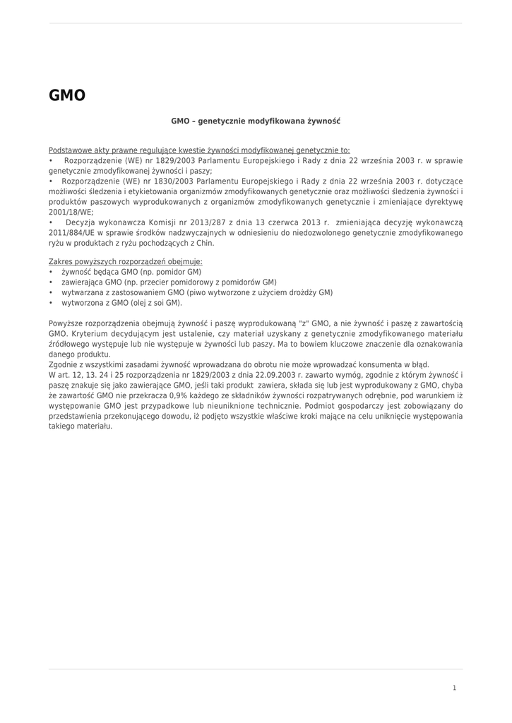 GMO GMO – genetycznie modyfikowana żywność Podstawowe akty prawne regulujące kwestie żywności modyfikowanej genetycznie to: • Rozporządzenie (WE) nr 1829/2003 Parlamentu Europejskiego i Rady z dnia 22 września 2003 r. w sprawie genetycznie zmodyfikowanej żywności i paszy; • Rozporządzenie (WE) nr 1830/2003 Parlamentu Europejskiego i Rady z dnia 22 września 2003 r. dotyczące możliwości śledzenia i etykietowania organizmów zmodyfikowanych genetycznie oraz możliwości śledzenia żywności i produktów paszowych wyprodukowanych z organizmów zmodyfikowanych genetycznie i zmieniające dyrektywę 2001/18/WE; • Decyzja wykonawcza Komisji nr 2013/287 z dnia 13 czerwca 2013 r. zmieniająca decyzję wykonawczą 2011/884/UE w sprawie środków nadzwyczajnych w odniesieniu do niedozwolonego genetycznie zmodyfikowanego ryżu w produktach z ryżu pochodzących z Chin. Zakres powyższych rozporządzeń obejmuje: • żywność będąca GMO (np. pomidor GM) • zawierająca GMO (np. przecier pomidorowy z pomidorów GM) • wytwarzana z zastosowaniem GMO (piwo wytworzone z użyciem drożdży GM) • wytworzona z GMO (olej z soi GM). Powyższe rozporządzenia obejmują żywność i paszę wyprodukowaną "z" GMO, a nie żywność i paszę z zawartością GMO. Kryterium decydującym jest ustalenie, czy materiał uzyskany z genetycznie zmodyfikowanego materiału źródłowego występuje lub nie występuje w żywności lub paszy. Ma to bowiem kluczowe znaczenie dla oznakowania danego produktu. Zgodnie z wszystkimi zasadami żywność wprowadzana do obrotu nie może wprowadzać konsumenta w błąd. W art. 12, 13. 24 i 25 rozporządzenia nr 1829/2003 z dnia 22.09.2003 r. zawarto wymóg, zgodnie z którym żywność i paszę znakuje się jako zawierające GMO, jeśli taki produkt zawiera, składa się lub jest wyprodukowany z GMO, chyba że zawartość GMO nie przekracza 0,9% każdego ze składników żywności rozpatrywanych odrębnie, pod warunkiem iż występowanie GMO jest przypadkowe lub nieuniknione technicznie. Podmiot gospodarczy jest zobowiązany do przedstawienia przekonującego dowodu, iż podjęto wszystkie właściwe kroki mające na celu uniknięcie występowania takiego materiału. 1