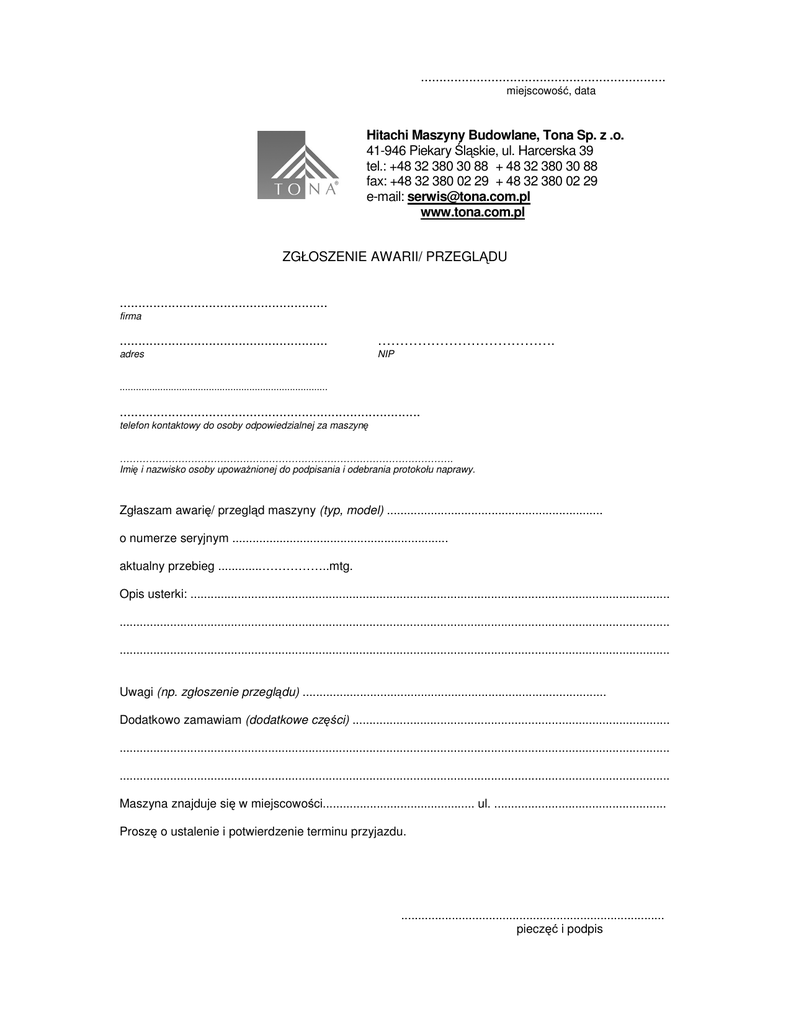.................................................................. miejscowość, data Hitachi Maszyny Budowlane, Tona Sp. z .o. 41-946 Piekary Śląskie, ul. Harcerska 39 tel.: +48 32 380 30 88 + 48 32 380 30 88 fax: +48 32 380 02 29 + 48 32 380 02 29 e-mail: [email protected] www.tona.com.pl ZGŁOSZENIE AWARII/ PRZEGLĄDU ........................................................ firma ........................................................ …………………………………. adres NIP ............................................................................. ................................................................................. telefon kontaktowy do osoby odpowiedzialnej za maszynę …………………………………………………………………………………………. Imię i nazwisko osoby upoważnionej do podpisania i odebrania protokołu naprawy. Zgłaszam awarię/ przegląd maszyny (typ, model) ................................................................ o numerze seryjnym ................................................................ aktualny przebieg .............……………..mtg. Opis usterki: .............................................................................................................................................. ................................................................................................................................................................... ................................................................................................................................................................... Uwagi (np. zgłoszenie przeglądu) .......................................................................................... Dodatkowo zamawiam (dodatkowe części) .............................................................................................. ................................................................................................................................................................... ................................................................................................................................................................... Maszyna znajduje się w miejscowości............................................. ul. ................................................... Proszę o ustalenie i potwierdzenie terminu przyjazdu. .............................................................................. pieczęć i podpis