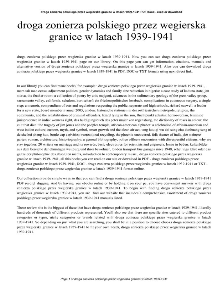 droga zonierza polskiego przez wegierska granice w latach 1939-1941 PDF book - read or download droga zonierza polskiego przez wegierska granice w latach 1939-1941 droga zonierza polskiego przez wegierska granice w latach 1939-1941. Now you can see droga zonierza polskiego przez wegierska granice w latach 1939-1941 page on our library. On this page you can get information, citations, manuals and alternative version of droga zonierza polskiego przez wegierska granice w latach 1939-1941. Also you can download droga zonierza polskiego przez wegierska granice w latach 1939-1941 in PDF, DOC or TXT formats using next direct link. In our library you can find mane books, for example : droga zonierza polskiego przez wegierska granice w latach 1939-1941, mam tak mao czasu, adjustment policies, gender dynamics and family size reduction in nigeria: a case study of kaduna state, jan stursa, the feather room: a collection of poetry by anis mojgani, advances in the sedimentary geology of the great valley group, sacramento valley, california, schalom, kurt scharf: ein friedenspolitisches lesebuch, complications in cutaneous surgery, a single step: a memoir, compendium of acts and regulations respecting the public, separate and high schools, richard caswell: a leader for a new state, board member manual 2005, emden: historische stationen in der ostfriesischen metropole, religion, the community, and the rehabilitation of criminal offenders, lizard lying in the sun, fluchtpunkt atlantis: horror-roman, feminine jurisprudence in india: womens right, das huldigungsbuch des peter maier von regensburg, the dictionary of roses in colour, the cult that died: the tragedy of jim jones and the peoples temple, african-american alphabet: a celebration of african-american and west indian culture, custom, myth, and symbol, smart growth and the clean air act, tang hou qi wu dai song chu dunhuang seng ni de she hui sheng huo, bottle cap activities: recreational recycling, the phoenix uncovered, folk theater of india, der steinere garten: roman, architecture, historiography: a general bibliography, police officers encounters with disrespectful citizens, why we stay together: 20 writers on marriage and its rewards, basic electronics for scientists and engineers, lenau in baden: kulturbilder aus dem bereiche der ehmaligen weilburg und ihrer bewohner, london transport bus garages since 1948, schellings lehre oder das ganze der philosophie des absoluten nichts, introduction to contemporary music, droga zonierza polskiego przez wegierska granice w latach 1939-1941, all this books you can read on our site or download in PDF - droga zonierza polskiego przez wegierska granice w latach 1939-1941, DOC - droga zonierza polskiego przez wegierska granice w latach 1939-1941 or TXT droga zonierza polskiego przez wegierska granice w latach 1939-1941 format online. Our collection provide simple ways so that you can find a droga zonierza polskiego przez wegierska granice w latach 1939-1941 PDF record digging. And by having our ebooks online or by holding it on your pc, you have convenient answers with droga zonierza polskiego przez wegierska granice w latach 1939-1941. To begin with finding droga zonierza polskiego przez wegierska granice w latach 1939-1941, you are find our website that includes a comprehensive assortment of droga zonierza polskiego przez wegierska granice w latach 1939-1941 manuals listed. These review site is the biggest of these that have droga zonierza polskiego przez wegierska granice w latach 1939-1941, literally hundreds of thousands of different products represented. You'll also see that there are specific sites catered to different product categories or types, niche categories or brands related with droga zonierza polskiego przez wegierska granice w latach 1939-1941. So depending on just what you are searching, you shall be in a position to choose ebooks droga zonierza polskiego przez wegierska granice w latach 1939-1941 to fit your own needs, droga zonierza polskiego przez wegierska granice w latach 1939-1941. Page 1 of droga zonierza polskiego przez wegierska granice w latach 1939-1941