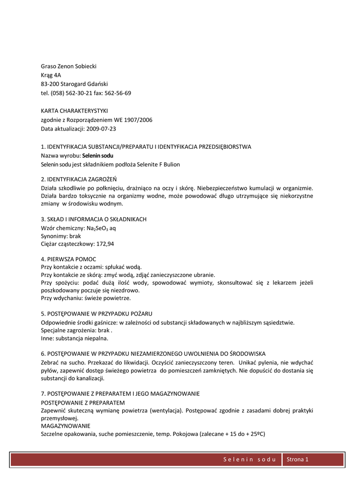 Graso Zenon Sobiecki Krąg 4A 83-200 Starogard Gdański tel. (058) 562-30-21 fax: 562-56-69 KARTA CHARAKTERYSTYKI zgodnie z Rozporządzeniem WE 1907/2006 Data aktualizacji: 2009-07-23 1. IDENTYFIKACJA SUBSTANCJI/PREPARATU I IDENTYFIKACJA PRZEDSIĘBIORSTWA Nazwa wyrobu: Selenin sodu Selenin sodu jest składnikiem podłoża Selenite F Bulion 2. IDENTYFIKACJA ZAGROŻEŃ Działa szkodliwie po połknięciu, drażniąco na oczy i skórę. Niebezpieczeństwo kumulacji w organizmie. Działa bardzo toksycznie na organizmy wodne, może powodować długo utrzymujące się niekorzystne zmiany w środowisku wodnym. 3. SKŁAD I INFORMACJA O SKŁADNIKACH Wzór chemiczny: Na2SeO3 aq Synonimy: brak Ciężar cząsteczkowy: 172,94 4. PIERWSZA POMOC Przy kontakcie z oczami: spłukać wodą. Przy kontakcie ze skórą: zmyć wodą, zdjąć zanieczyszczone ubranie. Przy spożyciu: podać dużą ilość wody, spowodować wymioty, skonsultować się z lekarzem jeżeli poszkodowany poczuje się niezdrowo. Przy wdychaniu: świeże powietrze. 5. POSTĘPOWANIE W PRZYPADKU POŻARU Odpowiednie środki gaśnicze: w zależności od substancji składowanych w najbliższym sąsiedztwie. Specjalne zagrożenia: brak . Inne: substancja niepalna. 6. POSTĘPOWANIE W PRZYPADKU NIEZAMIERZONEGO UWOLNIENIA DO ŚRODOWISKA Zebrać na sucho. Przekazać do likwidacji. Oczyścić zanieczyszczony teren. Unikać pylenia, nie wdychać pyłów, zapewnić dostęp świeżego powietrza do pomieszczeń zamkniętych. Nie dopuścić do dostania się substancji do kanalizacji. 7. POSTĘPOWANIE Z PREPARATEM I JEGO MAGAZYNOWANIE POSTĘPOWANIE Z PREPARATEM Zapewnić skuteczną wymianę powietrza (wentylacja). Postępować zgodnie z zasadami dobrej praktyki przemysłowej. MAGAZYNOWANIE Szczelne opakowania, suche pomieszczenie, temp. Pokojowa (zalecane + 15 do + 25ºC) Selenin sodu Strona 1 8. KONTROLA NARAŻENIA I ŚRODKI OCHRONY INDYWIDUALNEJ Środki ochrony indywidualnej: Ochrona dróg oddechowych: konieczna w przypadku pylenia-respirator. Ochrona oczu: konieczna – okulary ochronne Ochrona rąk – konieczna – rękawice ochronne Ochrona ciała – konieczna – ubranie ochronne Środki ochronne i higieny: natychmiast zmienić skażone ubranie, Wymyć twarz i ręce po pracy z tą substancją. 9. WŁAŚCIWOŚCI FIZYKOCHEMICZNE Forma: ciało stałe Kolor: biały Zapach: słaby, charakterystyczny PH: około 9 (w 20ºC) Temp. topnienia: pow. 300ºC Temp. wrzenia: nie dotyczy Temp. samozapłonu: nie dotyczy Temp. zapłonu: nie dotyczy Granice wybuchowości: nie dotyczy Lepkość dynamiczna: Lepkość kinematyczna: Ciśnienie par: brak danych Gęstość: brak danych Ciężar nasypowy: Rozpuszczalność: w wodzie: 460g/l (20ºC) jako 5 hydrat w rozpuszczalnikach organicznych: nie rozpuszczalny w etanolu (20ºC) 10. STABILNOŚĆ I REAKTYWNOŚĆ Warunki których należy unikać: Materiały których należy unikać: Niebezpieczne produkty rozkładu: Następne dane: brak brak brak brak 11. INFORMACJE TOKSYKOLOGICZNE LD50 7mg/kg (szczury) jako substancja bezwodna Pozostałe dane: przy wdychaniu pyłów: podrażnia błony śluzowe, powoduje kaszel i duszności; przy absorpcji ilości toksycznych: senność, zaburzenia widzenia, zaburzenia pracy serca, przy kontakcie z oczami: podrażnienia, ze skórą: podrażnienia. 12. INFORMACJE EKOLOGICZNE Ogólnie dla związków litu: ryby: od 100mg/l 13. POSTĘPOWANIE Z ODPADAMI Ustawy z dnia 27.04.2001 (Dz. U. Nr 62, poz. 628), z dnia11.05.2001 (Dz. U. Nr 63 poz.638) Rozporządzenie z dnia 27.09.2001 (dz. U. Nr 112, poz. 1206) Selenin sodu Strona 2 14. INFORMACJE O TRANSPORCIE Patrz pkt. 7 15. INFORMACJE DOTYCZĄCE PRZEPISÓW PRAWNYCH Dz. U. Nr 140, Rozporządzenie z dnia 3 lipca 2002 (poz. 1171) Dz. U. Nr 171, Rozporządzenie z dnia 2 września 2003 (poz. 1666) Dz. U. Nr 173, Rozporządzenie z dnia 2 września 2003 (poz. 1679) Dz. U. Nr 199, Rozporządzenie z dnia 2 września 2003 (poz. 1948) Rozporządzenie (WE) nr 1907/2006 Parlamentu Europejskiego i Rady z dnia 18 grudnia 2006 r. w sprawie rejestracji, oceny, udzielania zezwoleń i stosowanych ograniczeń w zakresie chemikaliów (REACH), utworzenia Europejskiej Agencji Chemikaliów, zmieniające dyrektywę 1999/45/WE oraz uchylające rozporządzenie Rady (EWG) nr 793/93 i rozporządzenie Komisji (WE) nr 1488/94, jak również dyrektywę Rady 76/769/EWG i dyrektywy Komisji 91/155/EWG, 93/67/EWG, 93/105/WE, 2000/21/WE. Dziennik Urzędowy UE 396/06 poz. I. 16. INNE INFORMACJE Brak danych. Graso Biotech Krąg 4A. 83-200 Starogard Gdański Dział Obsługi Klienta: 058 562 30 21, 058 562 56 61 do 64 wew. 30, [email protected]; www.podloza.pl, www.grasobiotech.pl Selenin sodu Strona 3