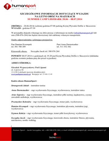 SZCZEGÓŁOWE INFORMACJE DOTYCZĄCE WYJAZDU NA LETNI OBÓZ NA MAZURACH SUMMER CAMP LIDZBARK 28.06 – 08.07.2014 ZBIÓRKA – 28.06.2014r (sobota) godzina 07:00 parking Krytej Pływalni Delfin w Skoczowie. WYJAZD - godzina 07:30 W przypadku dojazdu własnego na obóz proszę o informacje na maila ([email protected]) lub sms (508-076-264) kto będzie dowieziony lub odebrany własnym transportem. Osoby odpowiedzialne i pilotujące przejazd to: Pan Damian Krzempek tel. 501 708 309 Kierownik obozu: Pani Anna Darmsteadter tel. 511 552 382 Szczypka Jacek tel. 508 076 264 POWRÓT 08.07.2014 w godzinach ok 19-20 pod Krytą Pływalnię Delfin w Skoczowie (dokładna godzina zostanie podana parę dni przed wyjazdem) ADRES OŚRODKA: Ośrodek Wypoczynkowy Pod Lipami ul. Lipowa 46 13-230 Lidzbark (powiat działdowski) www.podlipami.mazury.pl Recepcja: tel. 23 696 12 49 Kadra obozu HumanSport: Strungowski Jakub – instruktor tenisa Anna Darmstaedter – mgr wychowania fizycznego, wychowawca, instruktor tańca Artur Sajewicz – mgr wychowania fizycznego, instruktor piłki nożnej, kajakarstwa, czynny zawodnik unihokeja, wychowawca Przemysław Kolondra – mgr wychowania fizycznego, trener judo, wychowawca Damian Krzempek – mgr wychowania fizycznego, instruktor pływania, instruktor jogi, wychowawca Szymon Kałuża – mgr wychowania fizycznego, trener piłki koszykowej, wychowawca Szczypka Jacek – mgr wychowania fizycznego, kierownik obozu, instruktor fitness, pływania, narciarstwa, nordic walking. LISTA RZECZY NIEZBĘDNYCH NA OBÓZ: - legitymacja szkolna, karta NFZ - kieszonkowe (możliwość kontroli wychowawców na życzenie rodziców) - latarka - rakieta do tenisa ziemnego – niezbędna - krótkie spodenki sportowe (kilka par) - obuwie sportowe: 2-3 pary, sandały - wystarczająca ilość bielizny na każdy dzień (duża ilość skarpetek i majtek) - spodnie sportowe (polar, bawełna, 2-3 pary) - koszulki sportowe: (duża ilość - minimalnie 8 szt.) - bluzy sportowe, polar, kurtka - kurtka przeciwdeszczowa, peleryna (absolutnie konieczna!!) - ręczniki: 2 duże i 1 mały - potrzebne kosmetyki do codziennej toalety (mydło, szczoteczka do zębów, pasta itd) - strój kąpielowy, czepek i okularki pływackie, klapki - plastry, chusteczki higieniczne, chusteczki nawilżane, krem ochronny z filtrem przeciwsłonecznym - najlepiej w sprayu - preparaty przeciwko komarom i kleszczom – najlepiej w sprayu - zestaw ubrań "town tour" – "na miasto" - zestaw ubrań "disco" - proszę przygotować dziecku coś śmiesznego do przebrania na jeden z wieczorów – liczymy na inwencje twórczą rodziców i dzieci :) - mały wygodny plecak na wycieczki Ważne: Cokolwiek nowego kupią Państwo na wyjazd, proszę to dzieciom pokazać! Proponujemy włożyć do bagażu wyżej wymienioną listę rzeczy jakie przywożą na obóz by z nią mogli wszystko spakować i dowieźć do domu. Organizatorzy nie biorą odpowiedzialności za sprzęt zabrany na obóz (komórki, aparaty, odtwarzacze itp) oraz za rzeczy zgubione. Na obozie w ciągu dnia jest zakaz korzystania z telefonów komórkowych. Telefony dzieci będą otrzymywać zawsze po kolacji na pół godziny – będzie to czas poświęcony na kontakt z rodzicami i dzielenie się wrażeniami. Dokładna lista grup (przydział dzieci do poszczególnych grup oraz ich opiekunowie) zostanie wypisana w pierwszym dniu obozu na naszej stronie wraz z numerami kontaktowymi do wychowawców. Osoby które chcą otrzymać potwierdzenie udziału w obozie w postaci pisma, rachunku czy faktury proszone są o dokładne określenie formy oraz ewentualnych danych do dokumentu na maila [email protected] W razie pytań prosimy o kontakt telefoniczny 508-076-264. Kadra HumanSport