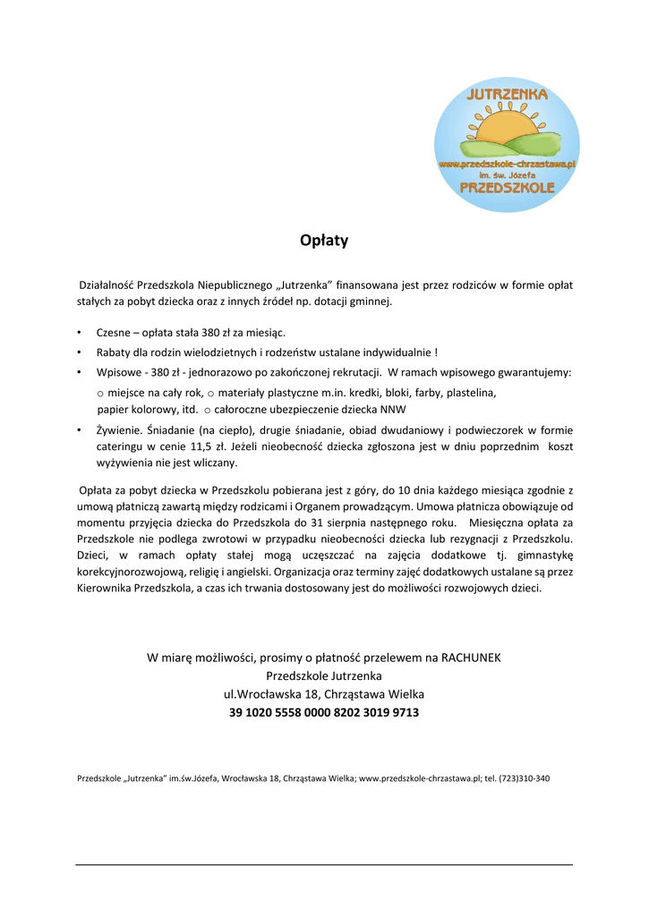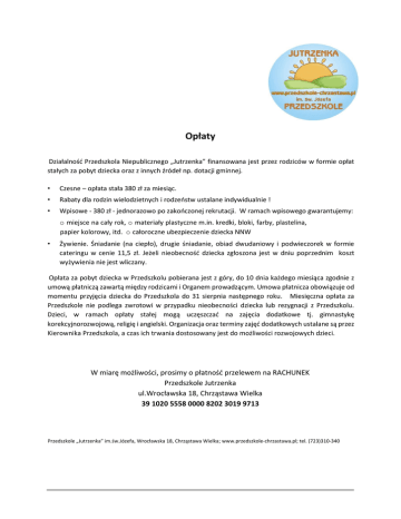 Opłaty Działalność Przedszkola Niepublicznego „Jutrzenka” finansowana jest przez rodziców w formie opłat stałych za pobyt dziecka oraz z innych źródeł np. dotacji gminnej. • Czesne – opłata stała 380 zł za miesiąc. • Rabaty dla rodzin wielodzietnych i rodzeństw ustalane indywidualnie ! • Wpisowe - 380 zł - jednorazowo po zakończonej rekrutacji. W ramach wpisowego gwarantujemy: o miejsce na cały rok, o materiały plastyczne m.in. kredki, bloki, farby, plastelina, papier kolorowy, itd. o całoroczne ubezpieczenie dziecka NNW • Żywienie. Śniadanie (na ciepło), drugie śniadanie, obiad dwudaniowy i podwieczorek w formie cateringu w cenie 11,5 zł. Jeżeli nieobecność dziecka zgłoszona jest w dniu poprzednim koszt wyżywienia nie jest wliczany. Opłata za pobyt dziecka w Przedszkolu pobierana jest z góry, do 10 dnia każdego miesiąca zgodnie z umową płatniczą zawartą między rodzicami i Organem prowadzącym. Umowa płatnicza obowiązuje od momentu przyjęcia dziecka do Przedszkola do 31 sierpnia następnego roku. Miesięczna opłata za Przedszkole nie podlega zwrotowi w przypadku nieobecności dziecka lub rezygnacji z Przedszkolu. Dzieci, w ramach opłaty stałej mogą uczęszczać na zajęcia dodatkowe tj. gimnastykę korekcyjnorozwojową, religię i angielski. Organizacja oraz terminy zajęć dodatkowych ustalane są przez Kierownika Przedszkola, a czas ich trwania dostosowany jest do możliwości rozwojowych dzieci. W miarę możliwości, prosimy o płatność przelewem na RACHUNEK Przedszkole Jutrzenka ul.Wrocławska 18, Chrząstawa Wielka 39 1020 5558 0000 8202 3019 9713 Przedszkole „Jutrzenka” im.św.Józefa, Wrocławska 18, Chrząstawa Wielka; www.przedszkole-chrzastawa.pl; tel. (723)310-340