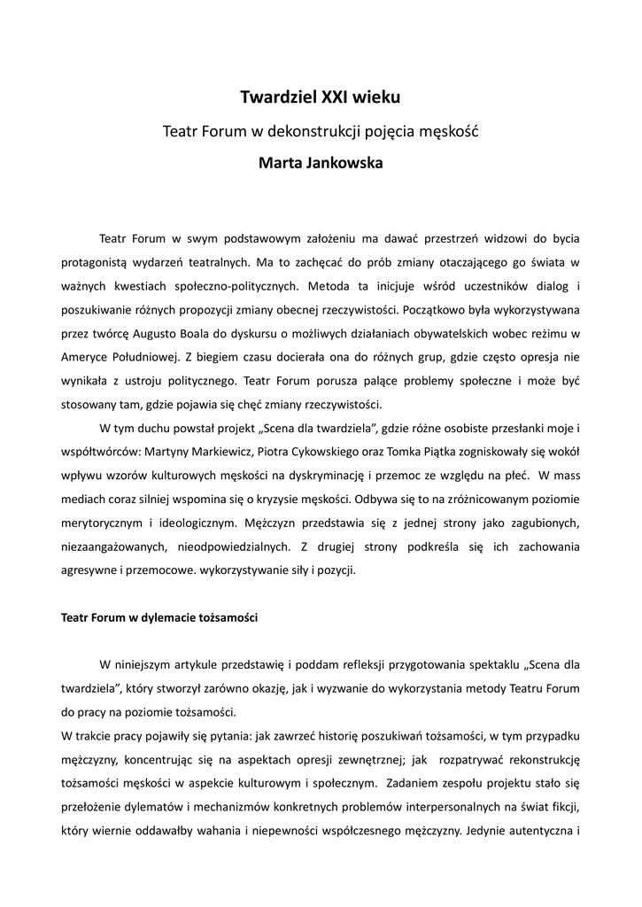 Twardziel XXI wieku Teatr Forum w dekonstrukcji pojęcia męskośd Marta Jankowska Teatr Forum w swym podstawowym założeniu ma dawad przestrzeo widzowi do bycia protagonistą wydarzeo teatralnych. Ma to zachęcad do prób zmiany otaczającego go świata w ważnych kwestiach społeczno-politycznych. Metoda ta inicjuje wśród uczestników dialog i poszukiwanie różnych propozycji zmiany obecnej rzeczywistości. Początkowo była wykorzystywana przez twórcę Augusto Boala do dyskursu o możliwych działaniach obywatelskich wobec reżimu w Ameryce Południowej. Z biegiem czasu docierała ona do różnych grup, gdzie często opresja nie wynikała z ustroju politycznego. Teatr Forum porusza palące problemy społeczne i może byd stosowany tam, gdzie pojawia się chęd zmiany rzeczywistości. W tym duchu powstał projekt „Scena dla twardziela”, gdzie różne osobiste przesłanki moje i współtwórców: Martyny Markiewicz, Piotra Cykowskiego oraz Tomka Piątka zogniskowały się wokół wpływu wzorów kulturowych męskości na dyskryminację i przemoc ze względu na płed. W mass mediach coraz silniej wspomina się o kryzysie męskości. Odbywa się to na zróżnicowanym poziomie merytorycznym i ideologicznym. Mężczyzn przedstawia się z jednej strony jako zagubionych, niezaangażowanych, nieodpowiedzialnych. Z drugiej strony podkreśla się ich zachowania agresywne i przemocowe. wykorzystywanie siły i pozycji. Teatr Forum w dylemacie tożsamości W niniejszym artykule przedstawię i poddam refleksji przygotowania spektaklu „Scena dla twardziela”, który stworzył zarówno okazję, jak i wyzwanie do wykorzystania metody Teatru Forum do pracy na poziomie tożsamości. W trakcie pracy pojawiły się pytania: jak zawrzed historię poszukiwao tożsamości, w tym przypadku mężczyzny, koncentrując się na aspektach opresji zewnętrznej; jak rozpatrywad rekonstrukcję tożsamości męskości w aspekcie kulturowym i społecznym. Zadaniem zespołu projektu stało się przełożenie dylematów i mechanizmów konkretnych problemów interpersonalnych na świat fikcji, który wiernie oddawałby wahania i niepewności współczesnego mężczyzny. Jedynie autentyczna i prawdopodobna historia dawałaby możliwośd poszukiwania alternatywnych wyborów budujących mężczyznę wolnego od zachowao agresywnych. „Krytyczna analiza funkcjonujących ideałów męskości – zastanawianie się nad tym, w jaki sposób, dlaczego i w imię czyich interesów konstruowane są one inaczej w zależności od kontekstu historycznego, społecznego czy kulturowego – neutralizuje i zmniejsza ich wpływ na kształtowanie naszego sposobu widzenia siebie, świata i innych”1. Teatr Forum jest formą z pogranicza teatru i edukacji, który tworzy się dla określonych grup zmagających się z podobnym problemem społecznym. Specyfika pracy projektowej i źródeł dofinansowania z góry określiła nam grupy docelowe ze względu na położenie (cztery miasta: Warszawa, Lublin, Poznao i Kraków). Mieliśmy mgliste wyobrażenie o potencjalnych widzoaktorach. Ze względu na partnerstwa organizacji lokalnych spodziewaliśmy się części osób ze środowiska LBGT, których osobiste doświadczenia często nacechowane silnie dyskryminacją i/lub przemocą kładą nacisk w innych obszarach wzorców kulturowych. Stawiało to przed nami wyzwanie stworzenia historii „twardziela” reprezentatywnej dla grup odbiorców o różnych doświadczeniach związanych z dyskryminacją i przemocą ze strony mężczyzn. Bazowaliśmy na podejściu antydyskryminacyjnym, filmie „Maska twardziela” oraz książce „Paradoks Macho” Jacksona Katza. Do grupy zaprosiliśmy zarówno kobiety, jak i mężczyzn - aktywistki_ów społecznych i trenerki/ów edukacji ekologicznej, globalnej, działaczki/y antydyskryminacyjne/ych, trenerki/ów, aktora i terapeutę - osoby2 zainteresowane oddziaływaniami związanymi ze zmianą spostrzegania tego, czym jest „męskośd”. Zależało nam na różnorodnej grupie, dla której temat będzie bliski własnym doświadczeniom oraz która będzie szukała inspiracji do poszerzania swoich działao zawodowych w tym aspekcie. Gotowośd do wchodzenia w role, bycia na scenie oraz otwartośd na kwestie genderowe sprawdzaliśmy podczas warsztatów rekrutacyjnych, gdzie jednym z zadao było odegranie wybranej bajki z zamianą płci u postaci. Eksploracja „meskości” Proces tworzenia Teatru Forum rozpoczyna się od poszukiwania mechanizmów opresji. Dlatego też zadbaliśmy o różnorodną grupę aktorów, zbieranie dostępnych materiałów, klasyfikacji i podejśd zarówno w obszarze definicji męskości, jak i wpływu na dyskryminację i przemoc. 1 Maska Twardziela. Przemoc, media i kryzys męskości. Podręcznik do prowadzenia zajęd w oparciu o film. Fundacja Autonomia, Stowarzyszenie Kobiet KONSOLA 2010 2 Więcej o zespole na scenadlatwardziela.blogspot.com Różnorodnośd naszego zespołu wynikała nie tylko z aktywności zawodowej, lecz także wieku, orientacji seksualnej, tożsamości płciowej, doświadczeo dyskryminacji i/lub przemocy psychicznej, fizycznej i seksualnej ze strony mężczyzn oraz z gotowości do dzielenia się i korzystania z osobistych historii w trakcie twórczego procesu. Etap eksploracji źródeł i mechanizmów opresji mężczyzn rozpoczęliśmy od analizy klatki płci (mężczyzny)3 na warsztacie z Marcinem Dziurokiem z Fundacji Autonomia. Zebraliśmy hasła wtłaczające chłopców i mężczyzn w dominujące pojęcie męskości. Na potrzeby tego artykułu pogrupowałam je w obszar dotyczący: stanów emocjonalnych: chłopaki nie płaczą, zaciśnij zęby, nie wolno ci się poddad, nie bądź baba, bądź odważny/rycerski, musisz dad rade; zadao życiowych: spłodzid syna, posadzid drzewo i wybudowad dom, prawdziwy facet ma prawo jazdy, prawdziwy facet zaczyna się od 2 i pół tysięca na rękę, masz byd zdobywcą, opiekuj się kobietami, nigdy nie zrozumiesz kobiety; 