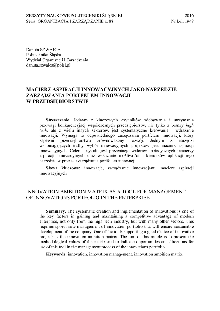 macierz aspiracji innowacyjnych jako narzędzie zarządzania