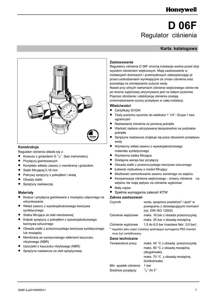D 06F Regulator ciśnienia Karta katalogowa Zastosowanie Regulatory ciśnienia D 06F chronią instalacje wodne przed zbyt wysokim ciśnieniem wejściowym. Mają zastosowanie w instalacjach domowych i przemysłowych zabezpieczając je przed uszkodzeniami wynikającymi ze zmian ciśnienia oraz pozwalają na zmniejszenie zużycia wody. Nawet przy silnych wahaniach ciśnienia wejściowego ciśnie-nie po stronie wyjściowej utrzymywane jest na stałym poziomie. Poprzez obniżenie i stabilizację ciśnienia zostają zminimalizowane szumy przepływu w całej instalacji. Właściwości Konstrukcja Regulator ciśnienia składa się z: Korpusu z gniazdami G 1/4” (bez manometru) Przyłączy gwintowanych Kompletu wkładu zaworu z membraną i gniazdem Siatki filtrującej 0,16 mm Pokrywy sprężyny z pokrętłem i skalą Obsady siatki Sprężyny nastawczej Materiały Korpus i przyłącza gwintowane z mosiądzu odpornego na odcynkowanie Wkład zaworu z wysokojakościowego tworzywa syntetycznego Siatka filtrująca ze stali nierdzewnej Kołpak sprężyny z pokrętłem z wysokojakościowego tworzywa sztucznego Obsada siatki z przezroczystego tworzywa syntetycznego lub mosiądzu Membrana ze wzmacnianego włóknami kauczuku nitrylowego (NBR) Uszczelki z kauczuku nitrylowego (NBR) Sprężyna nastawcza ze stali sprężynowej Certyfikaty DVGW Testy poziomu szumów do wielkości 1 1/4”- Grupa 1 bez ograniczeń Nastawianie ciśnienia za pomocą pokrętła Wartość zadana odczytywana bezpośrednio na podziałce pokrętła Sprężyna nastawcza znajduje się poza obszarem przepływu wody Wymienny wkład zaworu z wysokojakościowego materiału syntetycznego Wymienna siatka filtrująca Dostępna wersja bez przyłączy Obsada siatki z przezroczystego tworzywa sztucznego Łatwość rozbudowy o moduł filtrujący Możliwość zamontowania zaworu zwrotnego na wejściu Kompensacja ciśnienia wejściowego - zmiany ciśnienia na wejściu nie mają wpływu na ciśnienie wyjściowe Mały ciężar Spełnia wymagania zaleceń KTW Zakres zastosowań Czynnik Ciśnienie wejściowe Ciśnienie wyjściowe * regulator jako część instalacji spełniająca wymagania PED również musi być certyfikowany Dane techniczne Temperatura pracy Min. spadek ciśnienia Średnice przyłączy D06F-k-pl01rMW0511 woda, sprężone powietrze* i azot* w powiązaniu z obowiązującymi normami (np. DIN ISO 12502) maks. 16 bar z obsada przezroczystą maks. 25 bar z obsadą mosiężną 1,5 do 6,0 bar (nastawa fabr. 3,0 bar) maks. 40 C z obsadą przezroczystą maks. 60 C z obsadą mosiężną (długotrwale) maks. 70 C z obsadą mosiężną (krótkotrwale) 1 bar 1 /2” do 2” 1 D06F Regulator ciśnienia Zasada działania Regulator ciśnienia działa na zasadzie równowagi sił działających na membranę: z jednej strony wynikającej z napięcia sprężyny, a z drugiej strony sił parcia od ciśnienia po redukcji. W przypadku występowania zmiennego ciśnienia wejściowego ruchomy wkład zaworu ustawia się w nowe położenie równowagi dla danej nastawy ciśnienia i ilości odbieranej wody (kompensacja ciśnienia wejściowego). W przypadku ustania poboru wody - zawór całkowicie się domyka. H Oznaczenia: D 06F -...A = z przyłączami gwintowanymi i przezroczystą obsadą siatki - do 40 C D 06F -...B = z przyłączami gwintowanymi i mosiężną obsadą siatki - do 70 C D 06F -...E = bez przyłączy, z przezroczystą obsadą siatki do 40 C h D I L Wielkość przyłącza R Wersje specjalne na życzenie 1 /2 ” 3 /4 ” 1” 1 1 /4 ” 1 1 /2 ” 2” Wielkości przyłączy R Wielkość nominalna DN 15 20 25 32 40 50 Ciężar (w przybliżeniu) Wymiary (kg) (mm) L I H h D 0,8 1,0 1,4 2,0 3,3 4,5 140 80 89 58 54 160 90 89 58 54 180 100 111 64 61 200 105 111 64 61 225 130 173 126 82 255 140 173 126 82 2,4 3,1 5,8 5,9 12,6 12,0 Wartość kvs Certyfikat DVGW DW-6330AT2314 Akcesoria FN 09S Filtr przezbrajalny Drobnosiatkowy filtr z płukaniem wstecznym do rozbudowy do stacji wodnej dla regulatorów ciśnienia D 06FN M 07M Manometr Obudowa 63mm, przyłącze tylne G 1/4" Zakresy: 0-4; 0-10; 0-16; 0-25 bar Przy zamówieniu należy podać zakres ZR 06K Dwustronny klucz oczkowy Do demontażu obsady siatki i pokrywy sprężyny, dla wielkości R 1/2” - 2” RV 277 Zawór zwrotny Dla D 06F wielkości R 1/2" do 2" VST 06 Przyłącza Z końcówkami gwintowanymi lub do lutowania A = z końcówką gwintowaną B = z końcówką do lutowania M 07 ZR 06K RV 277 FN 09S VST 06A 4 2 VST 06B D06F Regulator ciśnienia Przykład instalacji Wielkości przyłączy W* * R DN mm 1 /2 ” 15 55 3 /4 ” 20 55 1” 25 55 1 1 /4 ” 32 60 1 1 /2 ” 40 70 2” 50 70 Minimalna odległość od ściany do osi przewodu Zasady instalacji Montować na poziomym odcinku instalacji z obsadą siatki skierowaną ku dołowi Zamontowanie zaworów odcinających Urządzenia o niskim ciśnieniu roboczym powinny być chronione zaworami bezpieczeństwa Lokalizacja powinna zapewnić ochronę przed mrozem oraz łatwy dostęp: Tak aby manometr był dobrze widoczny Przy przezroczystej obsadzie siatki można łatwo określić stopień jej zanieczyszczenia Łatwo przprowadzić serwis i kontrolę W domowej instalacji przed regulatorem należy montować filtr drobnosiatkowy (dodatkowe zabezpieczenie przed zanieczyszczeniami) Zalecany jest prosty odcinek rury za regulatorem o długości conajmniej 5 razy większej od średnicy nominalnej (zgodnie z DIN 1988, część 5) Typowe zastosowania Regulatory ciśnienia typu D 06F są przeznaczone do wszystkich typów domowych instalacji wodnych. Mogą być montowane również w instalacjach przemysłowych zgodnie ze swoim przeznaczeniem i z uwzględnieniem parametrów technicznych. Regulator ciśnienia D 06F powinien być instalowany: Gdy ciśnienie statyczne przekracza maksymalne, dopuszczalne ciśnienie w instalacji W celu obniżenia poziomu hałasu, gdy ciśnienie w miejscach poboru przekracza 5,0 bar W przypadku podziału instalacji na strefy ciśnienia np. na k