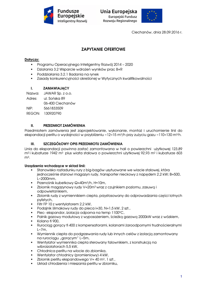 Ciechanów, dnia 28.09.2016 r. ZAPYTANIE OFERTOWE Dotyczy: Programu Operacyjnego Inteligentny Rozwój 2014 – 2020 Działania 3.2 Wsparcie wdroŜeń wyników prac B+R Poddziałania 3.2.1 Badania na rynek Zasady konkurencyjności określonej w Wytycznych kwalifikowalności I. Nazwa: Adres: ZAMAWIAJĄCY JAWAR Sp. z o.o. ul. Sońska 89 06-400 Ciechanów NIP: 5661833509 REGON: 130920790 II. PRZEDMIOT ZAMÓWIENIA Przedmiotem zamówienia jest zaprojektowanie, wykonanie, montaŜ i uruchomienie linii do ekspandacji perlitu o wydajności w przybliŜeniu ~12÷15 m3/h przy zuŜyciu gazu ~110÷130 m3/h. III. SZCZEGÓŁOWY OPIS PRZEDMIOTU ZAMÓWIENIA Linia do ekspandacji powinna zostać zamontowana w hali o powierzchni uŜytkowej 123,89 m2 i kubaturze 1942 m3 plus wiata stalowa o powierzchni uŜytkowej 92,93 m2 i kubaturze 603 m 3. Urządzenia wchodzące w skład linii: Stanowisko rozładunku rury z big-bagów usytuowane we wiacie stalowej, która jednocześnie stanowi magazyn rudy, transporter nieckowy z napędem 2,2 kW; B=500, L~2000mm, Przenośnik kubełkowy Q=40m3/h, H≈10m, Zbiornik magazynowy rudy V=20m3 wraz z czujnikiem poziomu, zasuwą i odpowietrznikiem, Zbiornik rudy z wymiennikiem ciepła, przystosowany do odprowadzania części lotnych pylistych, Filtr FP 10 z wentylatorem 2,2 kW, Podajnik ślimakowy rudy do pieca i=30, N=1,5 kW, 2 szt., Piec- ekspandor, izolacja odporna na temp 1100°C, Palnik gazowy modułowy z wyposaŜeniem, ścieŜką gazową 2000kW wraz z wózkiem, Kolano fi 900, Rurociąg gorący fi 400 z kompensatorami, kolanami Ŝaroodpornymi trudnościeralnymi L~7m, Wymiennik ciepła do podgrzewania rudy lub innych celów z izolacją zamontowany na rurociągu „gorącym” L~5m, Wentylator wymiennika ciepła sterowany falownikiem, z konstrukcją na wibroizolatorach 5,5 kW, Chłodnica perlitu na wlocie do zbiornika, Wentylator chłodnicy (promieniowy) 4 kW, Zbiornik perlitu ekspandowego V= 40 m3, 1 szt., Układ chłodzenia i mieszania perlitu w zbiorniku, 1 Wentylator do układu chłodzenia sterowany falownikiem 5,5 kW, Pakowaczka uniwersalna ręczna na worki papierowe 120l lub worki BIG BAG, Klapa do regulacji przepływu powietrza i spalin ze zbiornika do układu odpylania ze zdalnym napędem elektrycznym, Wylot ze zbiornika perlitu do cyklonu, Cyklon fi 1600 przystosowany do odpylania perlitu, rozdzielacz pneumatyczny, konstrukcja wsporcza, Zbiornik buforowy pod cyklonem i pod filtrem z klapą spustową, czujnik poziomu wraz z konstrukcją nośną 2 szt., Pakowaczka uniwersalna (pojemnościowa) ręczna na worki papierowe 120 l. lub worki BIG BAG 2 szt., Podajnik ślimakowy DN=200, L≈5,5M, 4Kw, 2 szt., Rurociąg cyklonu- filtr z klapą regulującą dopływ powietrza chłodzącego regulowany elektrycznie, Filtr workowy automatyczny z regulacja wkładu filtracyjnego o powierzchni filtracyjnej 150m2, , Wentylator główny sterowany falownikiem przystosowany do odprowadzania skroplin zamontowany na wibroizolatorach 22 kW, Komin z czopuchem, kompensatorem i konstrukcją wsporczą H=10m, Szafa sterownicza linii do eksplandacji perlitu, Filtr- odpylacz centralny pow. filtr. 25 m2,, Układ transportu perlitu ekspandowanego do silosów magazynowych, kompresor 22 kW, zbiornik 1,5 m3, osuszacz, Instalacja elektryczna+ pneumatyczna, Układ podawania perlitu do węzła betoniarskiego, Zbiornik buforowy perlitu 5 m3 , Układ dozowania objętościowego perlitu 0,25 m3-0,75m3 , Oferta powinna uwzględniać: MontaŜ gotowej konstrukcji, Konstrukcje pod urządzenia, Oprogramowanie do sterowania linią, Rozruch linii, Szkolenia dla obsługi, Serwis i gwarancję, Transport, IV. KRYTERIUM DOPUSZCZAJĄCE 1. Wykonawca musi wykazać się doświadczeniem w produkcji urządzeń oraz montaŜu linii do ekspandacji perlitu - udokumentowanie produkcji i montaŜu w co najmniej 2 zakładach w ciągu ostatnich 3 lat, 2. Wykonawca musi posiadać co najmniej jeden punkt serwisowy na terenie Polski, V. TERMIN REALIZACJI ZAMÓWIENIA Termin realizacji przedmiotu zamówienia: − rozpoczęcie realizacji zamówienia: 01-01-2017 r. − zakończenie realizacji zamówienia: 28-02-2017 r. VI. MIEJSCE DOSTAWY PRZEDMIOTU ZAMÓWIENIA Gmina Glinojeck, Obręb Zygmuntowo działka 145/9 VII. SPOSÓB PRZYGOTOWANIA I WARUNKI SKŁADANIA OFERT Wymagania, co do sposobu przygotowania oferty i warunków jej składania są następujące: 2 1. Ofertę naleŜy sporządzić na załączonym formularzu (załącznik nr 1 do zapytania ofertowego). Wszystkie niezbędne informacje naleŜy zawrzeć w ofercie głównej, i jeśli jest taka konieczność załączyć niezbędne załączniki, wymieniając je w ofercie. Oferty nie złoŜone na formularzu nie będą rozpatrywane. 2. Ofertę naleŜy złoŜyć w formie określonej w pkt VIII. 3. Oferta musi być wypełniona pismem komputerowym lub odręcznym, opatrzona pieczątką Oferenta i podpisana przez osobę/y upowaŜnione do reprezentowania Oferenta. 4. Jeden Oferent moŜe złoŜyć tylko jedną ofertę. 5. Zamawiający wymaga ofert w PLN. 6. Oferty złoŜone po terminie nie będą rozpatrywane. Pod uwagę brany jest termin wpływu oferty. 7. Oferent moŜe przed upływem terminu składania ofert zmienić lub wycofać swoją ofertę. 8. Nie dopuszcza się składania ofert przez podmioty powiązane osobowo lub kapitałowo. VIII. FORMA i MIEJSCE SKŁADANIA OFERT Oferty naleŜy składać poprzez jeden, dogodny dla Wykonawcy sposób: w formie elektronicznej, jako skan podpisanej oferty - mailowo na adres [email protected] w formie papierowej - za pośrednictwem poczty bądź kuriera na adres: ul. Sońska 89 ; 06-400 Ciechanów w formie papierowej - osobiście pod adresem: ul. Sońska 89 ; 06-400 Ciechanów IX. KRYTERIA OCENY OFERT Wybór najkorzystniejszej oferty zostanie dokonany w oparciu o następujące kryteria: cena netto (PLN) - waga 90%, okres gwarancji (w latach) – waga 10% Przyjmuje się, iŜ 1% wagi kryterium = 1 pkt. Zamawiający dokona wyboru najkorzystniejszego przedmiotu zamówienia