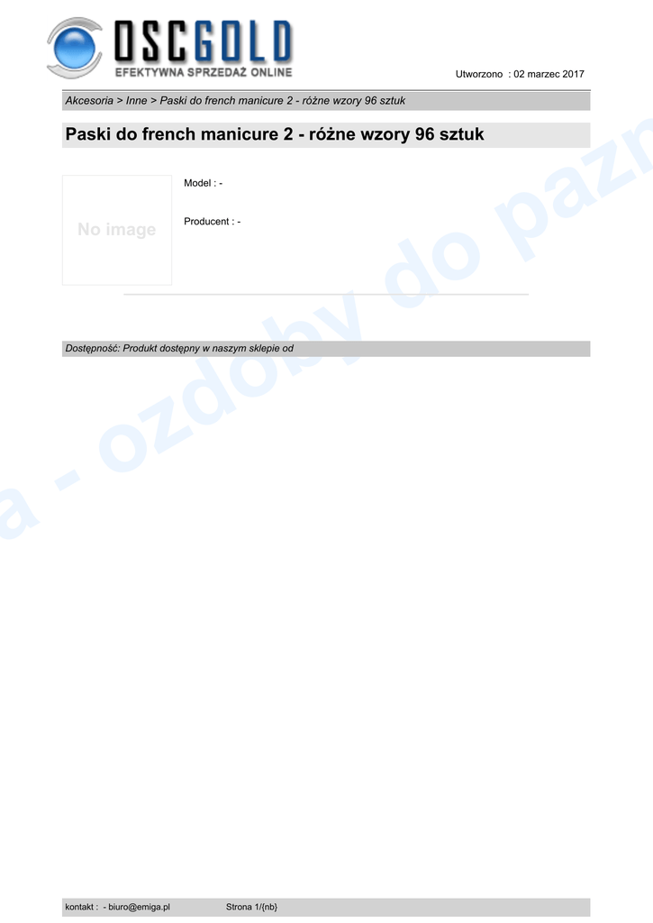 a g Utworzono : 02 marzec 2017 Akcesoria > Inne > Paski do french manicure 2 - różne wzory 96 sztuk n z Paski do french manicure 2 - różne wzory 96 sztuk Model : - Producent : - No image y b o d z Dostępność: Produkt dostępny w naszym sklepie od o - kontakt : - [email protected] Strona 1/{nb} o d a p