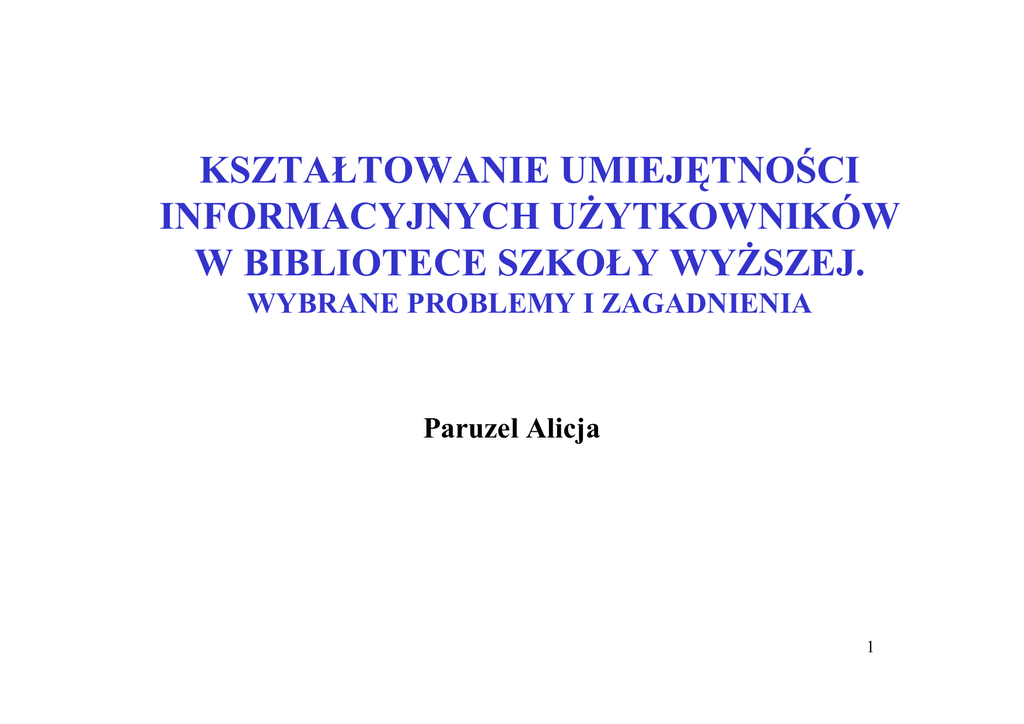 KSZTAŁTOWANIE UMIEJĘTNOŚCI INFORMACYJNYCH UŻYTKOWNIKÓW W BIBLIOTECE SZKOŁY WYŻSZEJ. WYBRANE PROBLEMY I ZAGADNIENIA Paruzel Alicja 1 Umiejętności informacyjne (information literacy): • wiedza o indywidualnych potrzebach informacyjnych, polegająca na identyfikowaniu, lokalizowaniu, ocenie, organizowaniu i efektywnym wykorzystywaniu oraz przekazywaniu informacji w celu rozwiązywania problemów i podejmowania decyzji • wiedza o tym, jak znaleźć informację, jak ją ocenić i efektywnie wykorzystać (za Derfert-Wolf.L. 2005) 2 Osoba posiadająca umiejętności informacyjne: • wie czego szukać bo zna swoje potrzeby informacyjne, • wie gdzie szukać bo zna źródła, • wie jak szukać bo zna techniki i metody poszukiwań, • wie co zrobić ze znalezioną informacją 3 Umiejętności informacyjne: • kształtowane są przez całe życie • przydatne zarówno podczas studiowania, w pracy zawodowej, jak i w życiu codziennym • stanowią podstawę kształcenia, wspólną dla wszystkich dyscyplin, środowisk kształcenia i na wszystkich poziomach edukacji • stanowią podstawę samokształcenia 4 • w literaturze przedmiotu podkreślana jest ważna rola bibliotek w rozwoju kształcenia umiejętności informacyjnych • kształcenie umiejętności informacyjnych wywodzi się z tradycyjnych szkoleń bibliotecznych 5 Założenia szkoleń bibliotecznych: • Szkolenie biblioteczne od początku miało za zadanie wprowadzenie studentów w zagadnienia związane z umiejętnościami korzystania ze zbiorów bibliotecznych – czyli nauczenie studentów umiejętności korzystania ze źródeł informacji zgromadzonych w bibliotekach. • Do przysposobienia studentów do umiejętnego korzystania z zasobów bibliotecznych wprowadzono jednak szereg elementów wchodzących do zajęć z informacji naukowej. • Przyjęto przysposobienie biblioteczne jako pierwszy etap wprowadzający w zagadnienia informacji naukowej. • Drugi etap zajęć z informacji naukowej to kształcenie użytkowników informacji. (Kształcnie użytkowników informacji 1979) 6 Zajęcia przysposabiające studentów oraz zajęcia z informacji naukowej to de facto kolejne etapy kształcenia w tym samym przedmiocie 7 Cel zajęć z informacji naukowej: „Uzbrojenie” studentów w odpowiedni zasób wiedzy, niezbędnej do optymalnej organizacji warsztatu pracy, niezależnie od tego, w jakim środowisku zawodowym dany absolwent znajdzie zatrudnienie – czyli przygotowanie studentów do maksymalnego korzystania z usług informacji naukowej już w toku studiów, a następnie w czasie pracy zawodowej. (Kształcnie użytkowników informacji 1979) Podobieństwo z celem kształcenia w zakresie umiejętności informacyjnych!!! 8 Podstawowe zadania w kształceniu w zakresie informacji naukowej: Przekazanie określonego zasobu wiedzy oraz spełnienie ważnych funkcji praktycznych – czyli przygotowanie studenta a następnie absolwenta szkoły wyższej do właściwego korzystania ze zdobytej wiedzy w działaniu praktycznym 9 Zadania te powinny być realizowane w etapach: I etap: przysposobienie biblioteczne II etap: kształcenie użytkowników informacji Warunkiem skutecznej realizacji tych zadań jest wprowadzenie obowiązkowych zajęć na wszystkich kierunkach studiów 10 Rozwiązania uczelni w zakresie kształcenia z informacji naukowej: • Brak unormowań i uregulowań prawnych na szczeblu państwowym w takim stopniu by zobligować wszystkie uczelnie do wprowadzenia zajęć z informacji naukowej na wszystkich kierunkach nauczania • Rozwiązania w zakresie wprowadzenia zajęć z informacji naukowej są różnorodne i pozostają w gestii danej uczelni w zależności od podejścia – a raczej rozumienia potrzeby nauczania informacji naukowej przez władze konkretnej uczelni, konkretnego wydziału. 11 Przykłady rozwiązań : • Zajęcia prowadzone w poszczególnych (wybranych) wydziałach lub instytutach przez pracowników biblioteki (np.Uniwersytet Technologiczno-Przyrodniczy w Bydgoszczy, Politechnika Śląska) • Zajęcia prowadzone w ramach seminarium dyplomowego • Zajęcia prowadzone w poszczególnych (wybranych) wydziałach (instytutach) prowadzone przez pracowników tych wydziałów (np. Politechnika Częstochowska) 12 POLITECHNIKA CZĘSTOCHOWSKA WYDZIAŁ INŻYNIERII I OCHRONY ŚRODOWISKA PROGRAMY STUDIÓW dla kierunku INŻYNIERIA ŚRODOWISKA STUDIA STACJONARNE II STOPNIA SPECJALNOŚĆ :TECHNOLOGIA WODY I ŚCIEKÓW Nazwa przedmiotu: Informacja naukowo-techniczna Semestr:III Rodzaj zajęć: Ćwiczenia Liczba godzin/tydzień 2C Liczba punktów ECTS:2 Jednostka: Katedra Chemii, Technologii Wody i Ścieków Wydział Inżynierii i Ochrony Środowiska Status przedmiotu w programie studiów: Przedmiot ogólny, obowiązkowy dla specjalności Technologia wody i ścieków na kierunku Inżynieria środowiska. Opis przedmiotu: Rodzaje wydawnictw pozwalających na zapoznanie się z literaturą naukowa z dziedziny inżynierii i ochrony środowiska, komputerowe bazy danych, metody doboru słów kluczowych, wyszukiwanie informacji naukowych na zadany temat. 13 Cele: Umiejętność wyszukiwania informacji dotyczące konkretnych zagadnień w istniejącym systemie bibliotecznym i bazach danych ze szczególnym uwzględnieniem umiejętności doboru i łączenia słów kluczowych w celu uzyskania precyzyjnych informacji. Metody nauczania: Ćwiczenia. Wymagana wiedza z zakresu: Znajomość podstawowego słownictwa z zakresu języka angielskiego oraz podstawowych zagadnień technologii wody i ścieków. Pomoce dydaktyczne: Materiały dydaktyczne powielane, broszury informacyjne dotyczące sposobu i zakresu możliwości korzystania z bibliotecznych baz danych. Forma egzaminu: Bez egzaminu. Zaliczenie. Uwagi: Tematyka zajęć odpowiednia dla studentów studiów magisterskich przygotowujących się do realizacji prac dyplomowych. 14 Kształcenie użytkowników w bibliotekach uczelnianych Według obowiązującej „Ustawy z dnia 27 czerwc