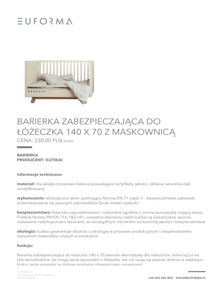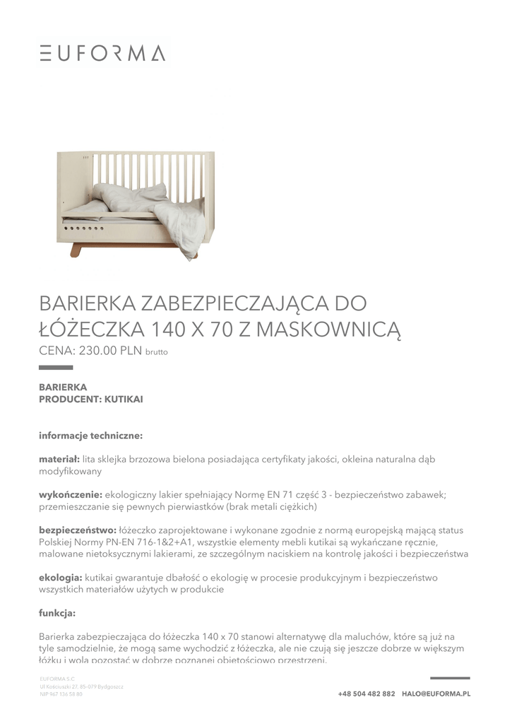 BARIERKA ZABEZPIECZAJĄCA DO ŁÓŻECZKA 140 X 70 Z MASKOWNICĄ CENA: 230.00 PLN brutto BARIERKA PRODUCENT: KUTIKAI informacje techniczne: materiał: lita sklejka brzozowa bielona posiadająca certyfikaty jakości, okleina naturalna dąb modyfikowany wykończenie: ekologiczny lakier spełniający Normę EN 71 część 3 - bezpieczeństwo zabawek; przemieszczanie się pewnych pierwiastków (brak metali ciężkich) bezpieczeństwo: łóżeczko zaprojektowane i wykonane zgodnie z normą europejską mającą status Polskiej Normy PN-EN 716-1&2+A1, wszystkie elementy mebli kutikai są wykańczane ręcznie, malowane nietoksycznymi lakierami, ze szczególnym naciskiem na kontrolę jakości i bezpieczeństwa ekologia: kutikai gwarantuje dbałość o ekologię w procesie produkcyjnym i bezpieczeństwo wszystkich materiałów użytych w produkcie funkcja: Barierka zabezpieczająca do łóżeczka 140 x 70 stanowi alternatywę dla maluchów, które są już na tyle samodzielnie, że mogą same wychodzić z łóżeczka, ale nie czują się jeszcze dobrze w większym łóżku i wolą pozostać w dobrze poznanej objętościowo przestrzeni. Łatwy montaż pozwala na szybką zmianę – po wyjęciu dowolnej z barierek łóżeczka należy przykręcić blendę maskującą materac wraz z barierką chroniącą przed wypadnięciem dziecka podczas snu. wzornictwo: Linia z dziurką zaprojektowana przez Kutikai charakteryzuje się prostą formą, którą urozmaica motyw przewodni – dziurka. Sprawia, że dzieci zaciekawione znajomym kształtem otworu chętnie sprawdzają, co jest z drugiej strony czy bawią się w „a kuku”. Proste, bezpieczne i funkcjonalne, o solidnej konstrukcji, wykonywane w rodzinnej stolarni na południu Polski pod ścisłą kontrolą projektantów Dodatkowym akcentem są charakterystyczne dla tej kolekcji nóżki fornirowane okleiną naturalną – dębem modyfikowanym. Nadają one wyjątkowej lekkości. wymiary (cm): szerokość: 110 głębokość: 2 wysokość: 9 kolor brzoza naturalna bielona/dąb naturalny Czas oczekiwania ok.: 4 tygodnie Powered by TCPDF (www.tcpdf.org)
