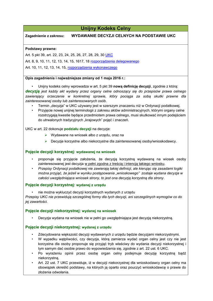 Unijny Kodeks Celny Zagadnienie z zakresu: WYDAWANIE DECYZJI CELNYCH NA PODSTAWIE UKC Podstawy prawne: Art. 5 pkt 39, art. 22, 23, 24, 25, 26, 27, 28, 29, 30 UKC Art. 8, 9, 10, 11, 12, 13, 14, 15, 1617, 18 rozporządzenia delegowanego Art. 10, 11, 12, 13, 14, 15, rozporządzenia wykonawczego Opis zagadnienia i najważniejsze zmiany od 1 maja 2016 r.: • Unijny kodeks celny wprowadza w art. 5 pkt 39 nową definicję decyzji, zgodnie z którą: decyzją jest każdy akt wydany przez organy celne odnoszący się do przepisów prawa celnego zawierający orzeczenie w konkretnej sprawie, który pociąga za sobą skutki prawne dla zainteresowanej osoby lub zainteresowanych osób. • Termin „decyzja” w UKC używany jest w szerszym znaczeniu niż w Ordynacji podatkowej. • Przyjęcie nowej unijnej terminologii z zakresu aktów administracyjnych, którymi organy celne rozstrzygają kwestie będące przedmiotem prawa celnego, musi skutkować innym podejściem do utrwalonych tradycyjnych „krajowych” pojęć i znaczeń. UKC w art. 22 dokonuje podziału decyzji na decyzje: Wydawane na wniosek albo z urzędu, oraz na Decyzje korzystne albo niekorzystne dla zainteresowanej osoby/wnioskodawcy. Pojęcie decyzji korzystnej: wydawanej na wniosek • • proponuje się przyjęcie założenia, że decyzją korzystną wydawaną na wiosek osoby zainteresowanej jest decyzja w pełni zgodna z treścią i intencją takiego wniosku. Przepisy Ordynacji podatkowej nie zawierają takiej definicji, ale kierując się zasadami logiki można przyjąć, że jeżeli w wyniku postępowania „wnioskowego” zostaje wydana decyzja w całości uwzględniająca wniosek strony, to jest ona decyzją korzystną dla strony. Pojęcie decyzji korzystnej: wydanej z urzędu • nie można wykluczyć decyzji korzystnych wydanych z urzędu Przepisy UKC nie przewidują szczególnej formy dla tych decyzji, ani szczególnych wymogów co do jej zawartości. Pojęcie decyzji niekorzystnej: wydanej na wniosek • Decyzja wydana na wniosek nie w pełni go uwzględniająca jest decyzją niekorzystną. Pojęcie decyzji niekorzystnej: wydanej z urzędu • • • • Zdecydowana większość decyzji wydawanych z urzędu będzie decyzjami niekorzystnymi. W wypadku wątpliwości, czy decyzja, którą zamierza wydać organ celny jest czy nie jest korzystna dla osoby proponuje się przyjąć tryb właściwy do wydania decyzji niekorzystnej i tym samym dać osobie prawo do wypowiedzenia się, zgodnie z art. 22 ust. 6 UKC. Po wyrażeniu opinii przez osobę organ celny podejmuje decyzję korzystną bądź niekorzystną. Art. 22 ust. 7 UKC przewiduje, iż w decyzji niekorzystnej dla wnioskodawcy organ celny ma obowiązek określić podstawy, na których ją oparto oraz pouczyć wnioskodawcę o prawie do złożenia odwołania. • • • • W decyzji niekorzystnej organ celny (wzorem dzisiejszych wymogów) winien również zawrzeć uzasadnienie faktyczne i prawne swojego rozstrzygnięcia. Tylko dla trybu wydawania decyzji niekorzystnej UKC przewidziało konieczność zastosowania nowej na gruncie „krajowej” procedury instytucji „prawa do wysłuchania”. Art. 22 ust. 6 stanowi, iż organ celny przed wydaniem decyzji niekorzystnej, ma obowiązek powiadomić wnioskodawcę o podstawach, na których chce oprzeć swoje rozstrzygnięcie, dając jednocześnie wnioskodawcy możliwość przedstawienia swojego stanowiska (w terminie 30 dni). „Prawo do wysłuchania” to uprawnienie gwarantujące wnioskodawcy możliwość nie tylko zapoznania się ze stanowiskiem organu, ale także zaprezentowania swoich argumentów i przekonania organu do swojego sposobu rozwiązania sprawy. Przedłużanie terminów proceduralnych: • • • • • • maksymalnie o 30 dni - jeżeli organy celne nie mogą dotrzymać terminu, powiadomienie wnioskodawcy przed terminem z podaniem przyczyn (art. 22 ust. 3 akapit drugi UKC); na wniosek wnioskodawcy, (również maksymalnie o 30 dni) aby dostosować się do warunków i kryteriów (art. 22 ust. 3 akapit trzeci UKC); po przyjęciu wniosku organ celny może zwrócić się o dostarczenie dodatkowych informacji w terminie maksymalnie o 30 dni – termin na wydanie decyzji przedłuża się o ten okres (art. 13 ust. 1 rozporządzenia delegowanego) + konieczność poinformowania wnioskodawcy; jeżeli ma zastosowanie prawo do wysłuchania - termin na wydanie decyzji przedłuża się o 30 dni + konieczność poinformowania wnioskodawcy (art. 13 ust. 2 rozporządzenia delegowanego); przedłużenie terminu konsultacji z innym organem celnym – przedłużenie o ten termin + konieczność poinformowania wnioskodawcy (art. 13 ust. 3 rozporządzenia delegowanego); maksymalnie o 9 miesięcy, jeżeli prowadzone jest dochodzenie (art. 13 ust. 4 rozporządzenia delegowanego). Decyzje z „urzędu”: • • • • • Zgodnie z art. 29 UKC – do decyzji wydawanych przez organ celny bez uprzedniego wniosku zainteresowanej osoby stosuje się zasadniczą część przepisów określających tryb wydawania decyzji na wniosek. Ustawodawca nie sprecyzował, poza odesłaniem do przepisów regulujących procedurę na wniosek, żadnych bardziej szczegółowych zasad i wymogów mających zastosowanie do procedowania „z urzędu”. To co stanowi istotną konsekwencję takiego sposobu uregulowania działania organu celnego „z urzędu” to przede wszystkim przyjęcie założenia, iż zainicjowanie takiego postępowania nie wymaga jego formalnego wszczęcia odrębnym aktem administracyjnym (tj. postanowieniem). Przyjęcie takiego założenia stanowi rezultat wcześniej opisanego podziału na decyzje korzystne i niekorzystne. Tylko bowiem w przypadku zamiaru wydania decyzji niekorzystnej istnieje obowiązek uprzedniego poinformowania przez organ celny zainteresowanej osoby o mającym nastąpić niekorzystnym dla niej rozporządzeniu. Takie poinformowanie przez organ celny osoby o zamiarze wydania decyzji niekorzystnej „z urzędu” spowodu